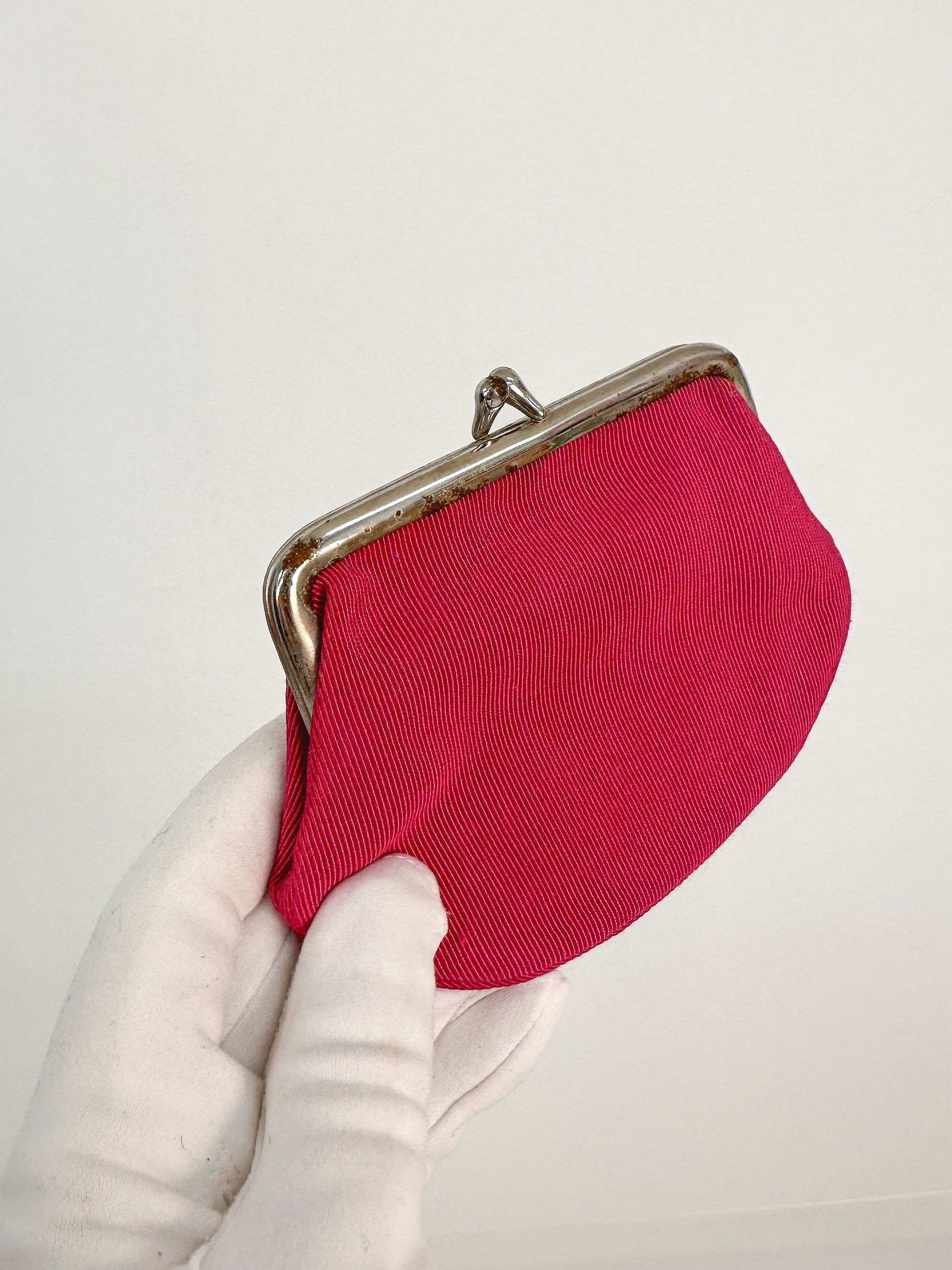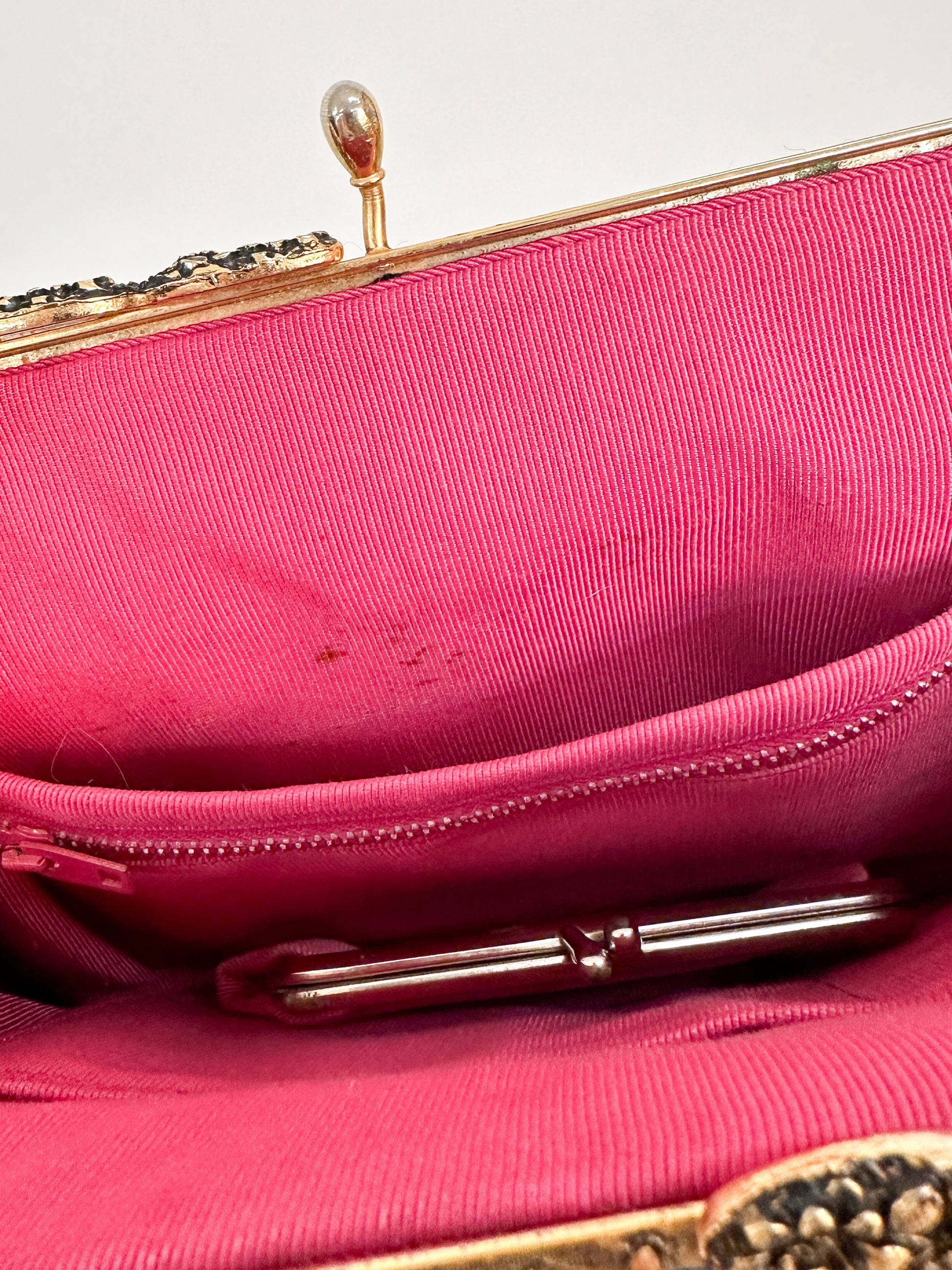 Condition: Good vintage condition, a couple of stitches are missing from the flowers, not noticeable but please see photos. The matching coin purse is a bit tarnished around the metal clasp which has left marks on the inside pocket.