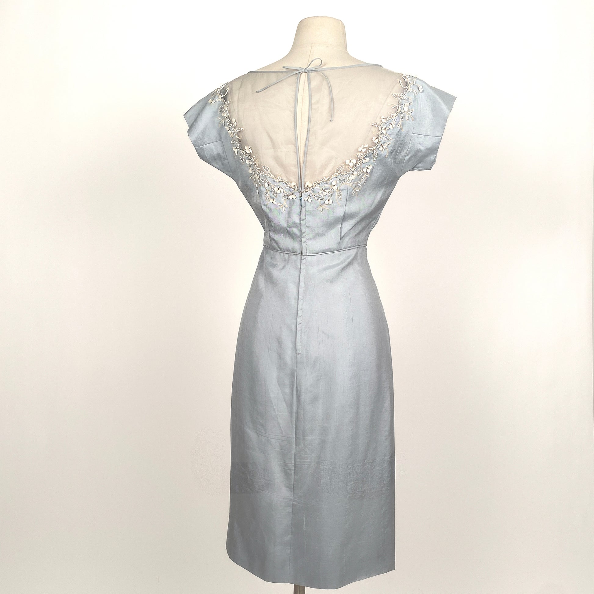 1950s powder blue shantung wiggle dress with sheer organza neckline. The neckline is adorned with flowers, beads, embroidery and sequins - the trim matches the patch pockets. The neckline ties in the back to create a keyhole. Back zipper and hook/eye closure.
