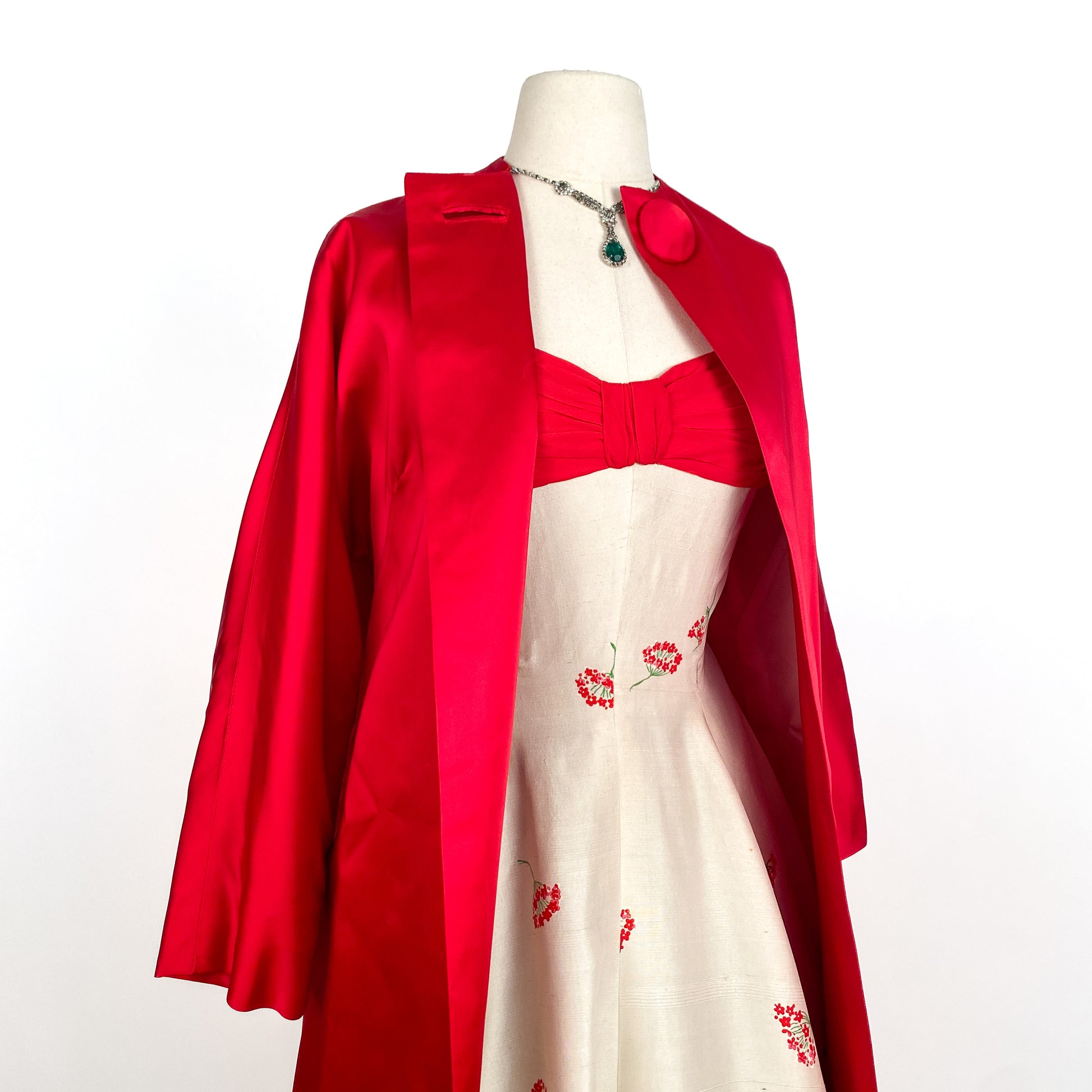 A fabulous 1950's red satin evening coat featuring a collarless neckline with a large covered button. A beautiful pink lining and open silhouette -- a beautiful holiday coat.