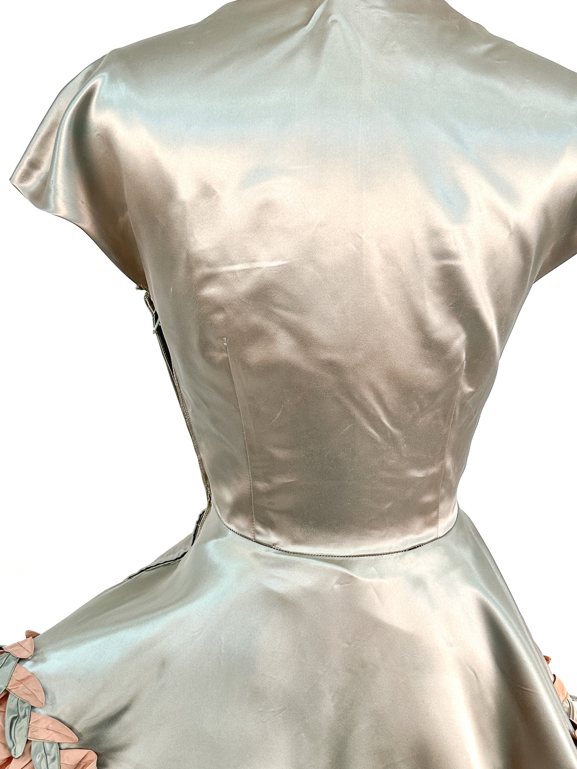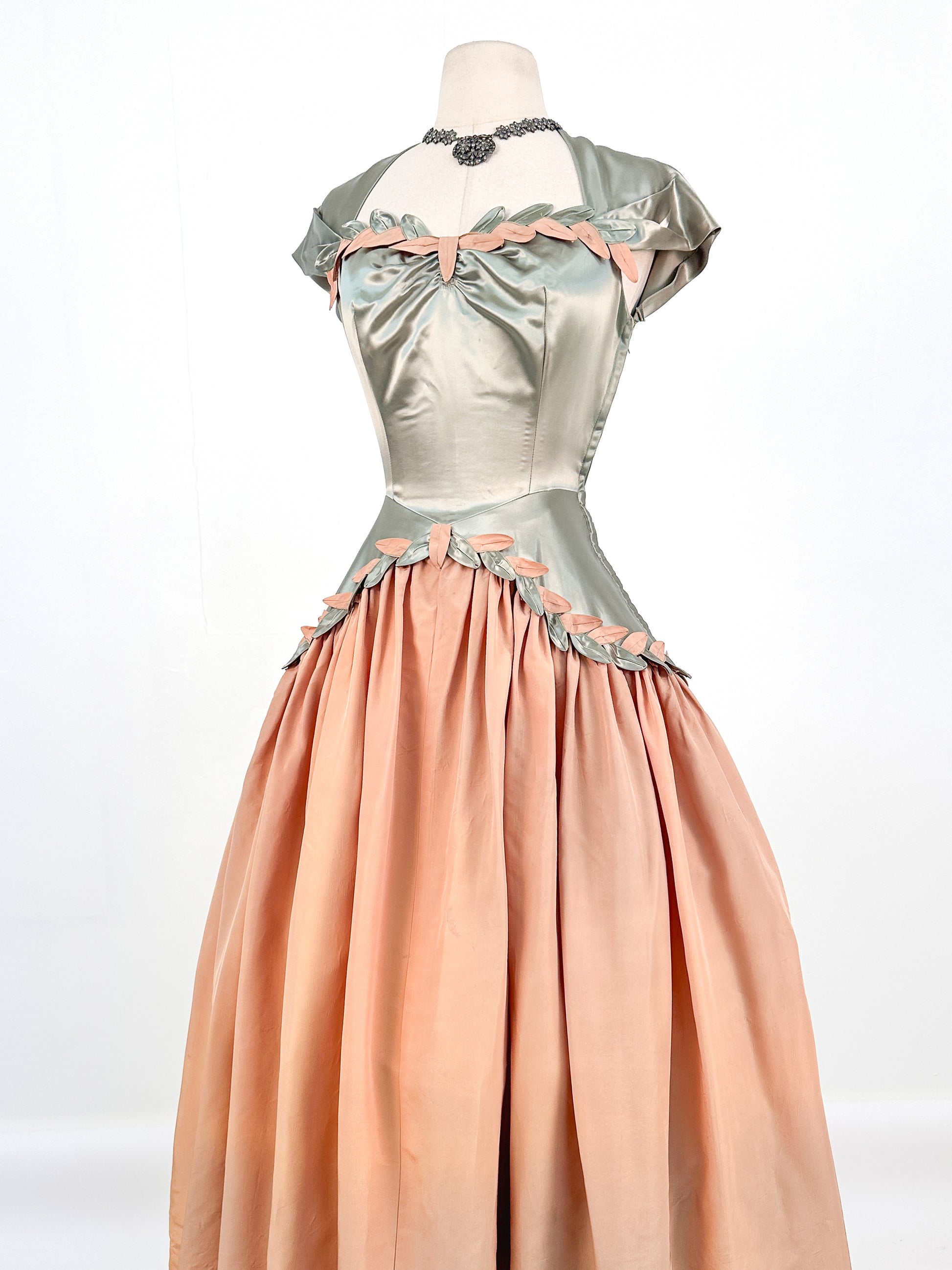 Drop dead glamorous late 1940s two-toned gown. The bodice is a gleaming sage slipper satin with a taupe faille fabric skirt. The bodice is trimmed in a cutout leaf pattern of the two fabrics around the neckline and waistline which dips down around the hips to create a glamorous high-end look. Made by Harry Keiser. Side zipper closure with hook/eye, has an extra piece of fabric as a zipper guard to protect the underarm area from the zipper.
