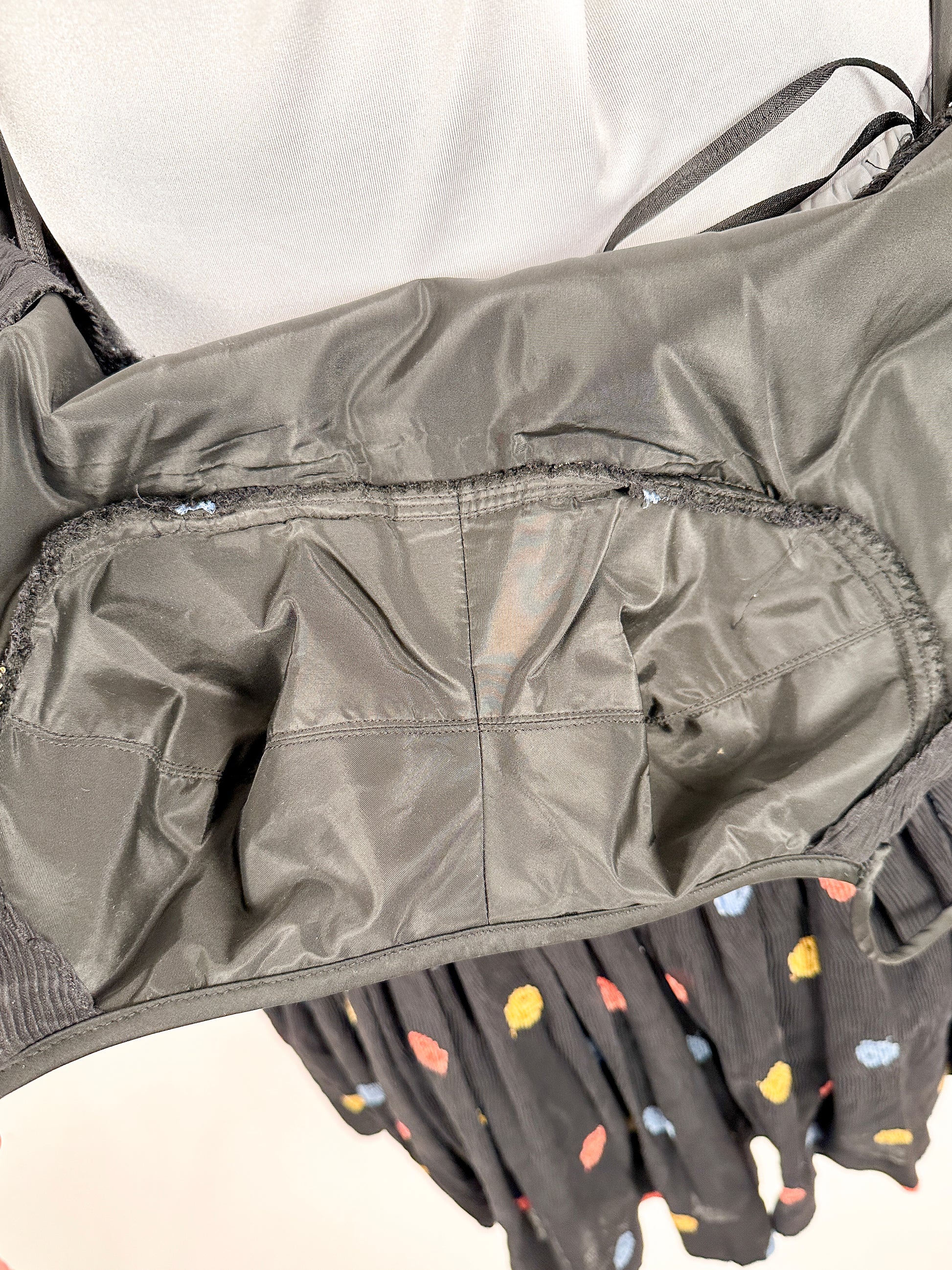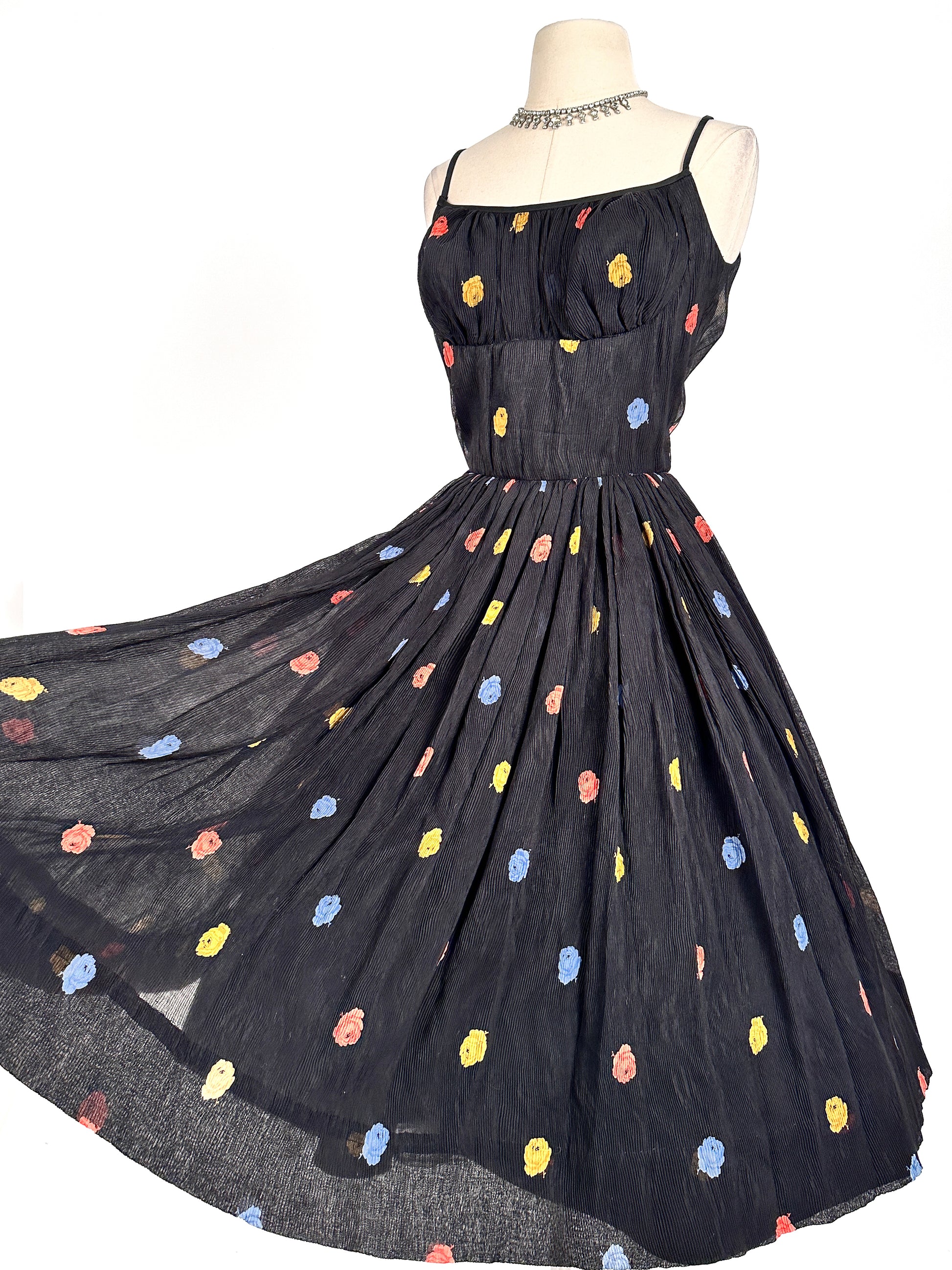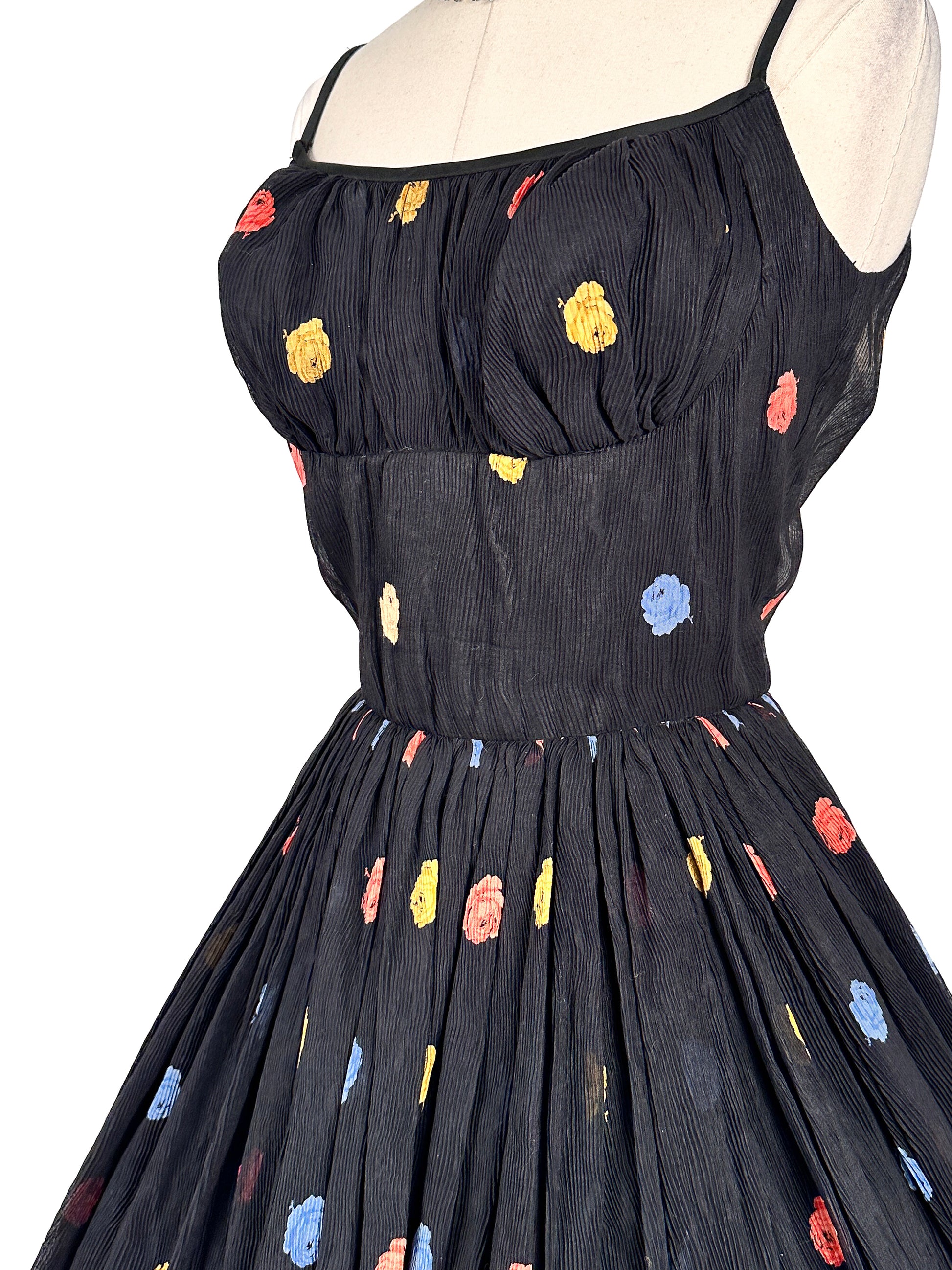 1950s charming fit & flare with multi-colored rose print. The bodice has a built-in bullet shaped bodice with thin satin straps. The neckline is trimmed in black satin. Thick satin blend lining with light chiffon like fabric with micro-pleated fabric and black zipper closure.