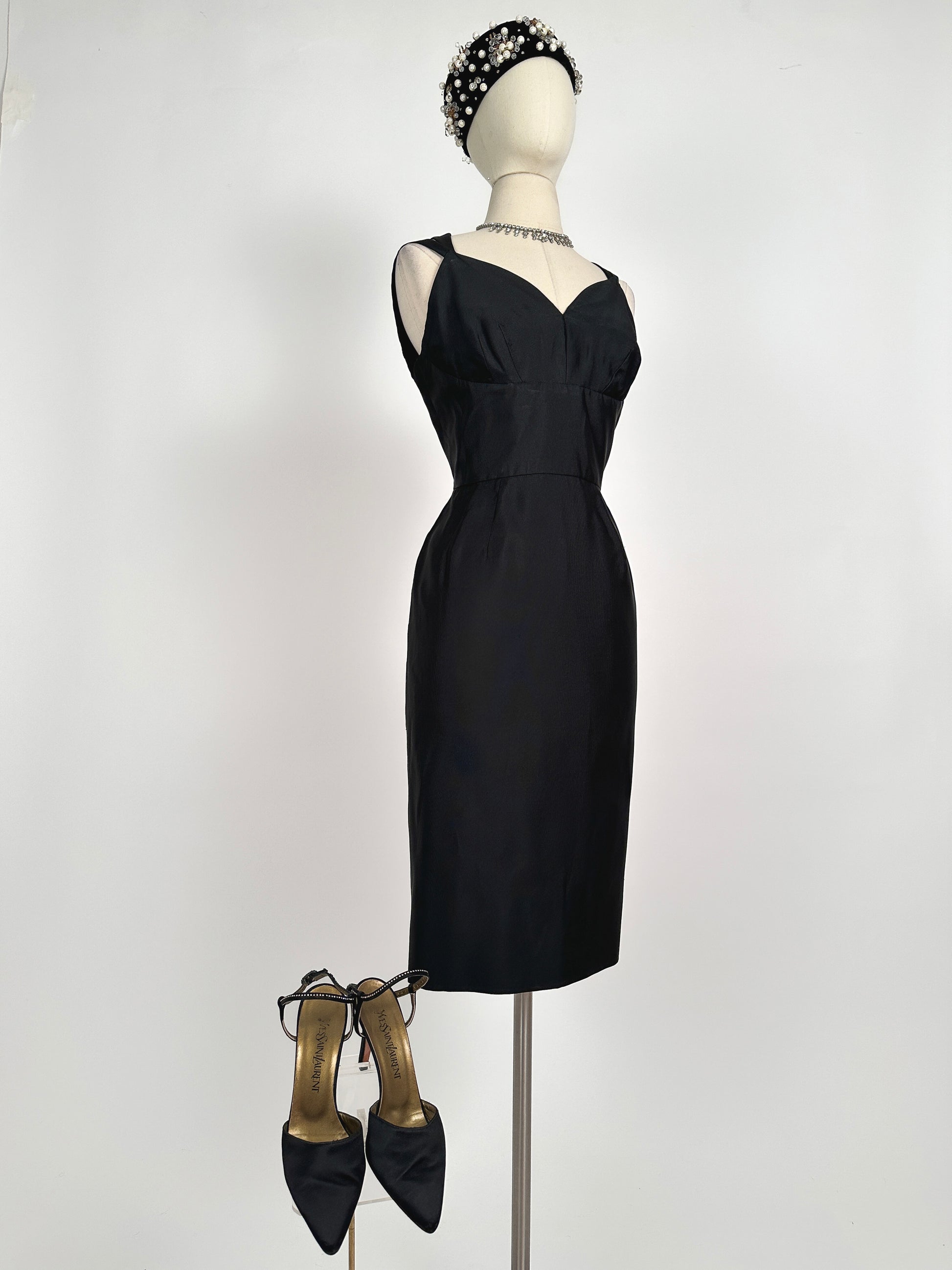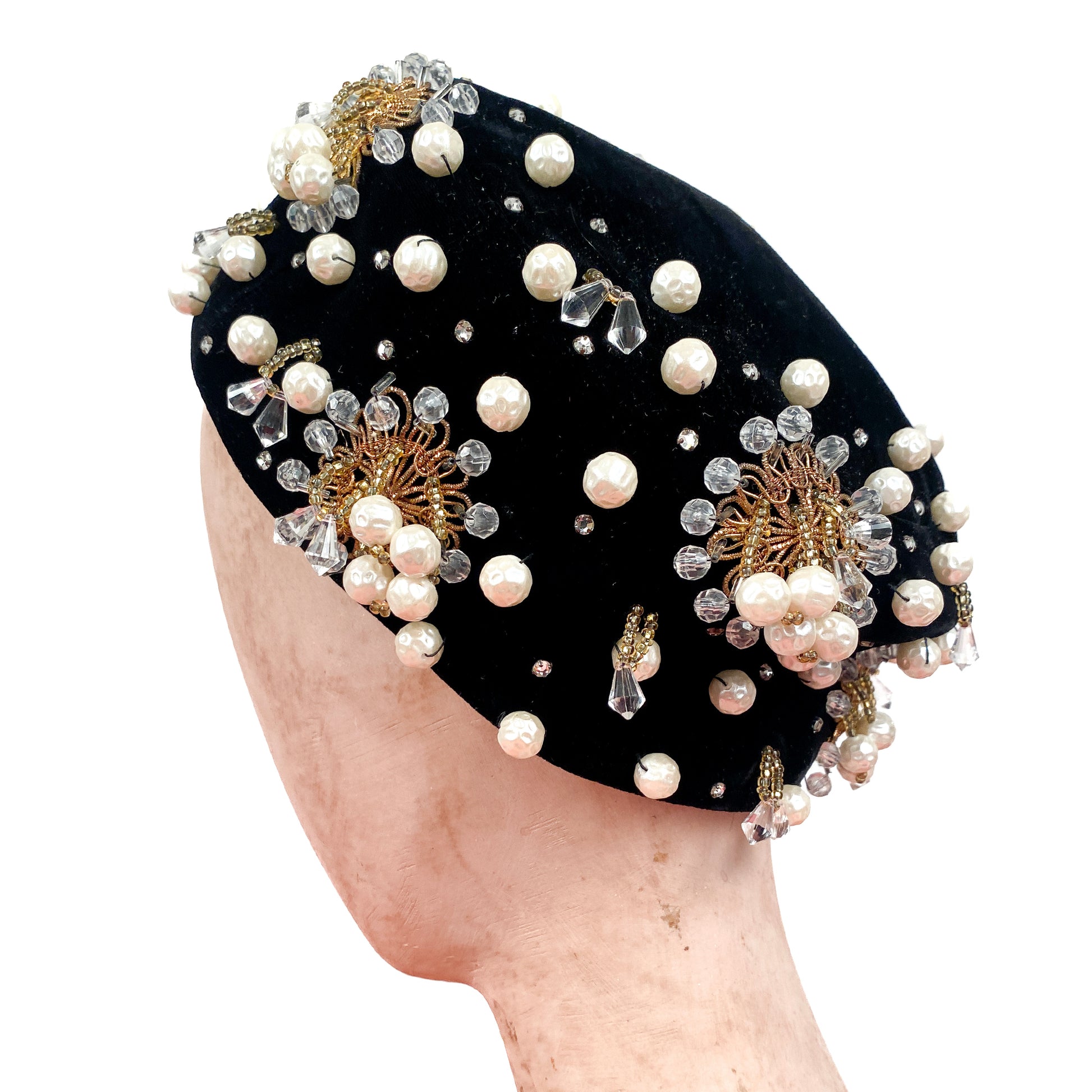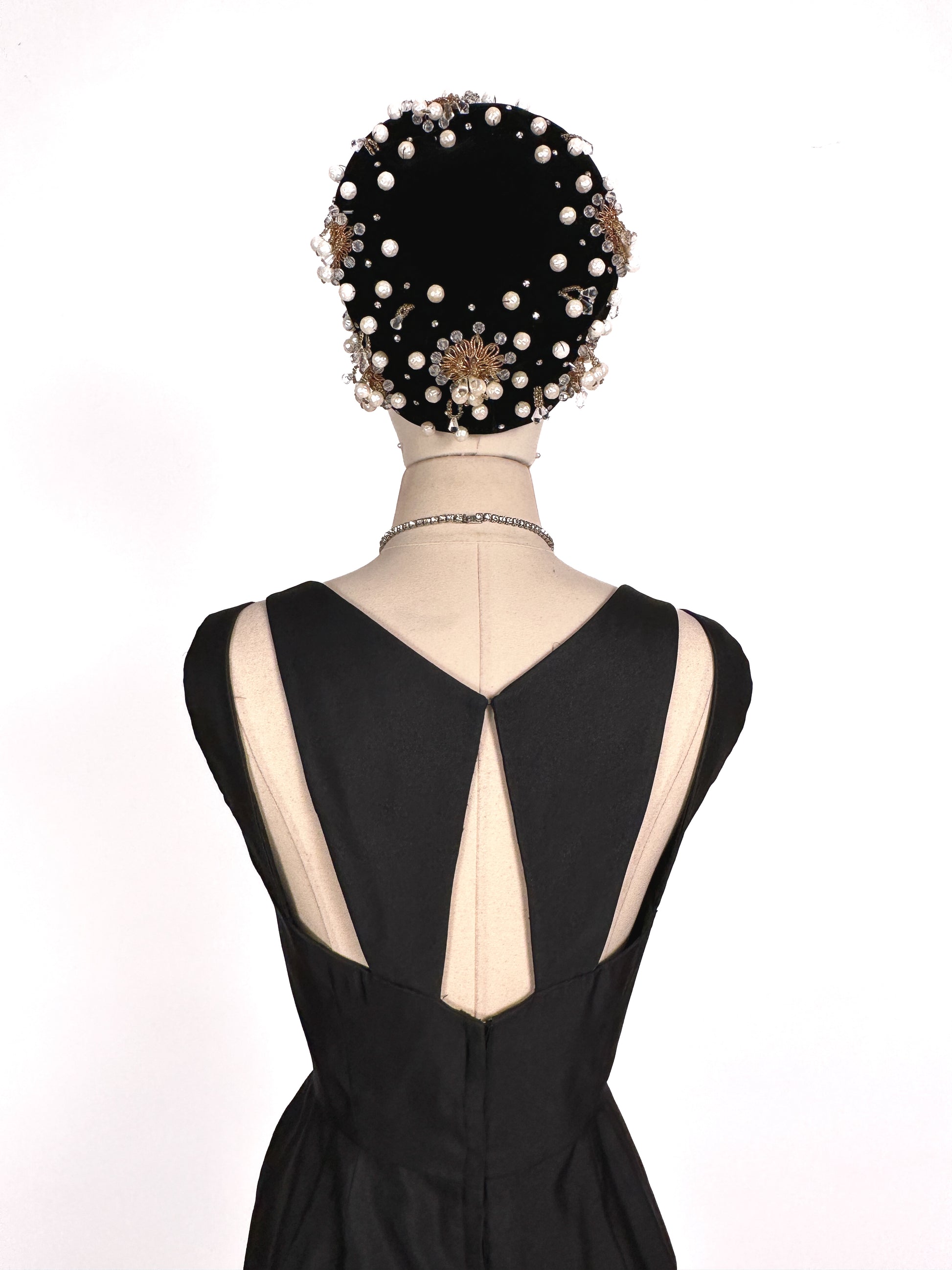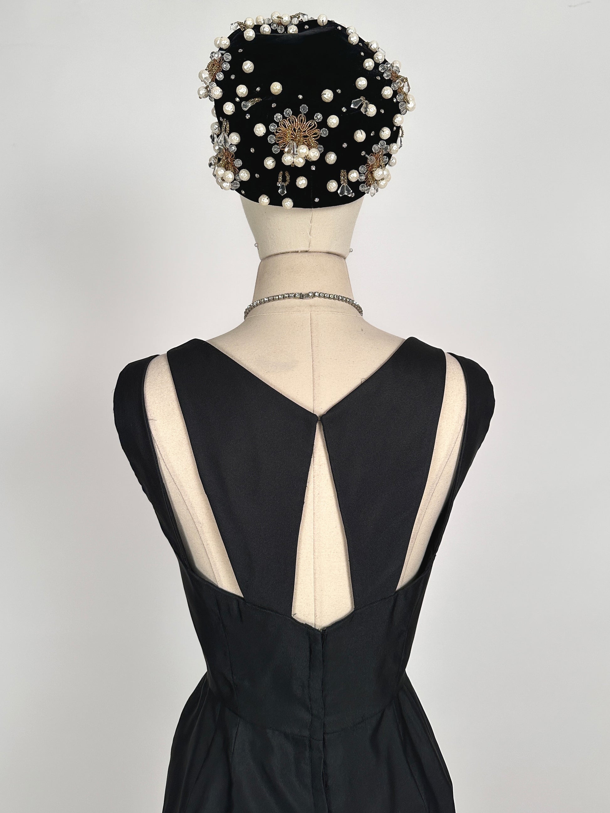 1950s Stunning Black Velvet Pearl, Rhinestone and Beaded Pillbox Hat/ One Size