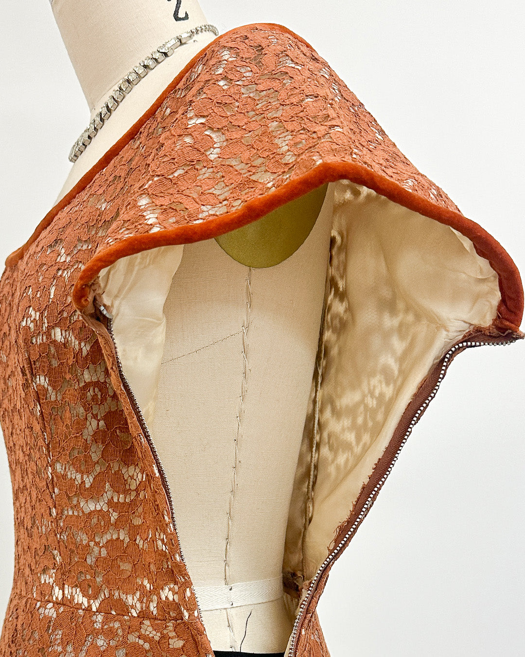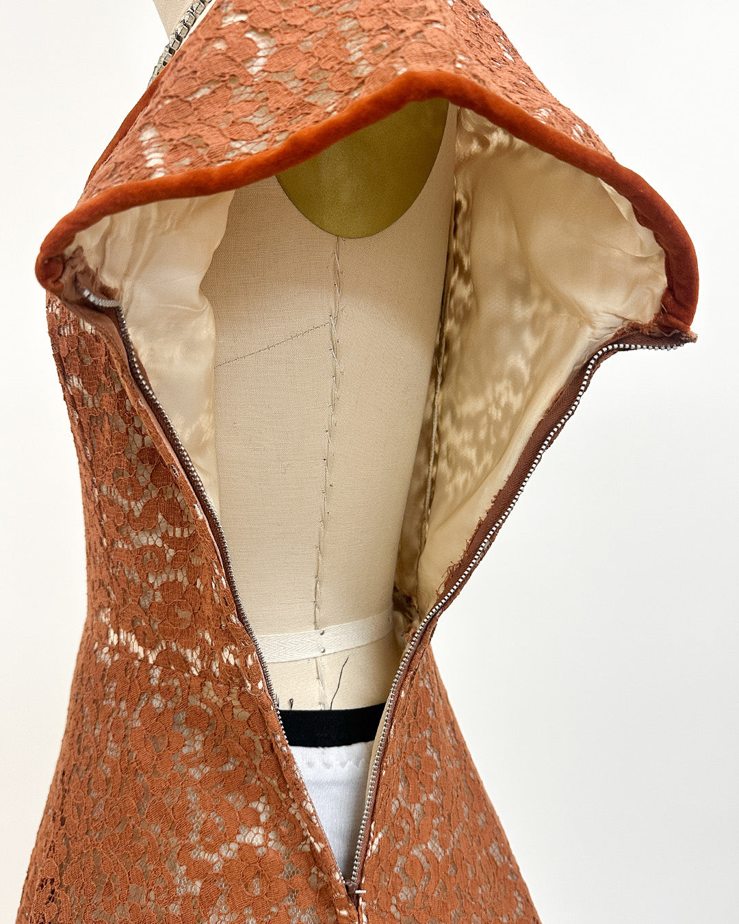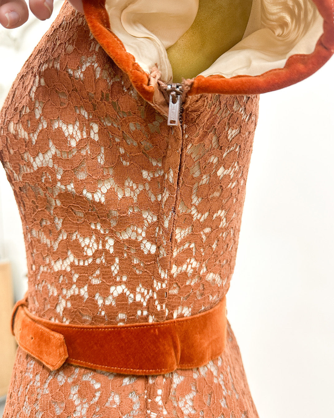 Golden autumn light, leaves crunching beneath your heels, and a 1950s silhouette made for strolling the Mall, The Central Park Glow Dress is a fit-and-flare ochre lace dream, accented with velvet trim and a matching belt to cinch the waist. Feminine, warm, and effortlessly elegant, it evokes the romance of crisp Manhattan afternoons and the quiet glamour of a city in fall. Perfect for gallery visits, parkside luncheons, or cocktail evenings overlooking the skyline.