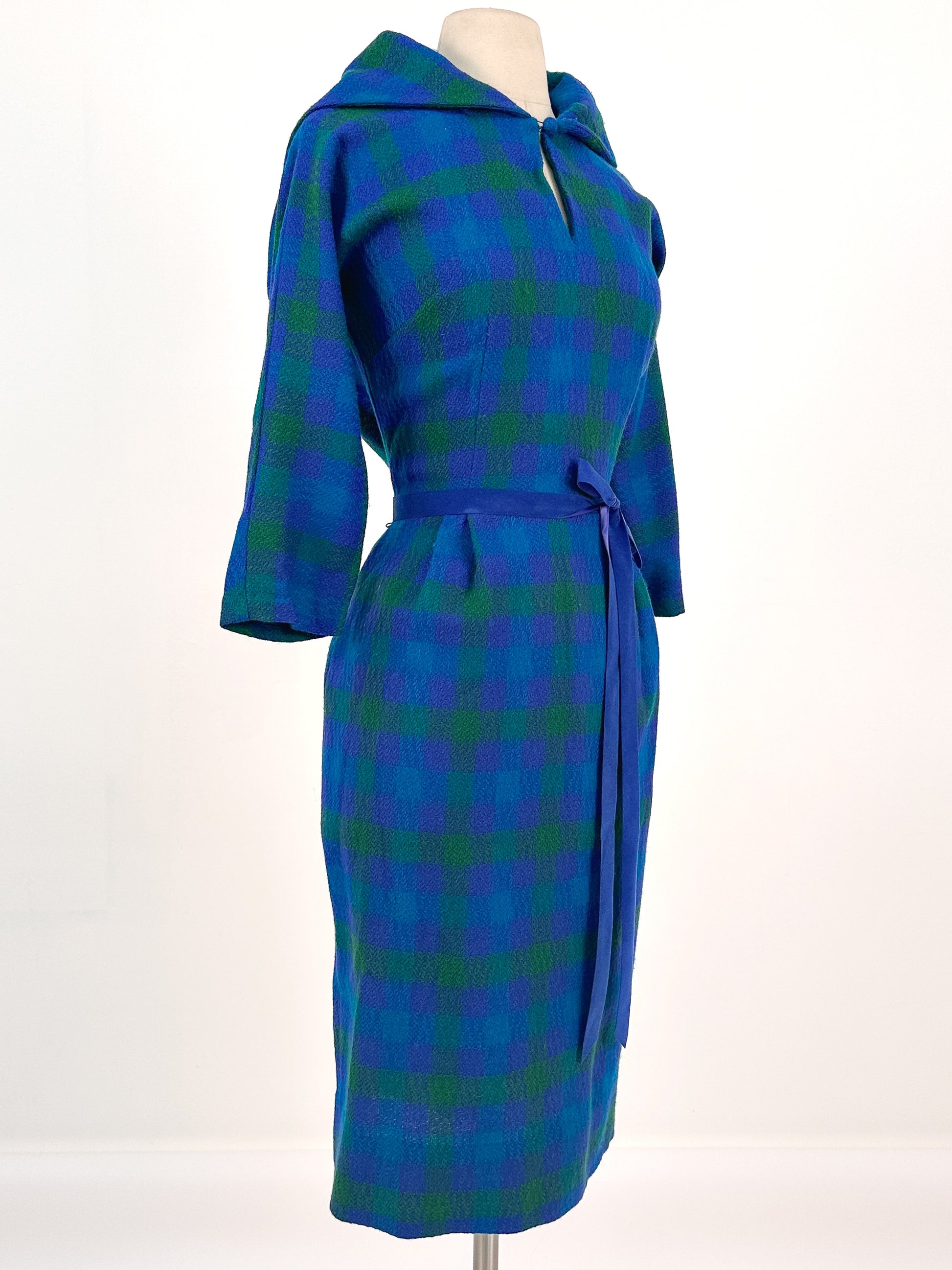 1950s Vibrant Plaid Wool Wiggle Dress / Waist 28