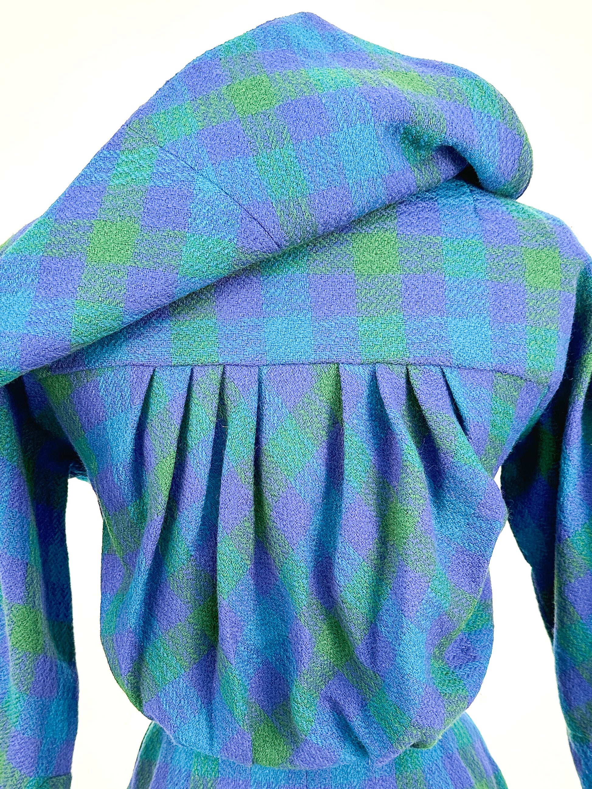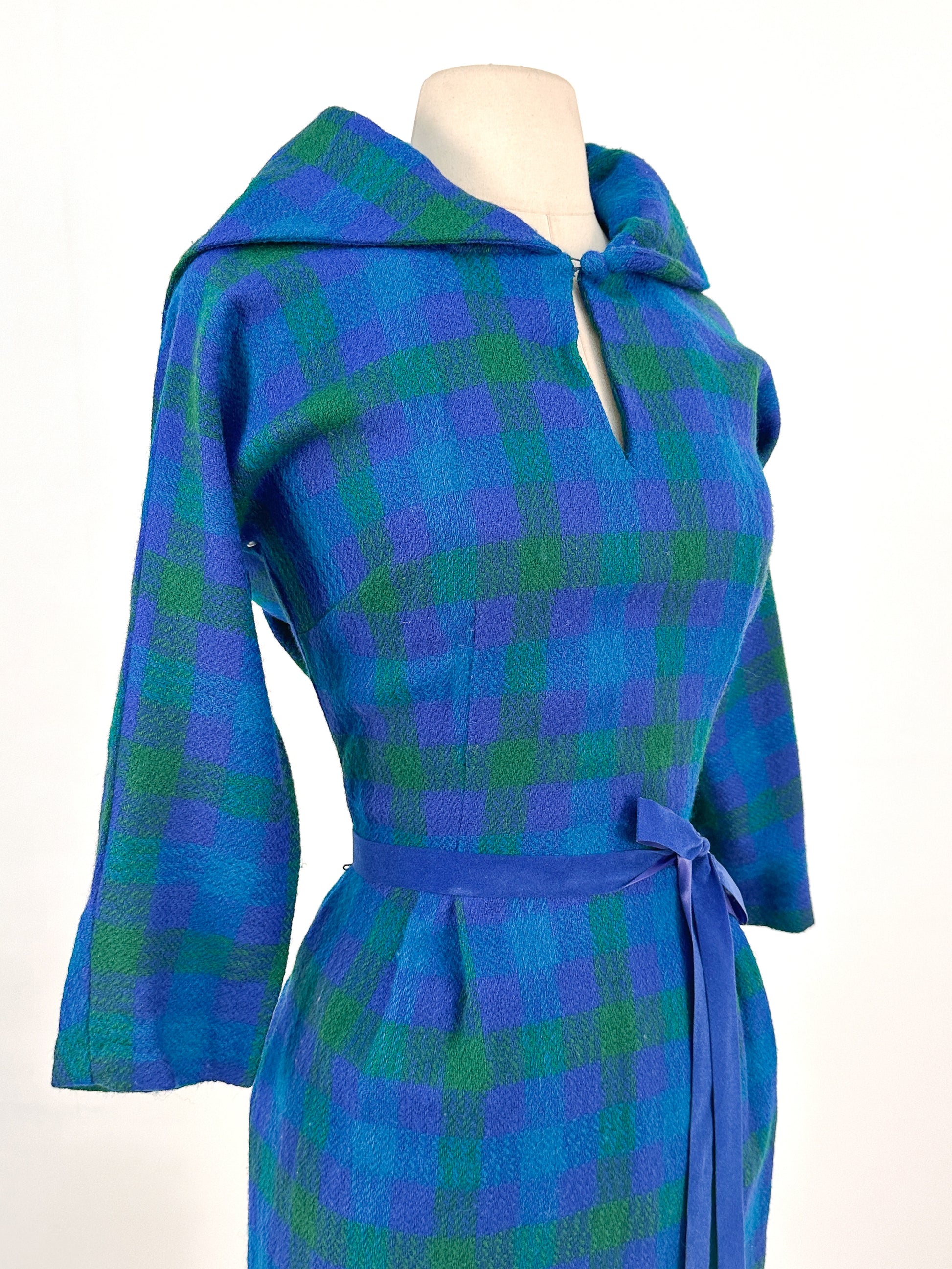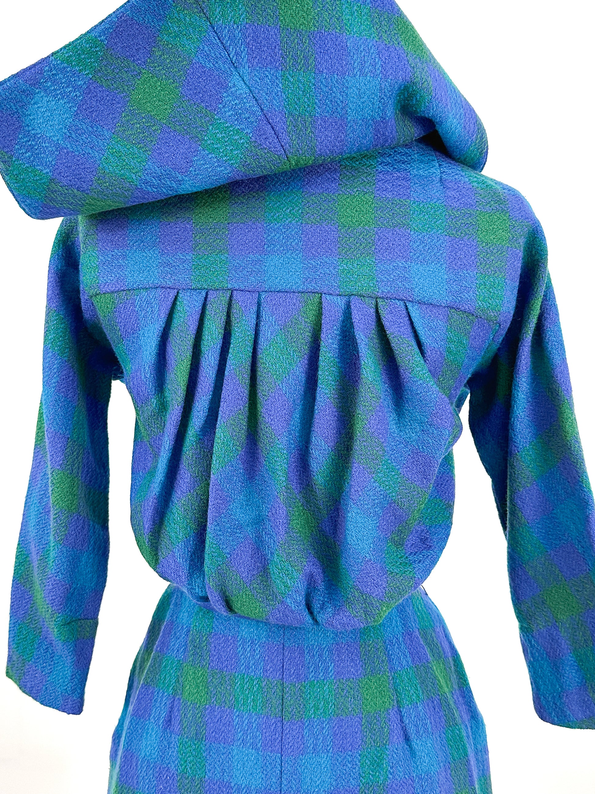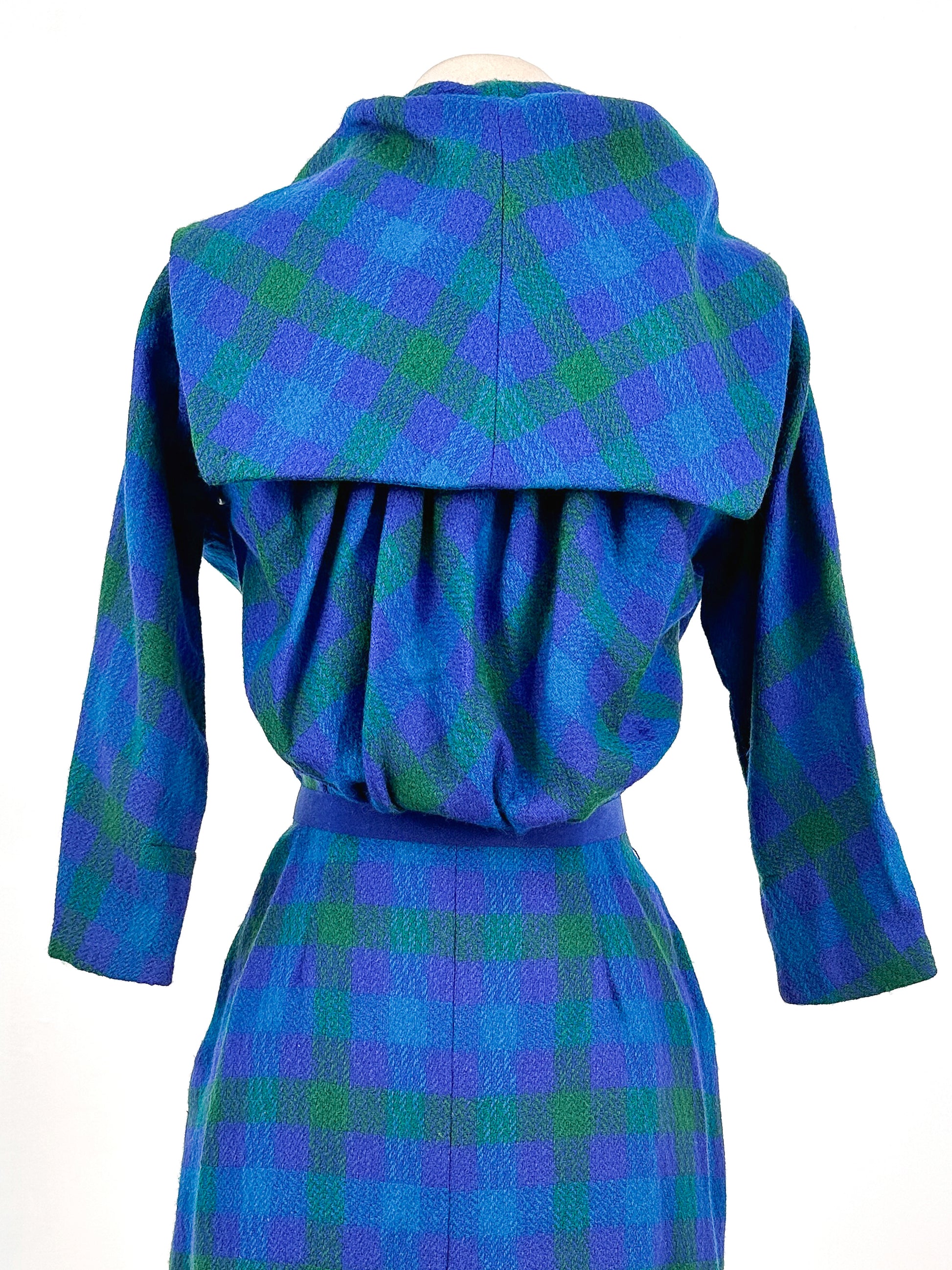The colors of this plaid wiggle dress are incredibly dreamy and vibrant! A gorgeous silhouette with 3/4 length sleeves, a keyhole neckline, with a fitted waist and pencil skirt. The back is my favorite part, with a sailor collar and pleated back added extra charm to this already beautiful dress. Side zipper closure, dress is not lined.