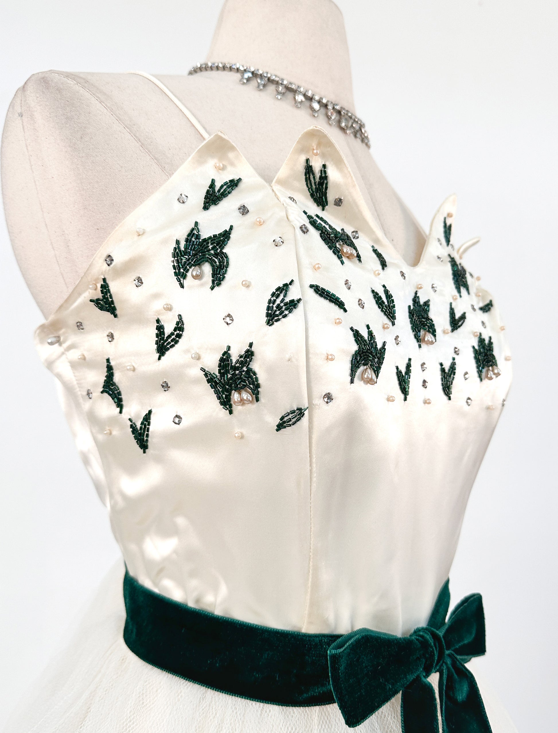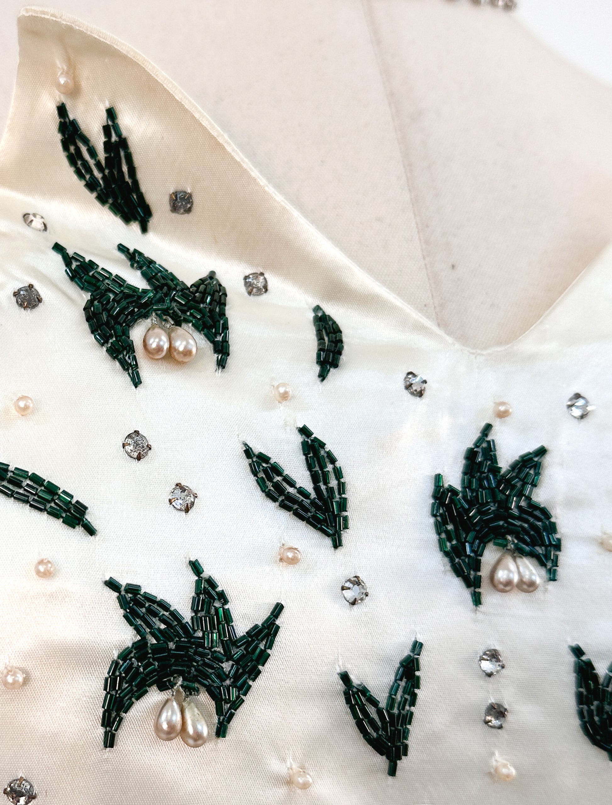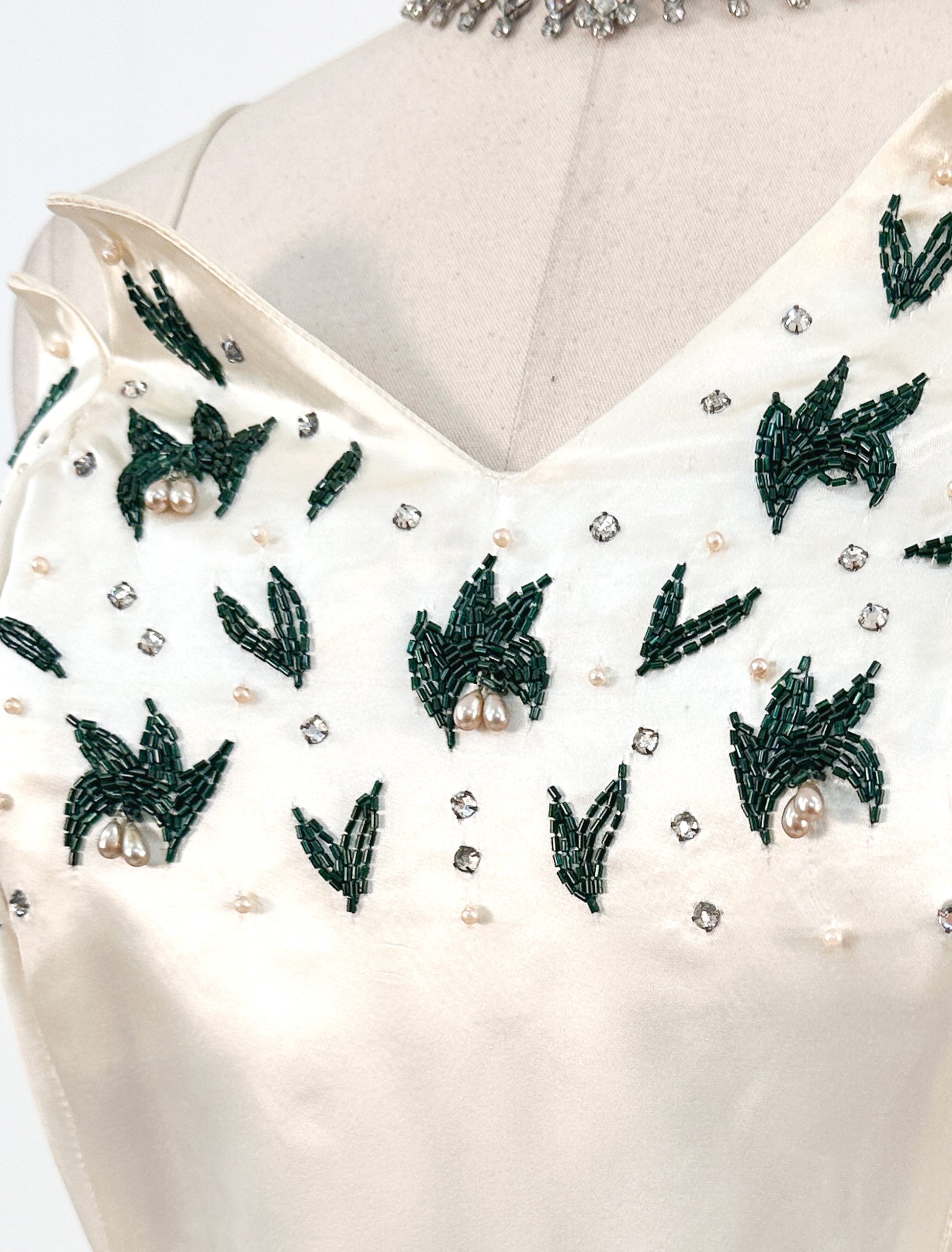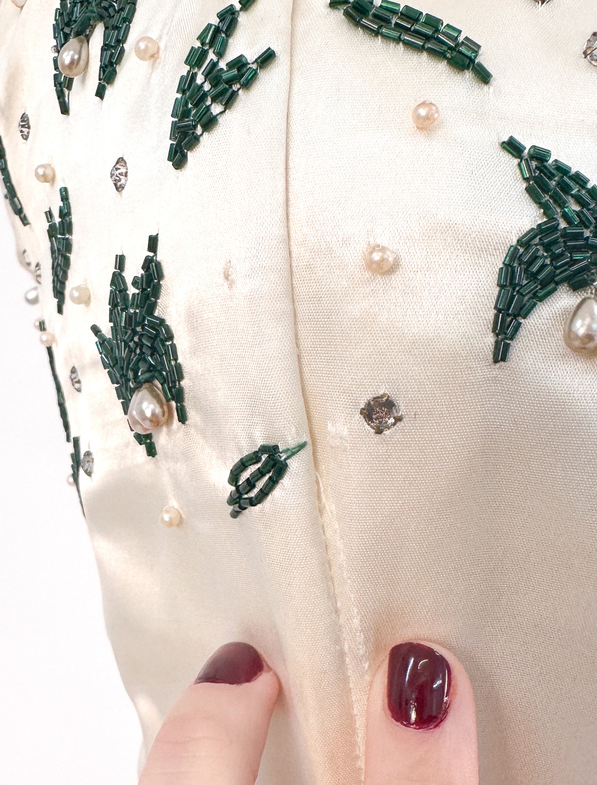 Experience vintage glamour in this show-stopping Emma Domb gown! With a unique neckline adorned with deep green beads, rhinestones and pearls. You'll captivate any crowd by making a statement in this dazzling gown for your next special occasion.