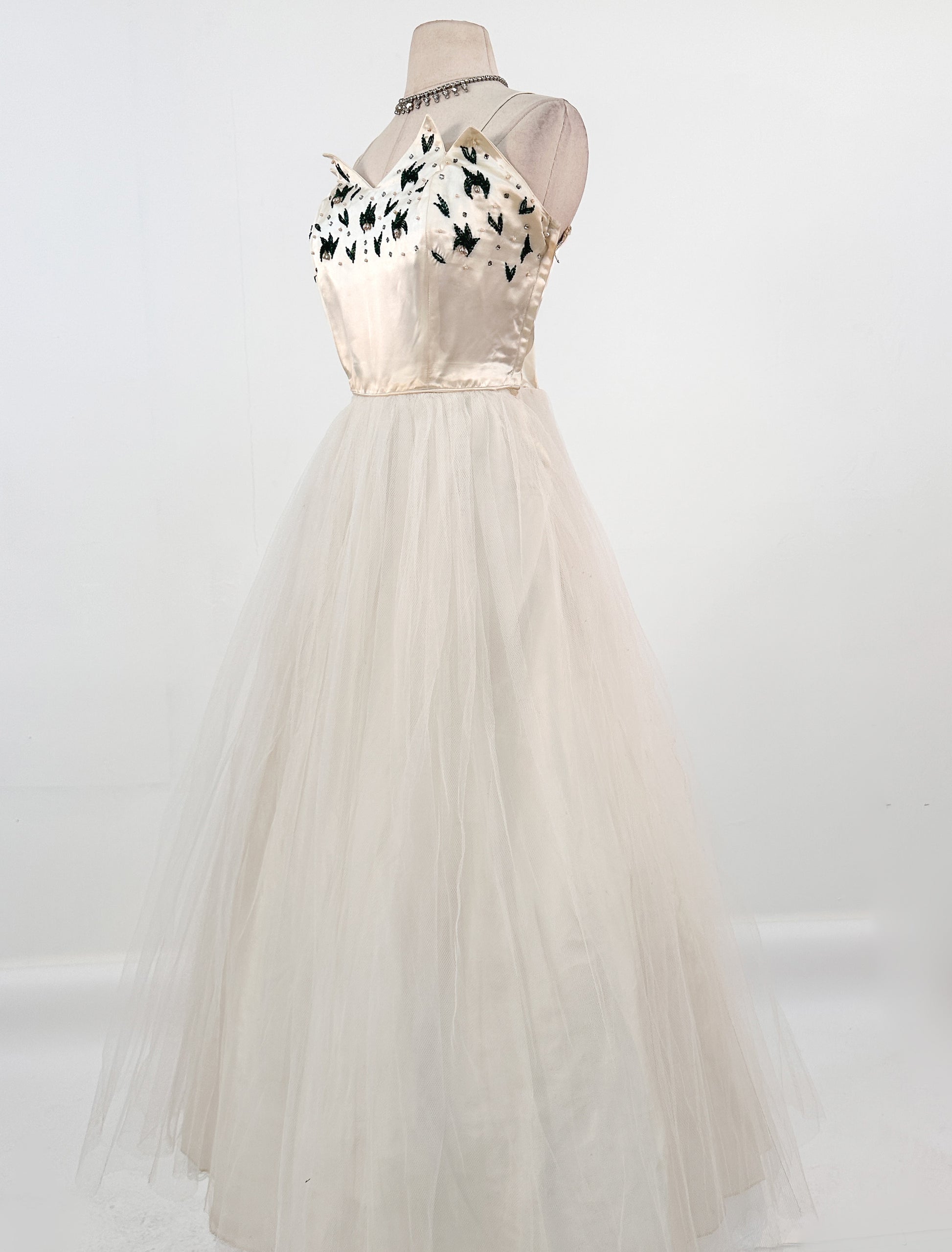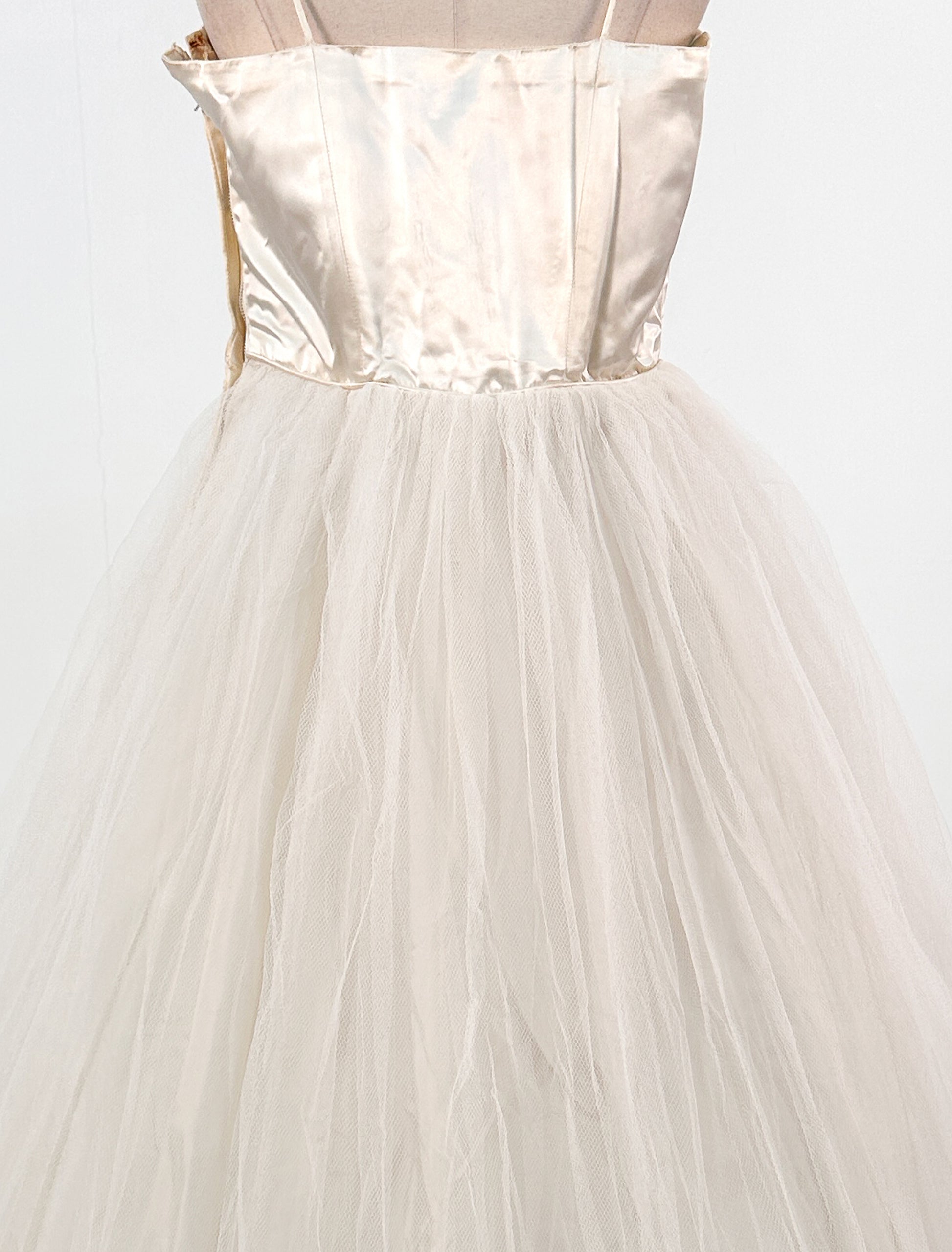 Condition: Very Good Vintage Condition, light wear to the bottom hem of the tulle from wear. Zipper is missing two 'teeth' but still zips up/down without issue.