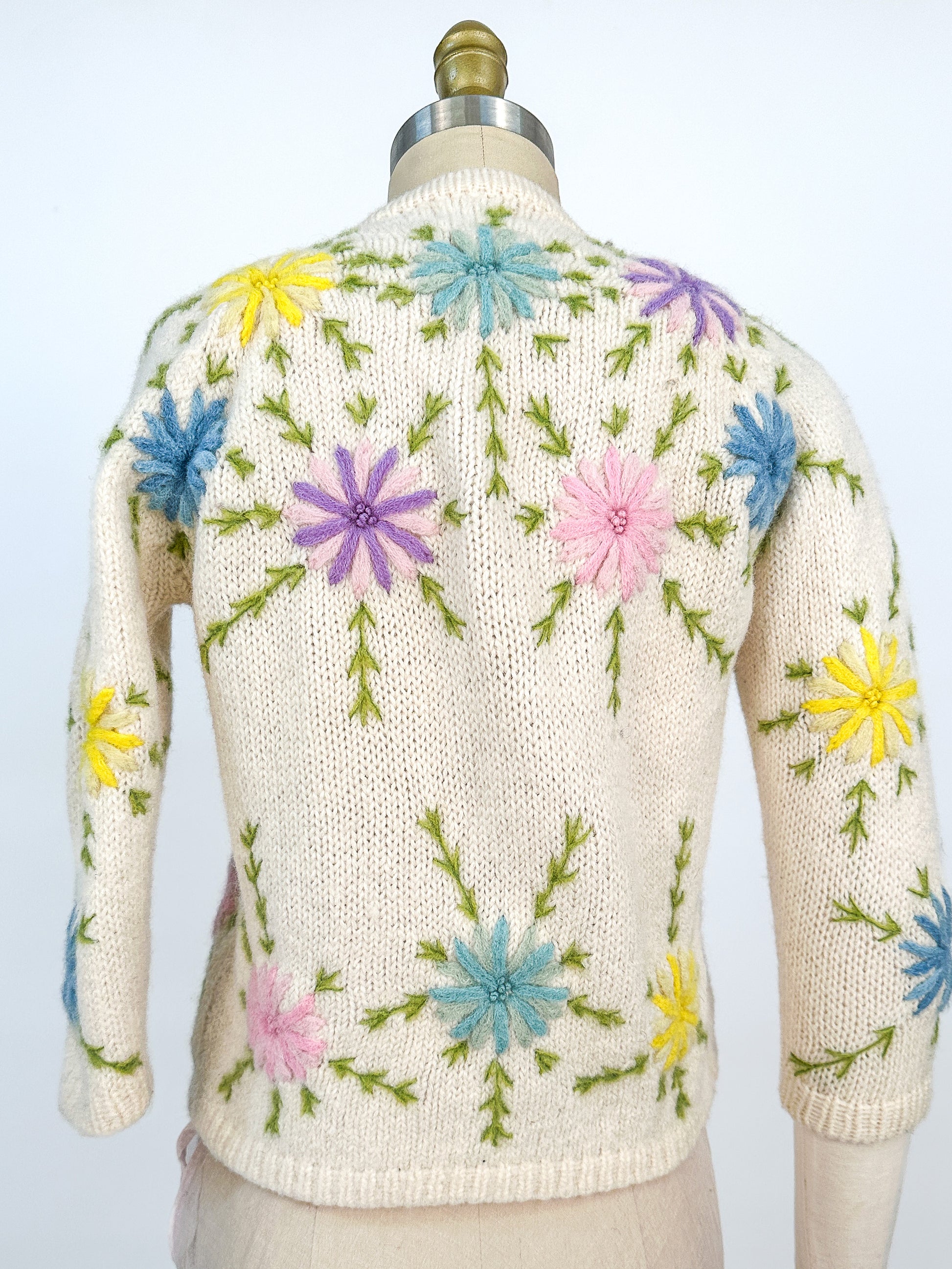 1950s White Wool Cardigan with Embroidered Flowers / Bust 32