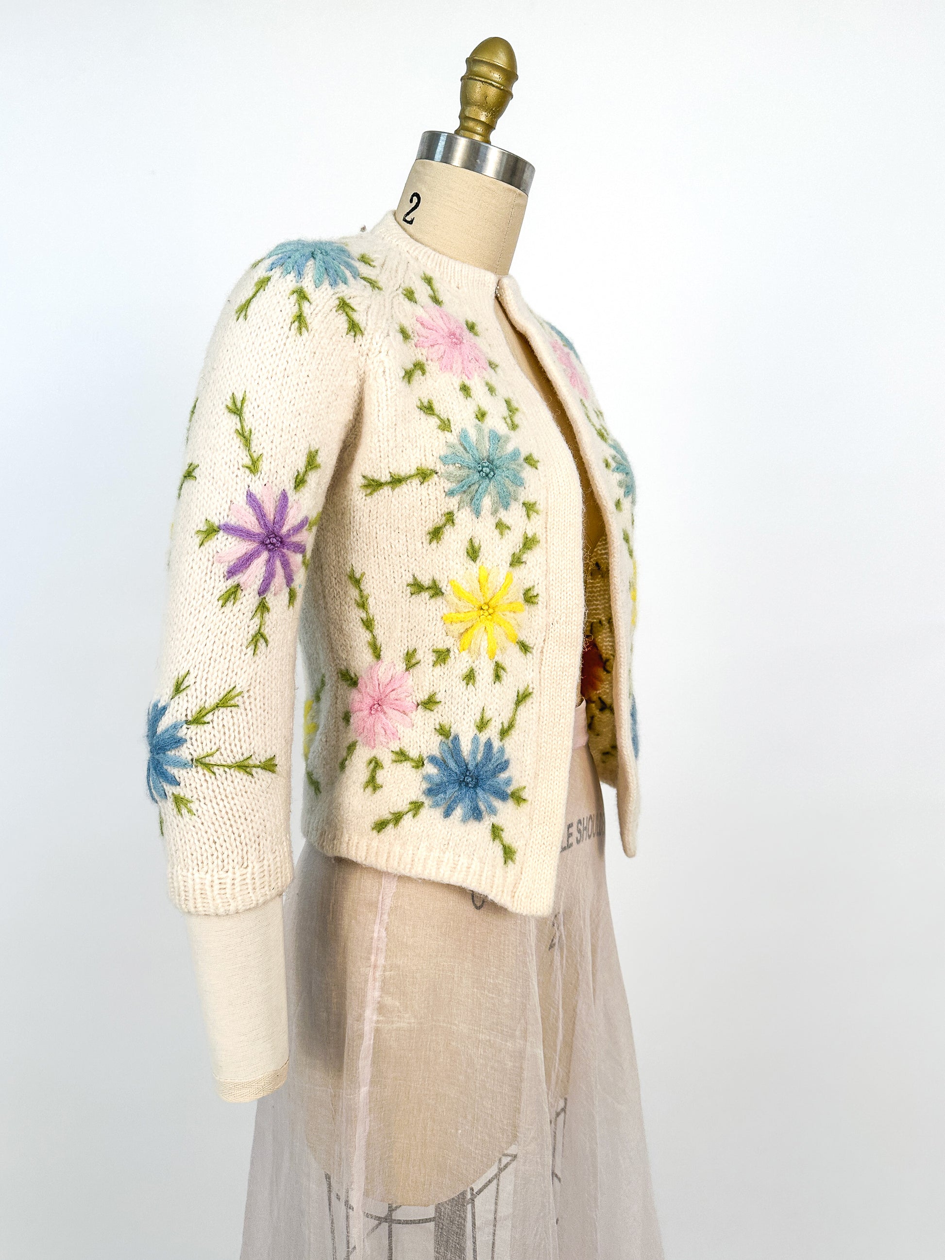 This mid-century 1950's cardigan sweater is composed of 100% wool knit and adorned with crewel embroidery yarn and feminine pastel flowers. A hook/eye closure at collar, ribbon not included.