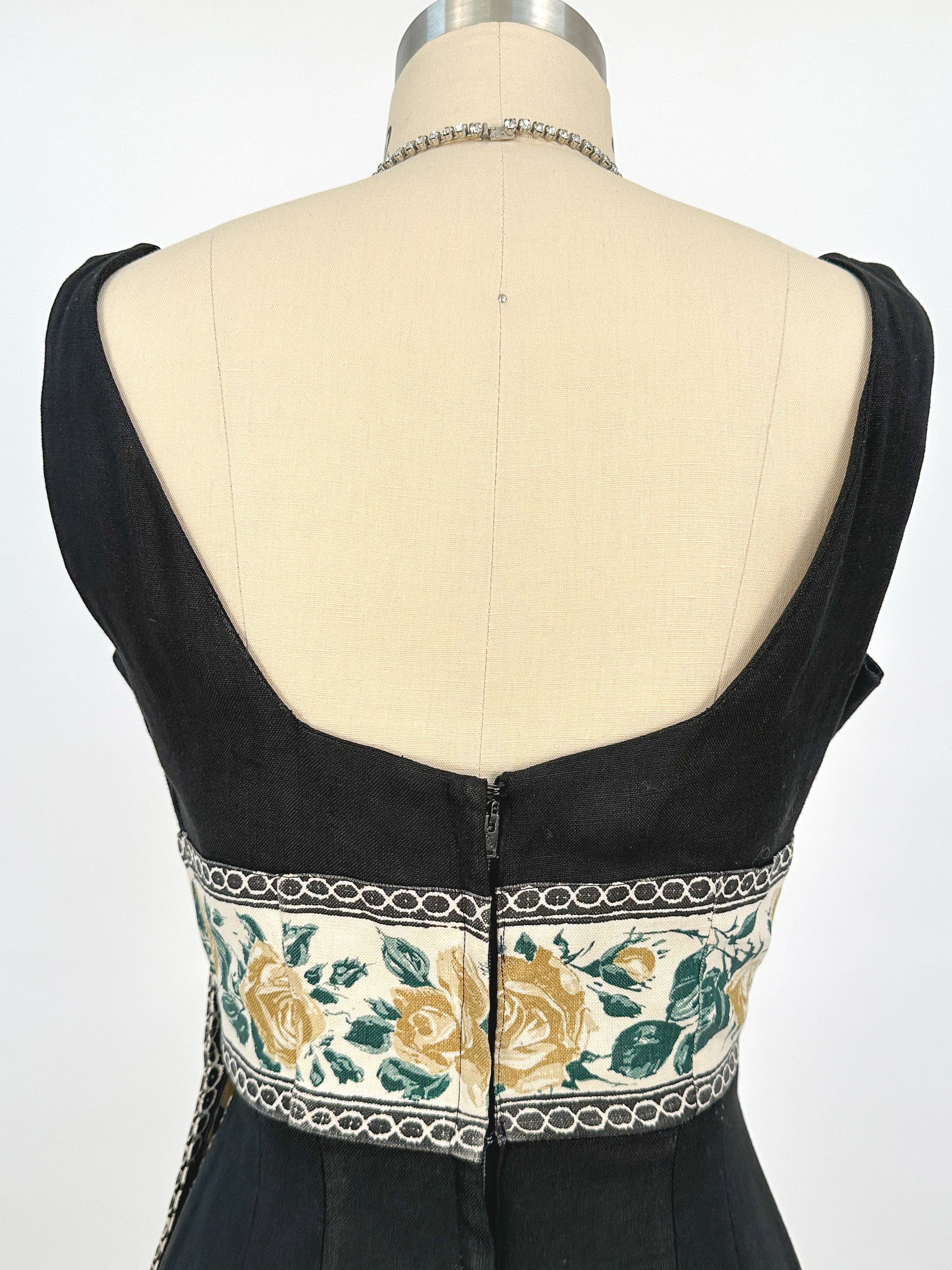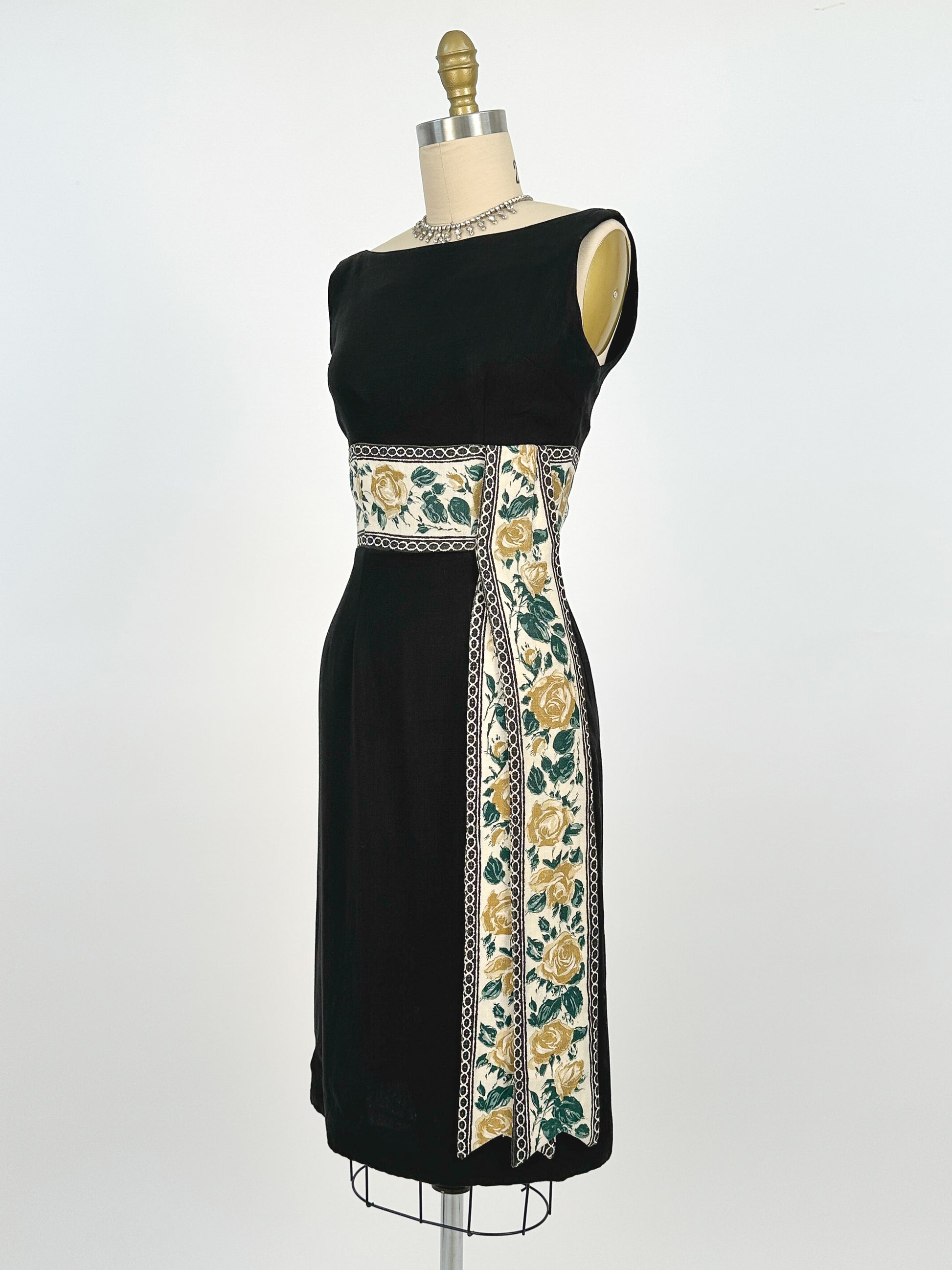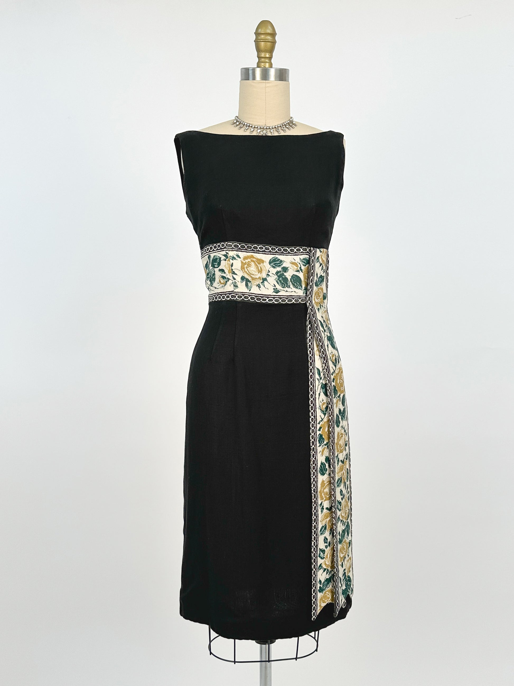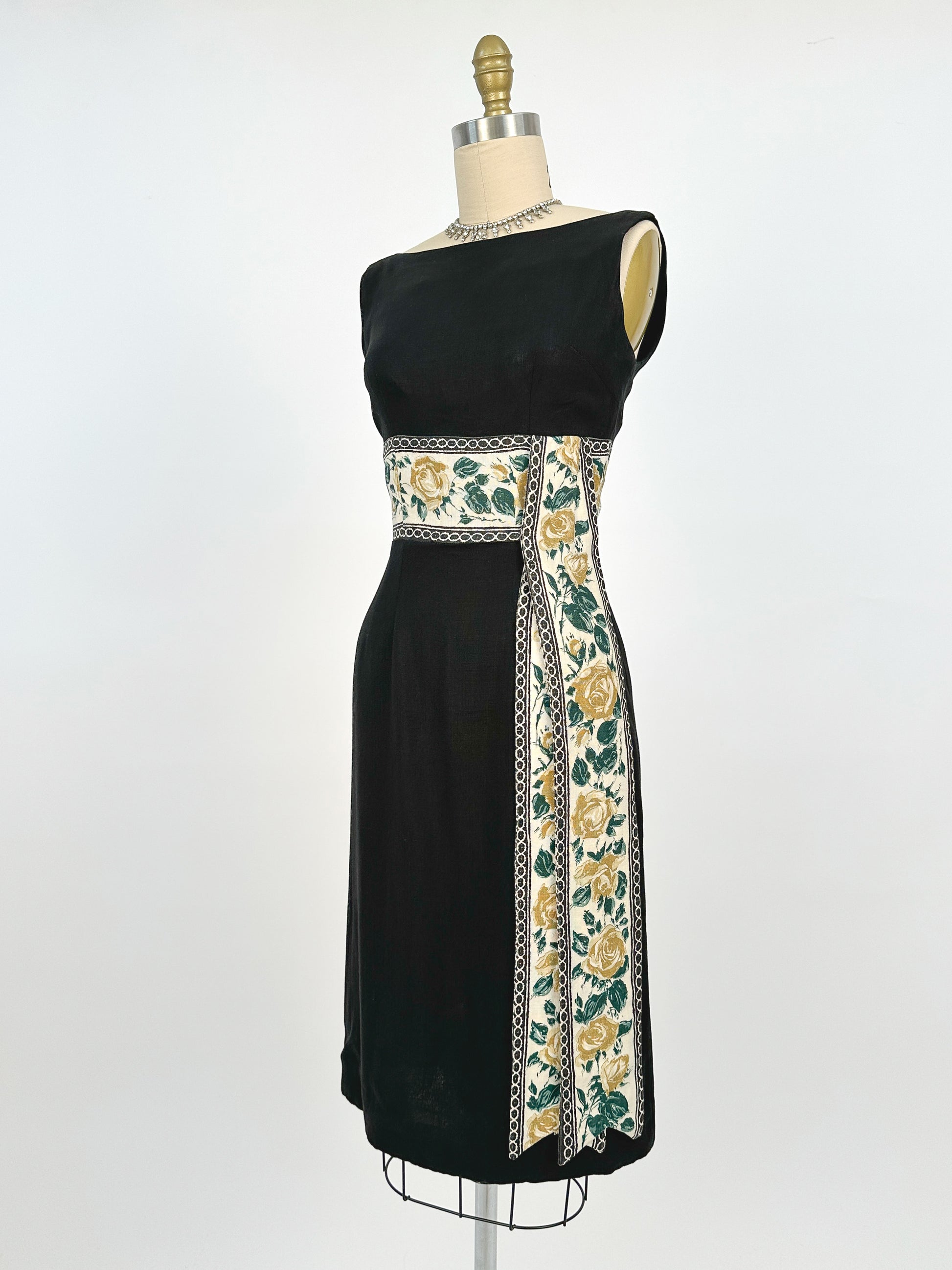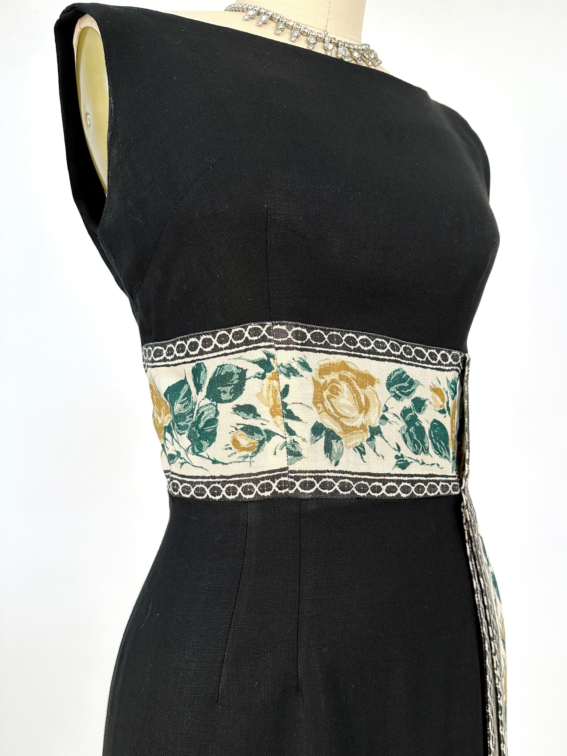 1960s Summery Black Linen Wiggle Dress with Elegant Yellow Rose Print Sash / Waist 24