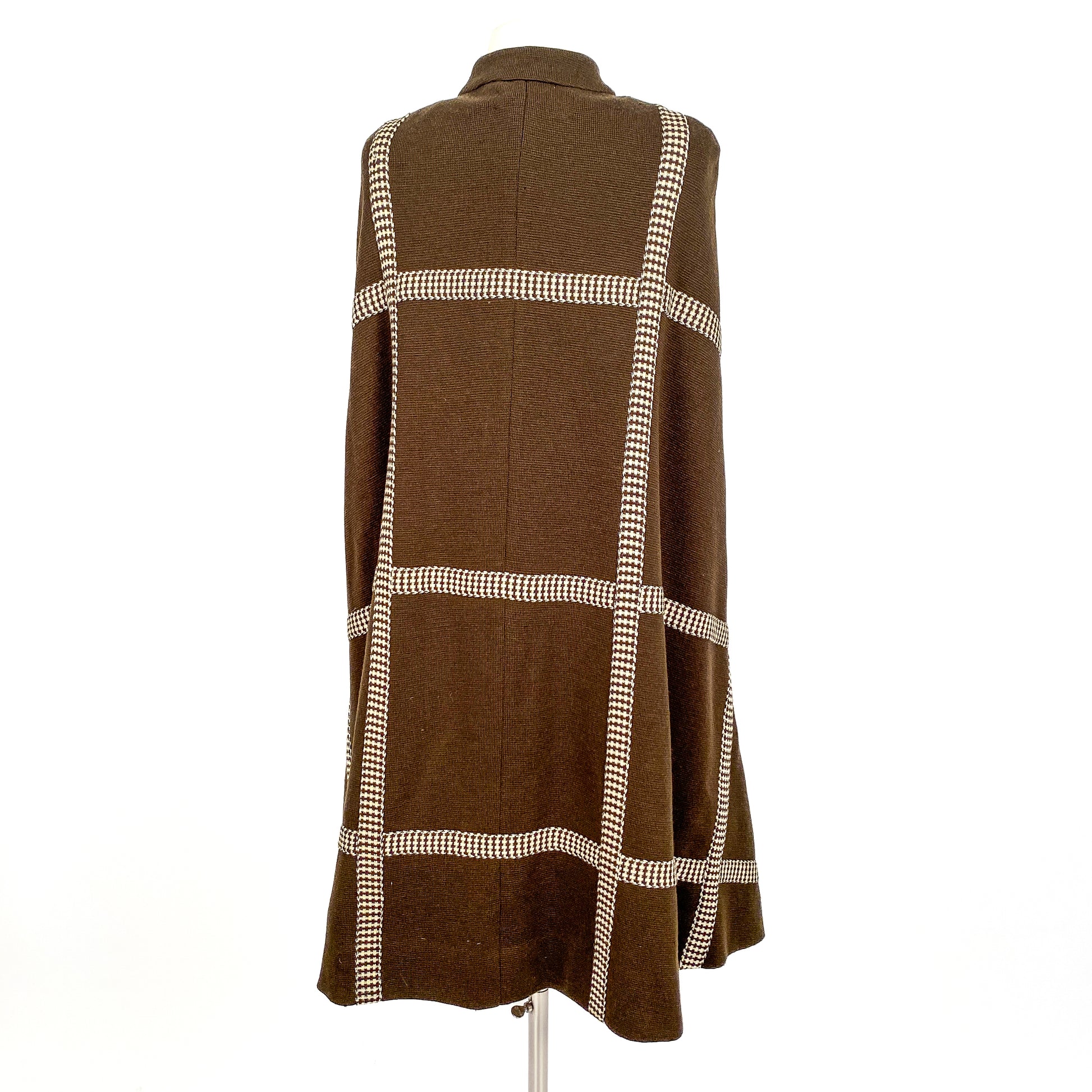 1960-70s brown wool knit cape with checkered trim and gold metal buttons. Not lined, a good weight to the knit fabric. Side slits for the arms.