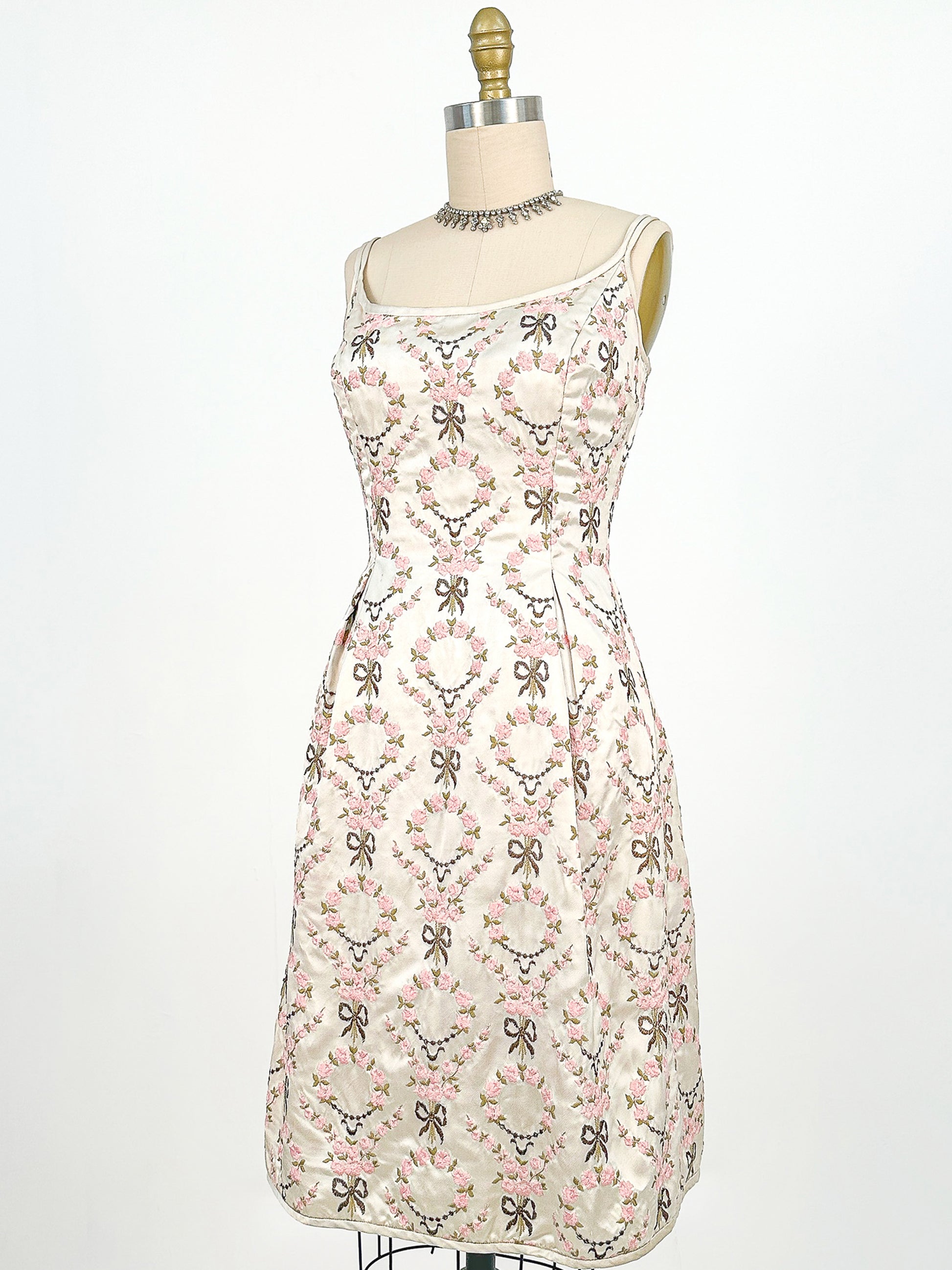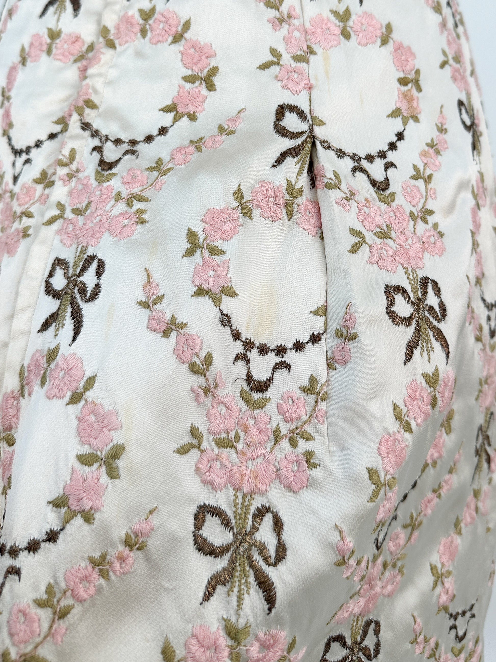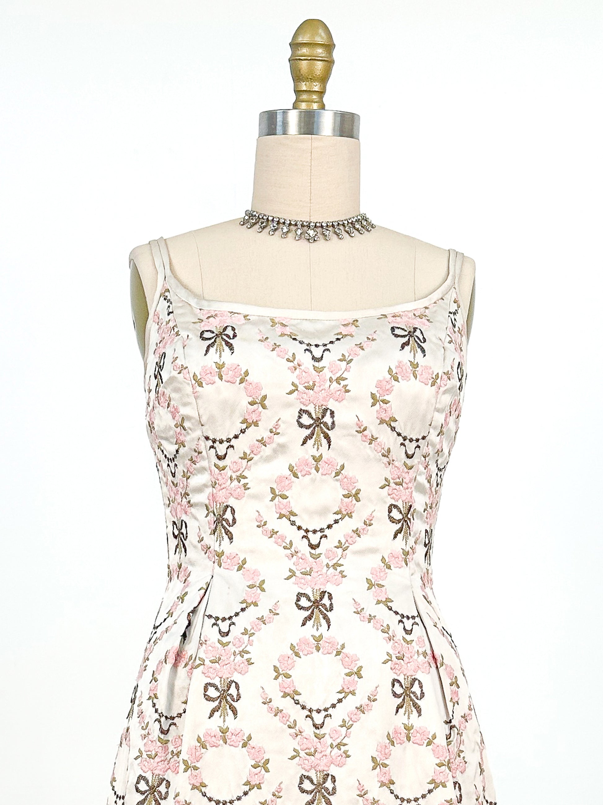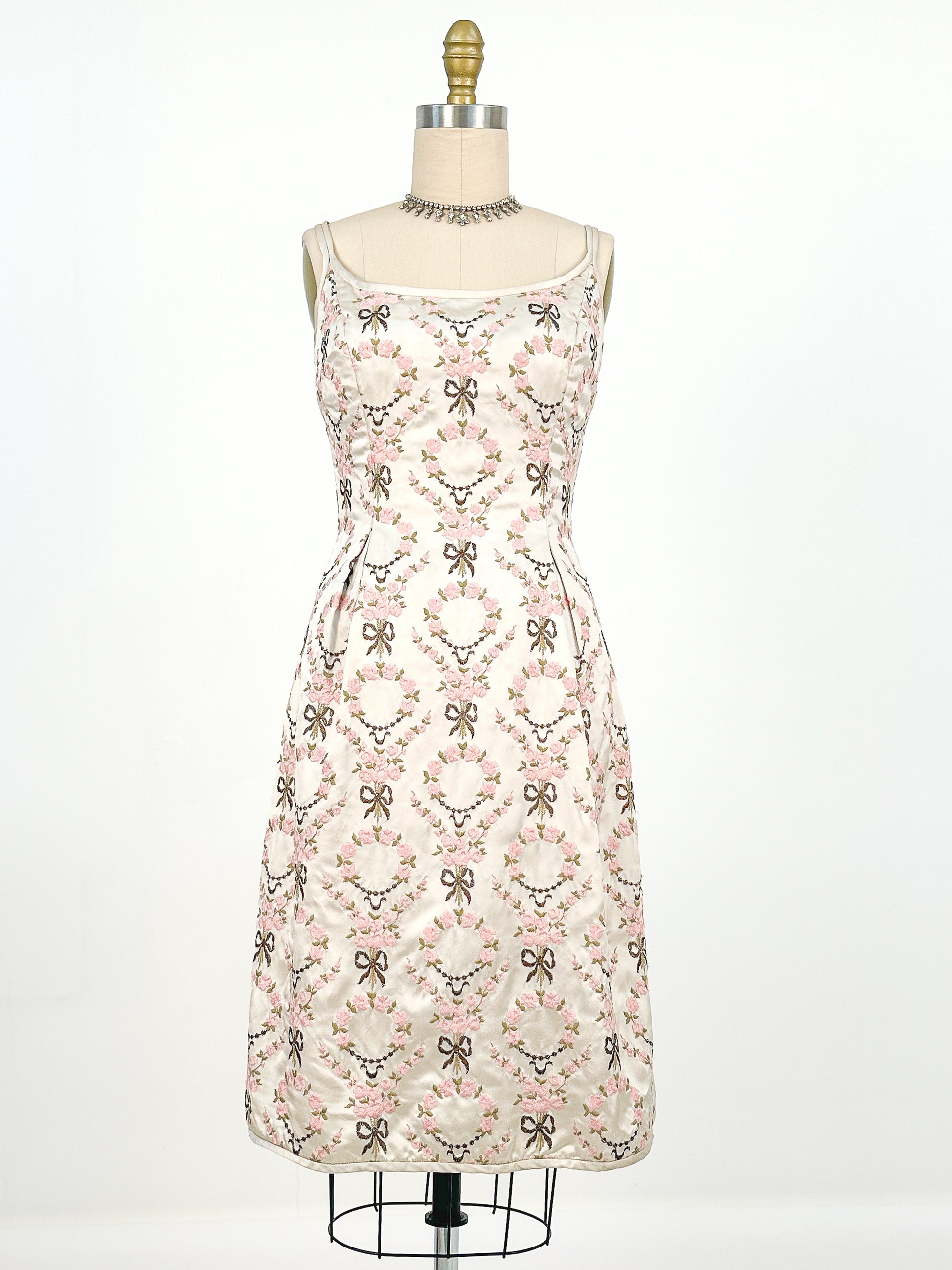 The prettiest and feminine fabric I have ever beheld. An embroidered satin with flower crowns and bows adorns this chic party dress by designer Susan Small. A built-in boned bustier with attached tulle skirt for a bit of structure for the skirt.