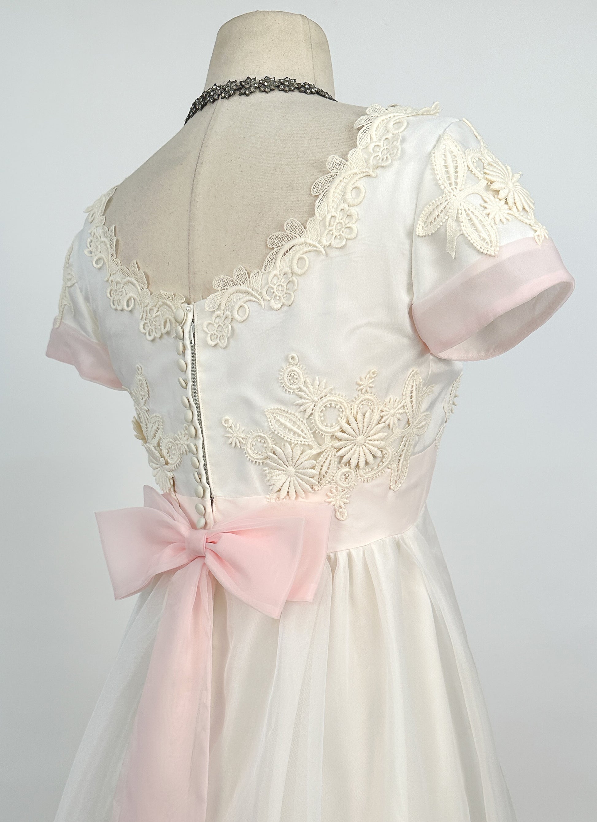 1960s Fairytale Wedding Dress with Pale Pink Trim and Bow / Waist 26
