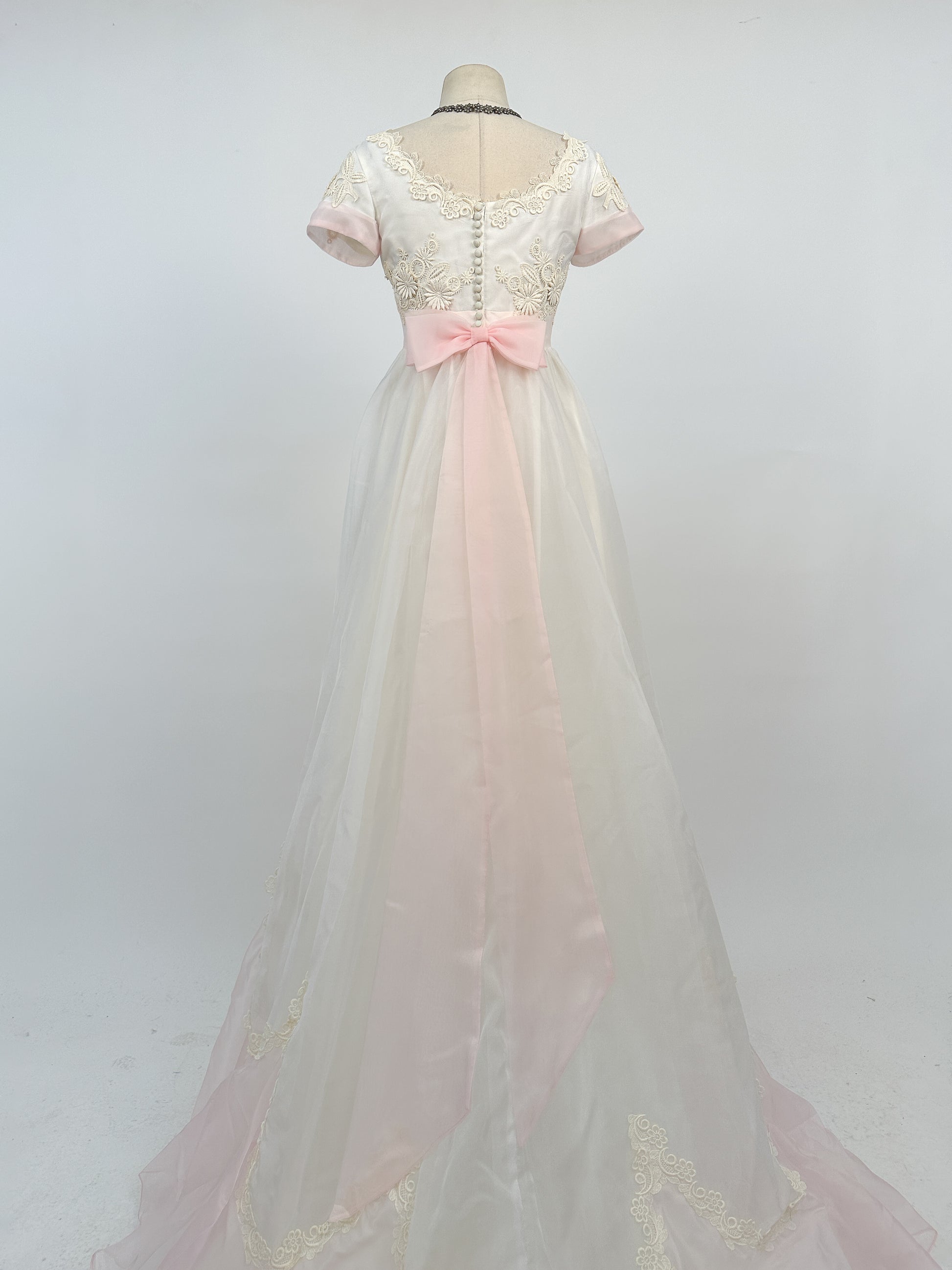 This 1960s Fairytale Wedding dress features an empire waist with lace appliqués and delicate pale pink chiffon trim along the waist, cuffs, and hemline of the skirt. A chapel length train with tulle underskirt for a bit of volume with lining. Long pink bow cascades down the back with matching lace trim separating the pink and white chiffon. Faux buttons down the back with a convent hidden metal zipper. Making it the perfect fit for a classic romantic style.