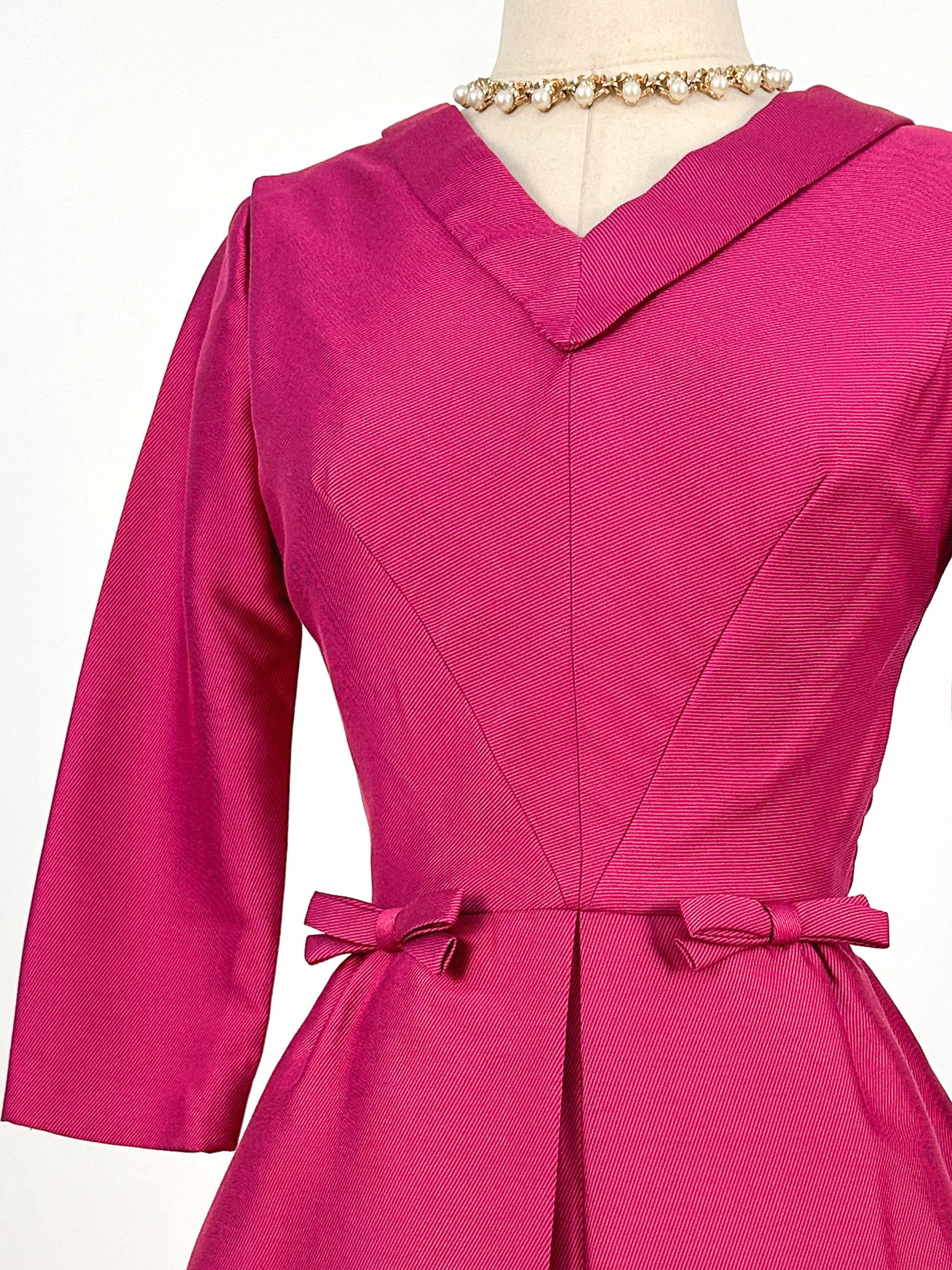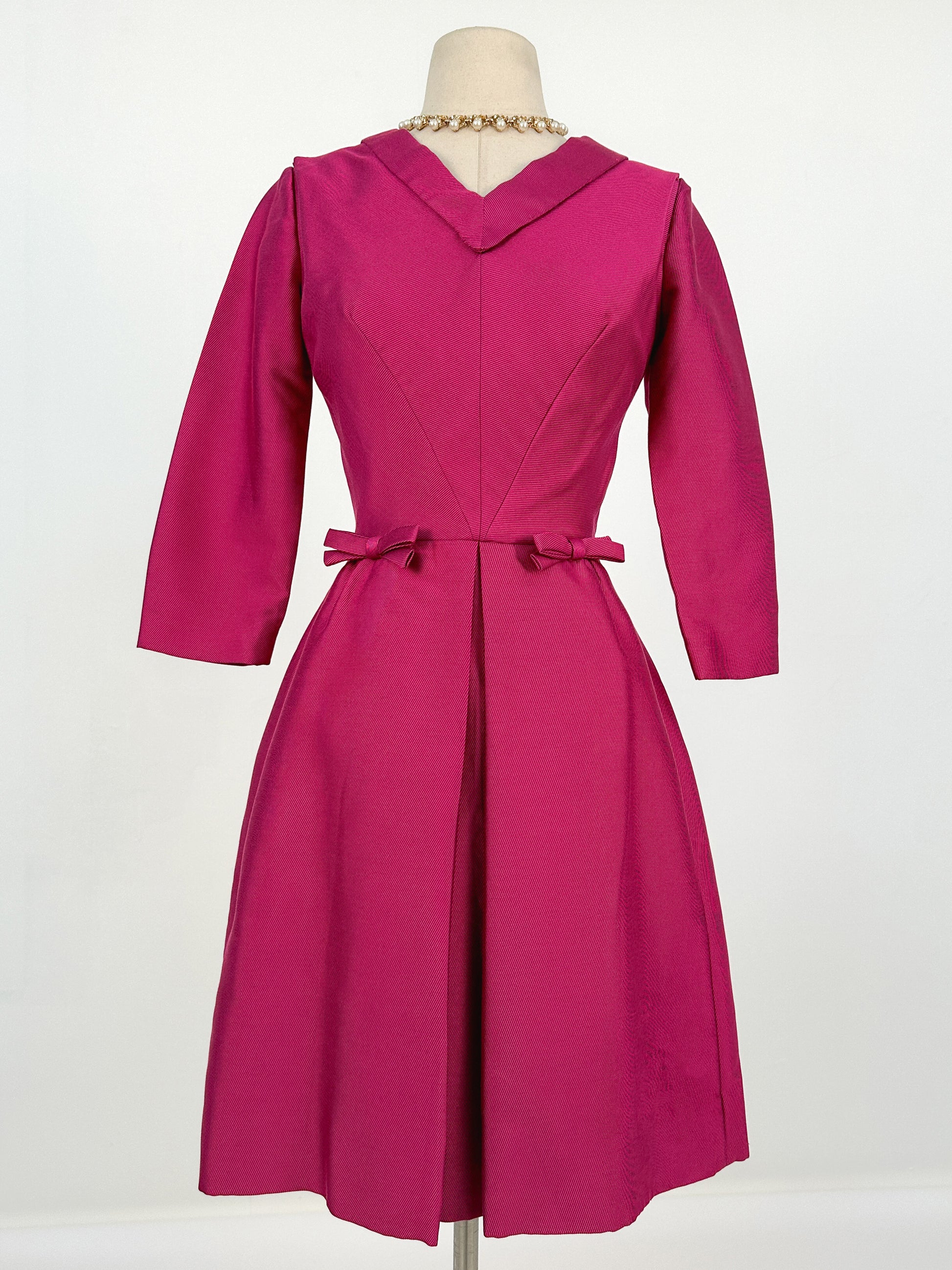 A structured 1960s fuchsia dress with v-collared neckline, 3/4 sleeves, bows on the hips and POCKETS! Two hidden pockets on each hip - I love the structured lines of the bodice. Perfect for any occasion. The fuchsia fabric has a black thread weave within which adds visual texture.