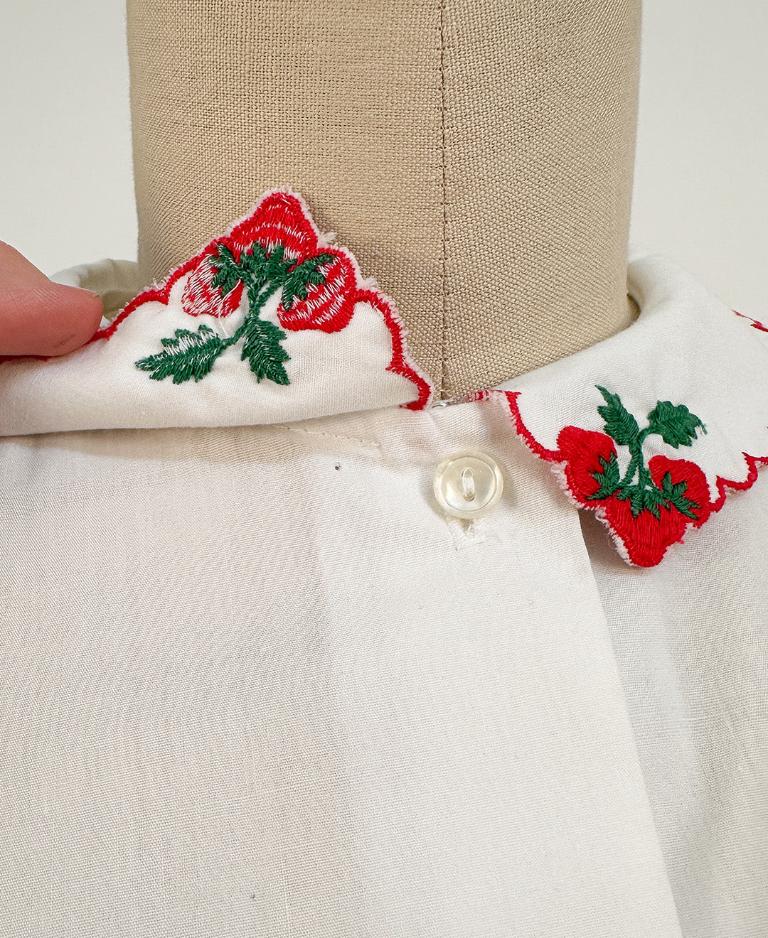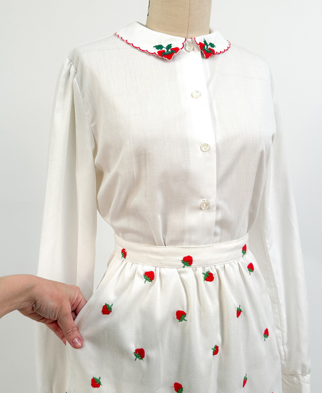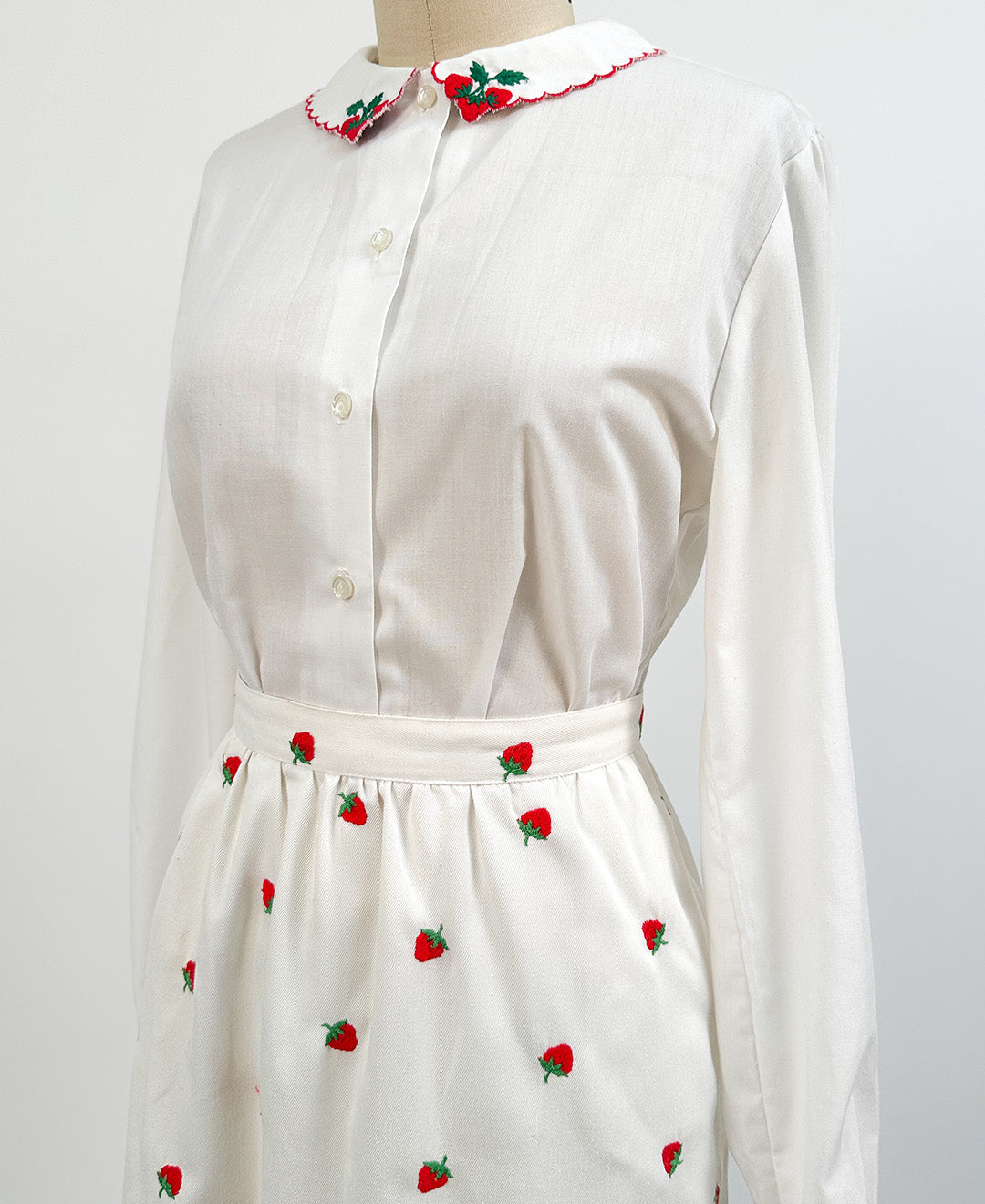 This playful 1960s strawberry cotton button-up features long sleeves and a charming scalloped collar, bringing a sweet vintage vibe to your wardrobe. Perfect for adding a touch of retro fun to any outfit.