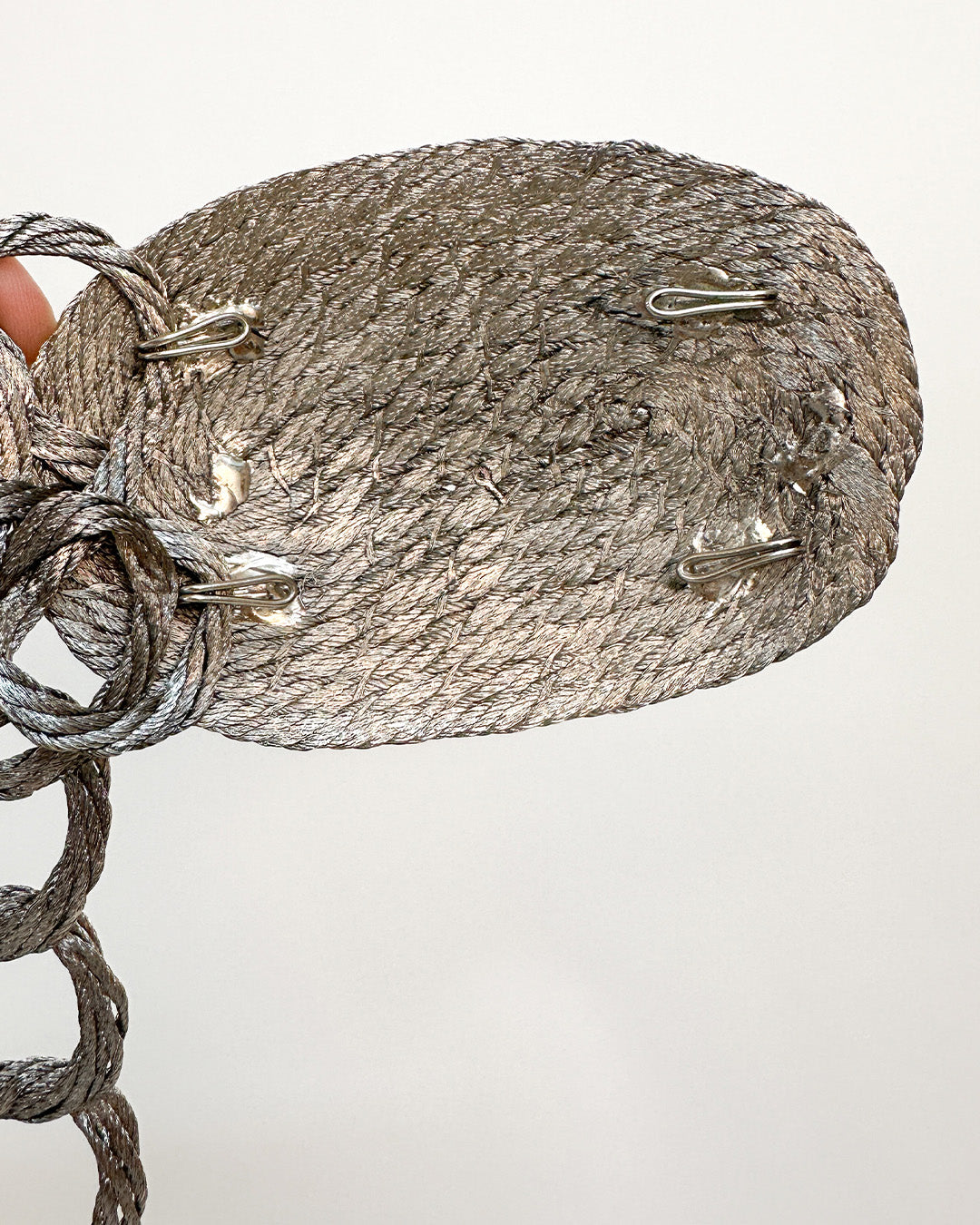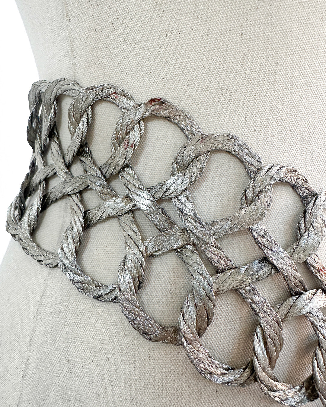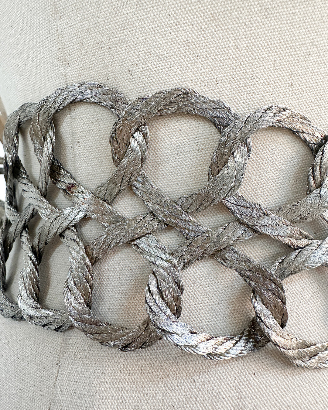 A gleaming relic of 1960s design, this silver-tone belt captures the era’s fascination with futuristic glamour. Its sculptural, woven wire panels form an endless loop motif — a shimmering dance of figure-eights that catch the light with every movement. The intricate metalwork gives it both structure and grace, a celestial shimmer around the waist that feels timeless and modern all at once.