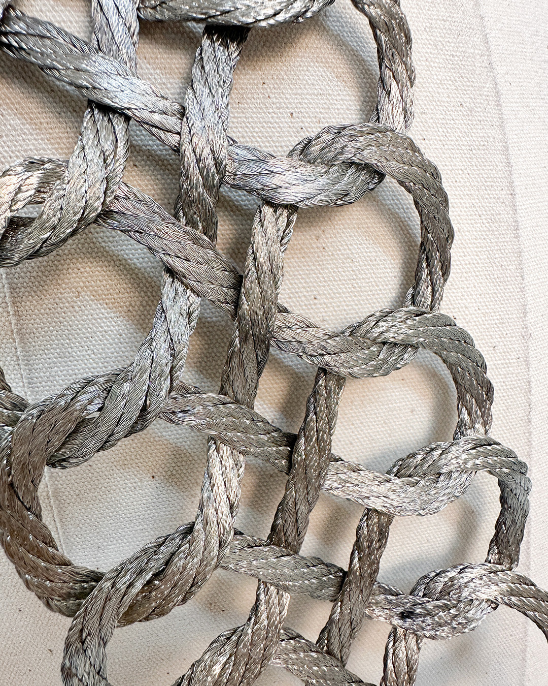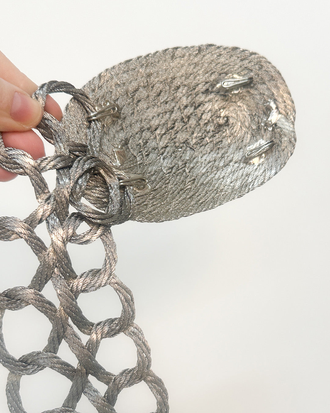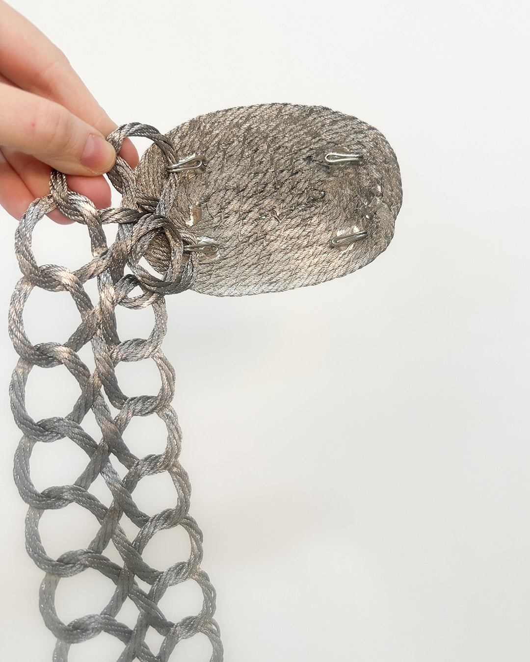 A gleaming relic of 1960s design, this silver-tone belt captures the era’s fascination with futuristic glamour. Its sculptural, woven wire panels form an endless loop motif — a shimmering dance of figure-eights that catch the light with every movement. The intricate metalwork gives it both structure and grace, a celestial shimmer around the waist that feels timeless and modern all at once.