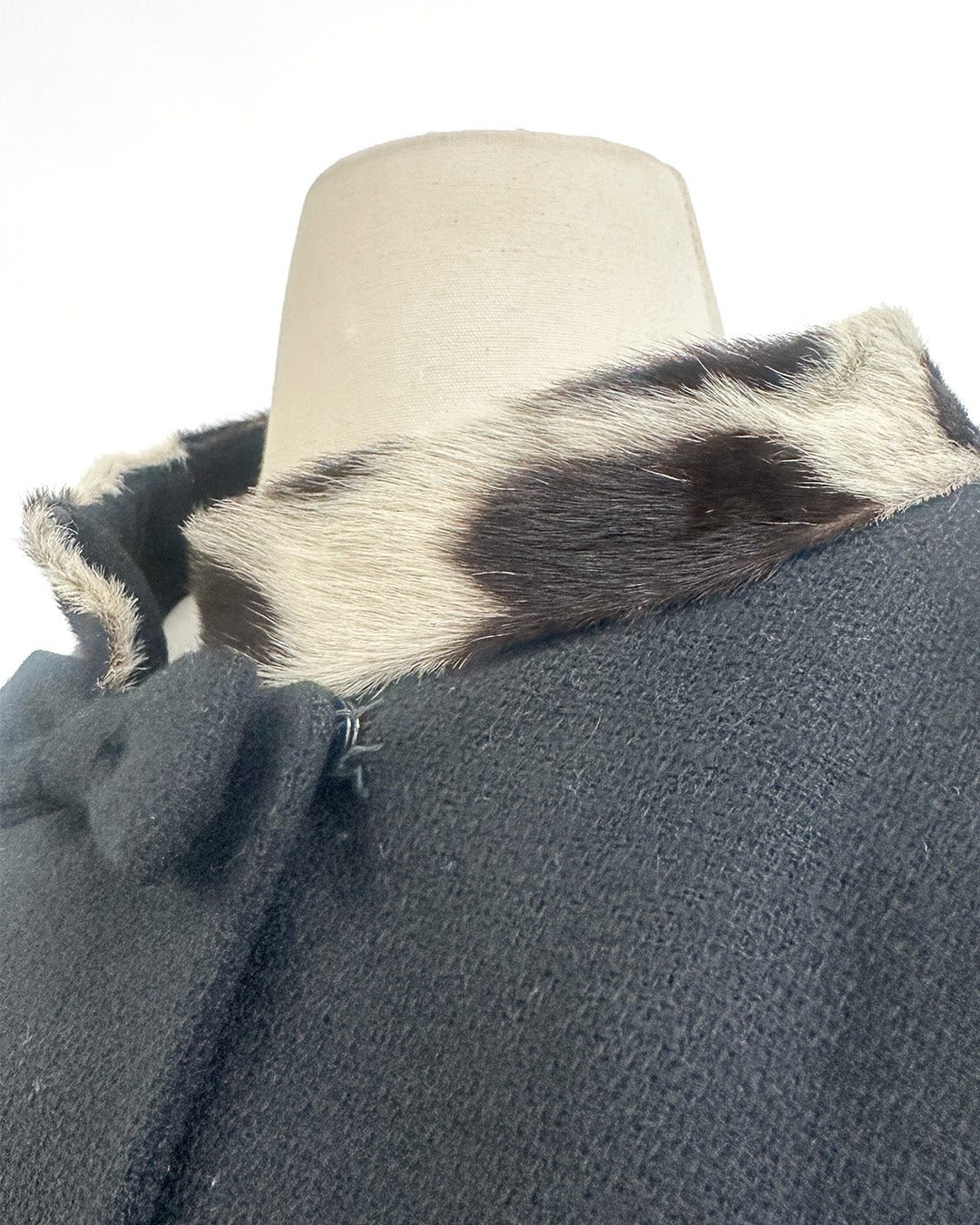 Step out in 1950s sophistication with, The Madison Avenue Jacket, a chic wool piece elevated by a plush cowhair collar. The structured silhouette and luxurious texture make it perfect for crisp Manhattan mornings, park strolls, or gallery visits uptown. Subtle yet striking, it blends mid-century tailoring with a hint of playful texture — a statement coat that turns everyday city streets into a runway.