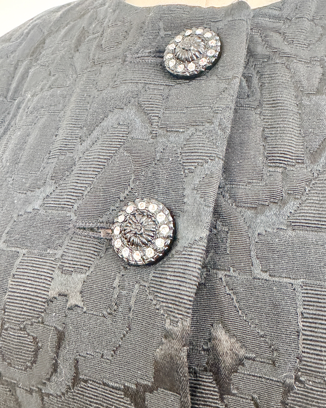 Perfect for cocktail hours, evening galas, or any night that calls for luxurious sophistication, this jacket elevates any ensemble with mid-century elegance and high-style drama.