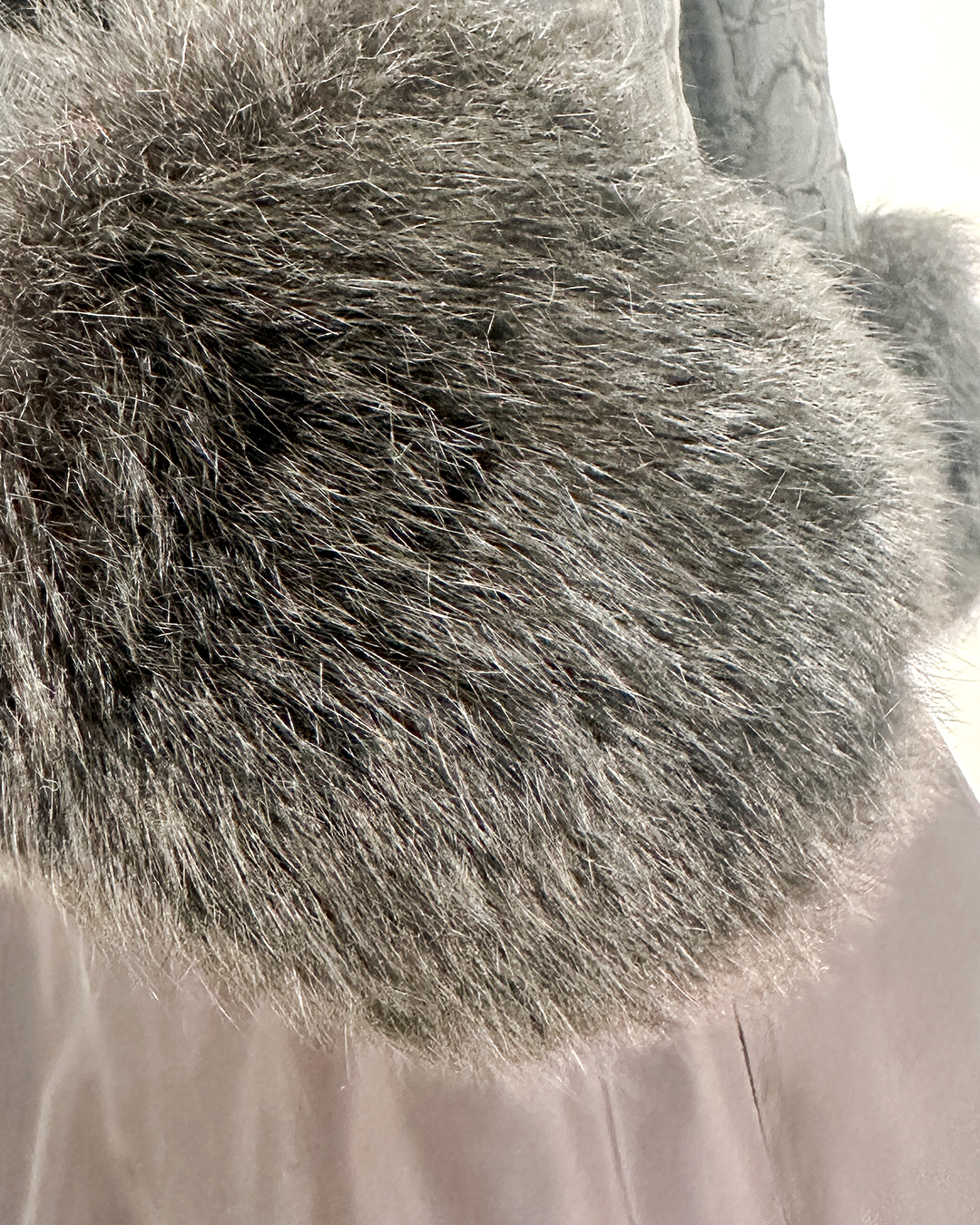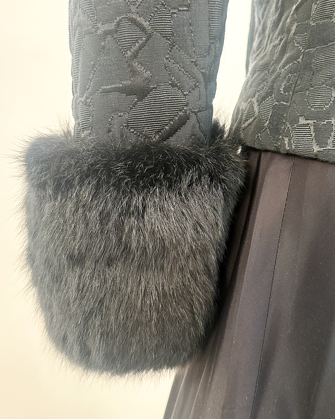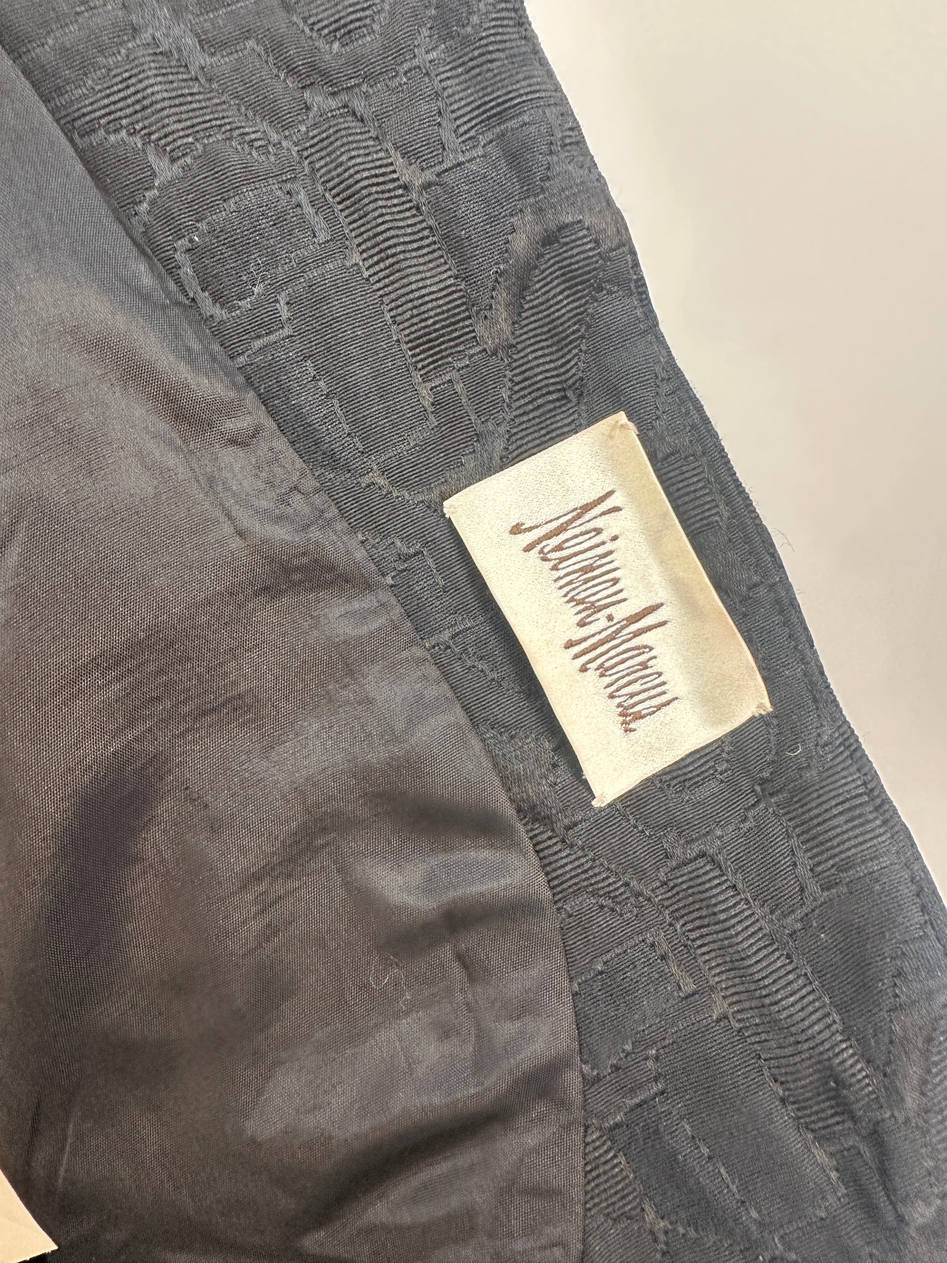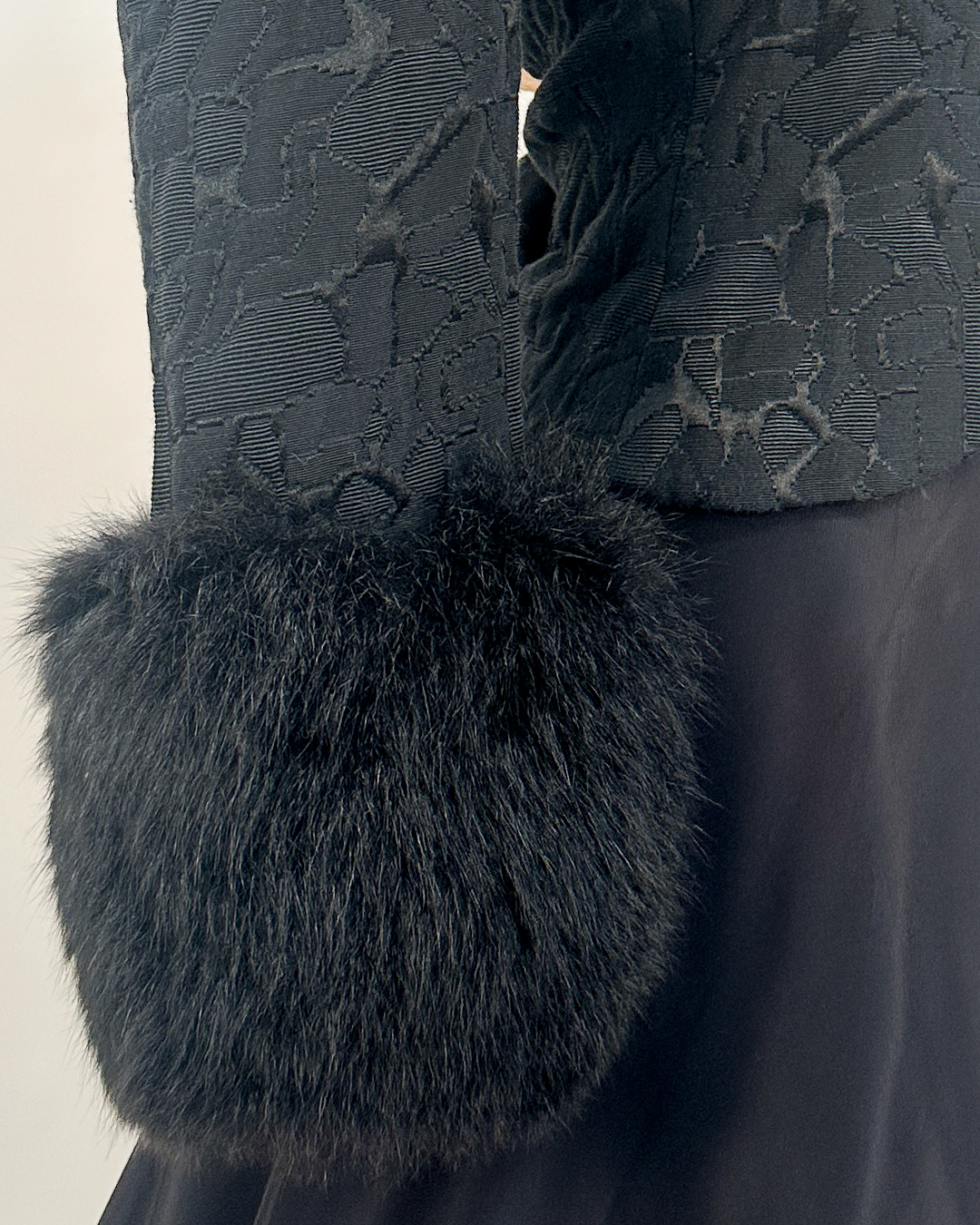 Opulent, dramatic, and effortlessly glamorous, the Starlight Evening Jacket by Neiman Marcus is a 1960s showstopper. Crafted in a rich textured fabric, it features a bold fur statement sleeve that adds volume and flair, while sparkling rhinestone buttons provide a touch of refined sparkle.