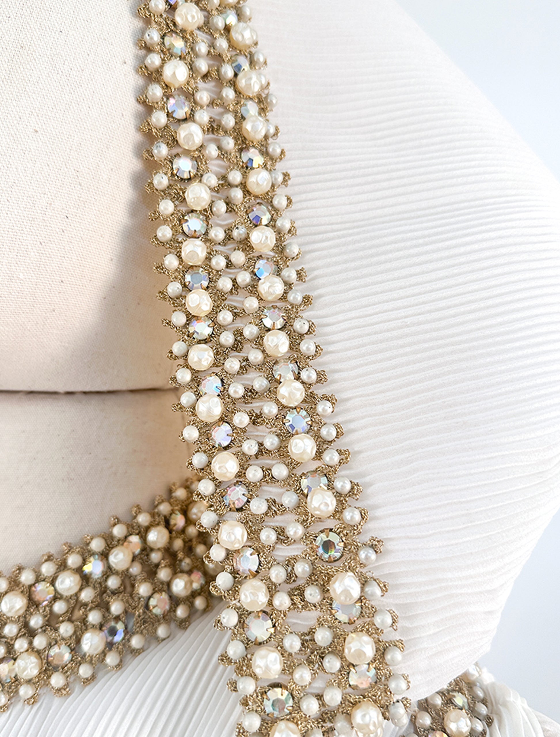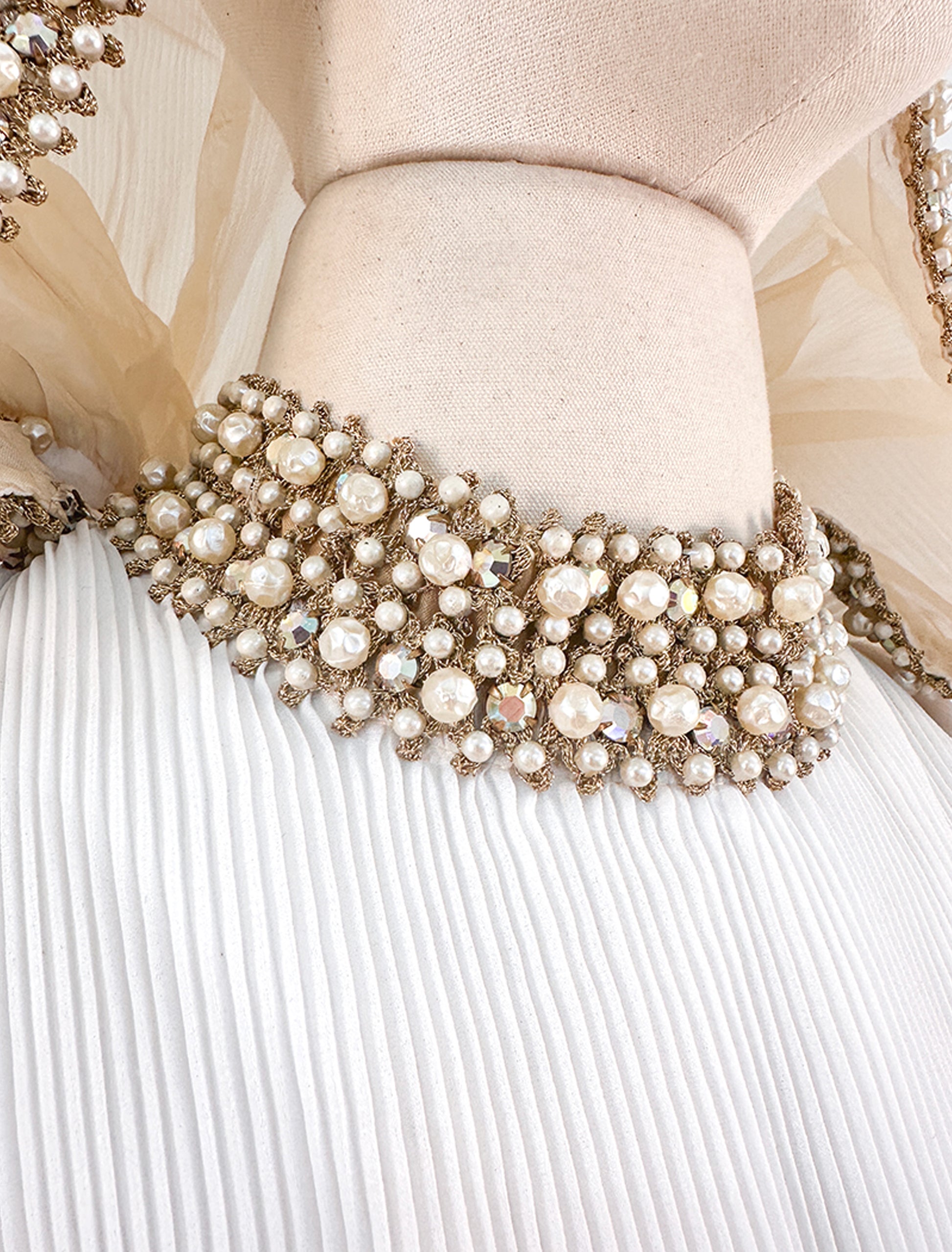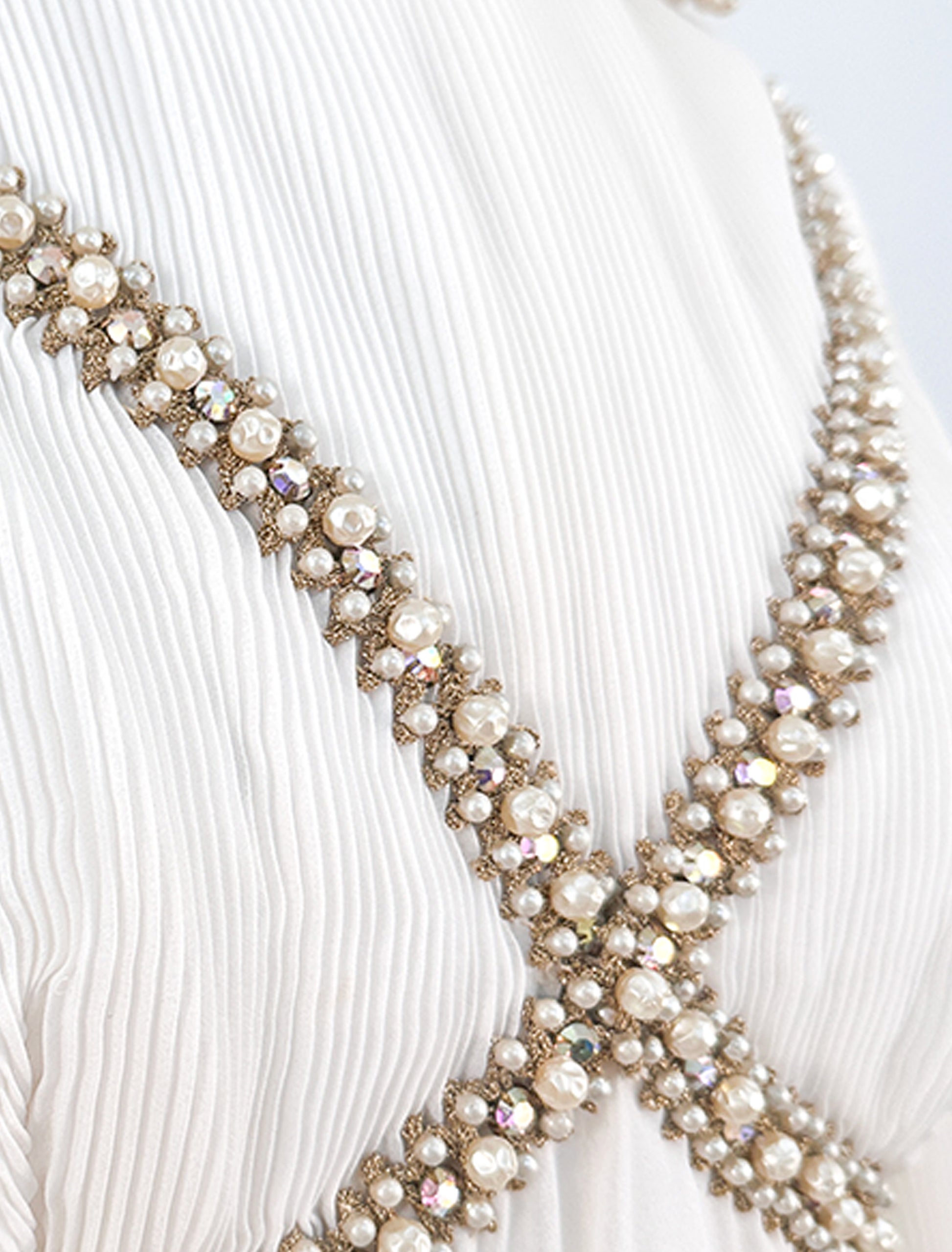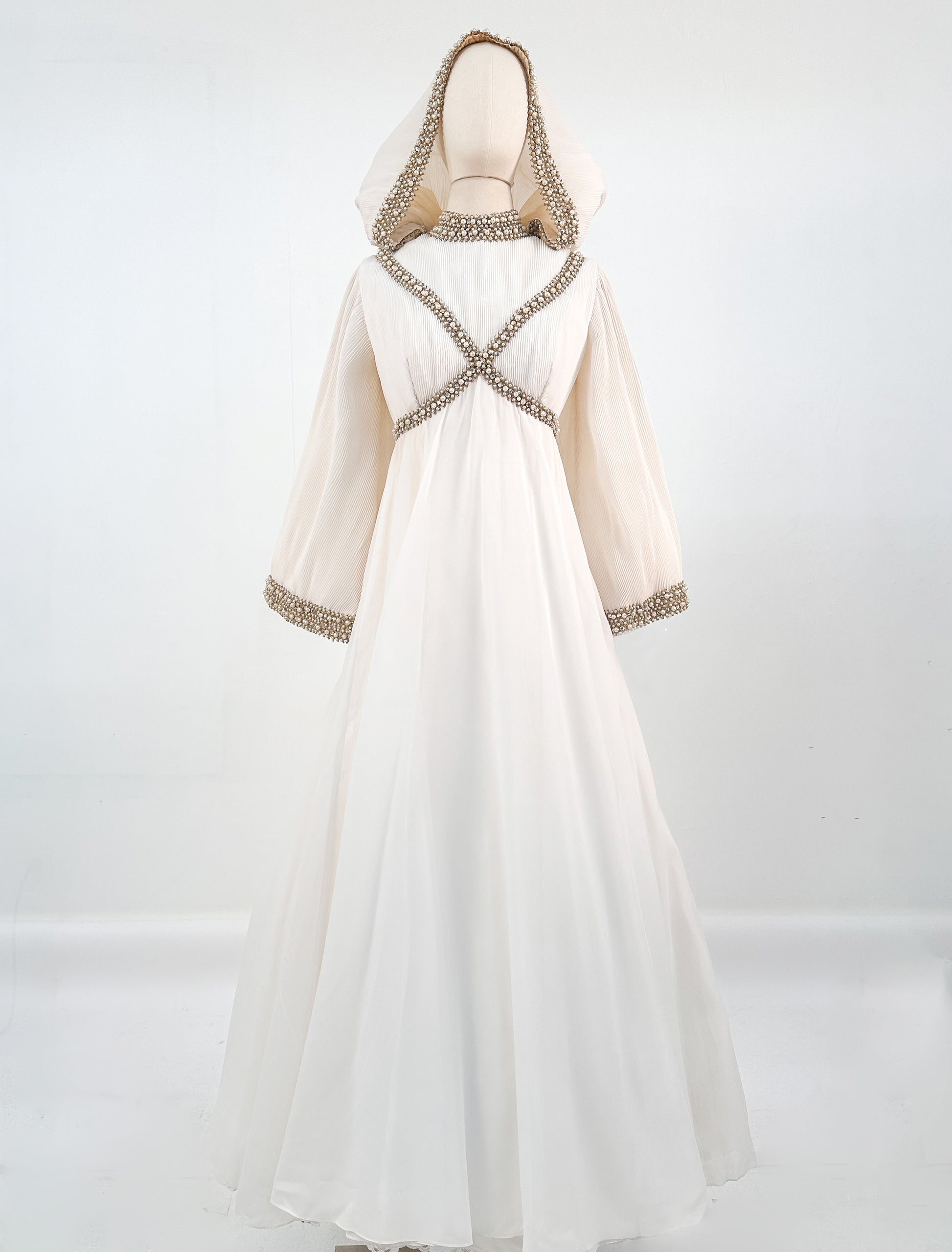 This exquisite one-of-a-kind 1960s wedding gown features a micro-pleated bodice and bell sleeves, both heavily adorned with pearls and rhinestones. A chiffon hood acts as a veil and matched the pleated bodice. The hood is attached by hook/eyes that surround the neckline. The bodice has a wrap-around trim with an empire waist. The skirt is a light flowing chiffon with an optional bustle. The bustle is fastened with delicate thread loops adorned with small pearls and attach to buttons surrounding the back waist. Back zipper closure.
