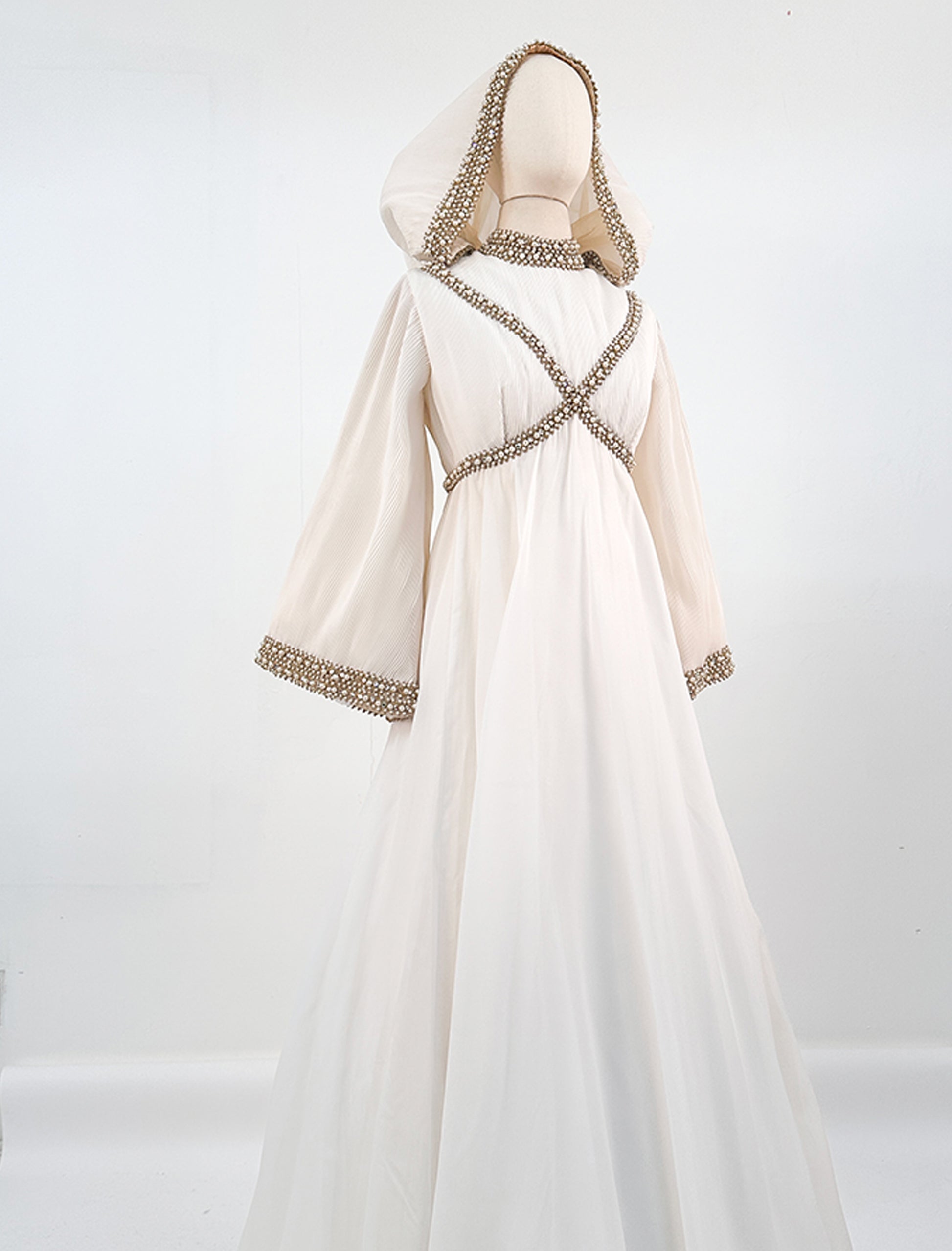 1960s Unique Hooded Chiffon Wedding Gown Adorned with Pearls and Rhinestone / Waist 30