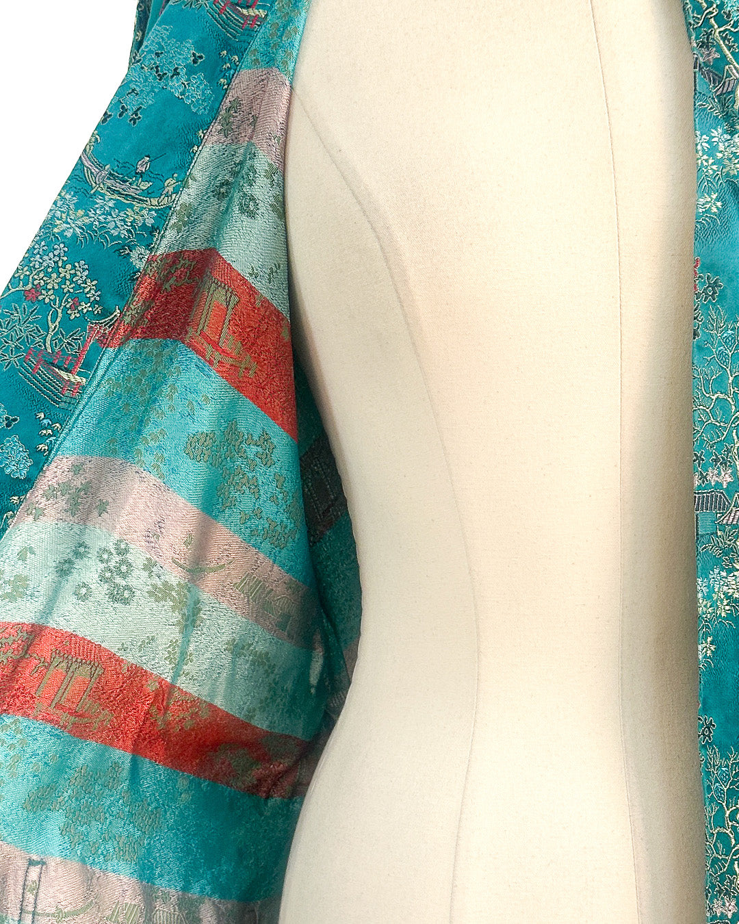 Draped in deep teal silk brocade that gleams like moonlight on still water, this vintage robe is a vision of quiet opulence. The chinoiserie-inspired weave dances with subtle metallic threads, revealing intricate patterns that shift and shimmer with every movement.