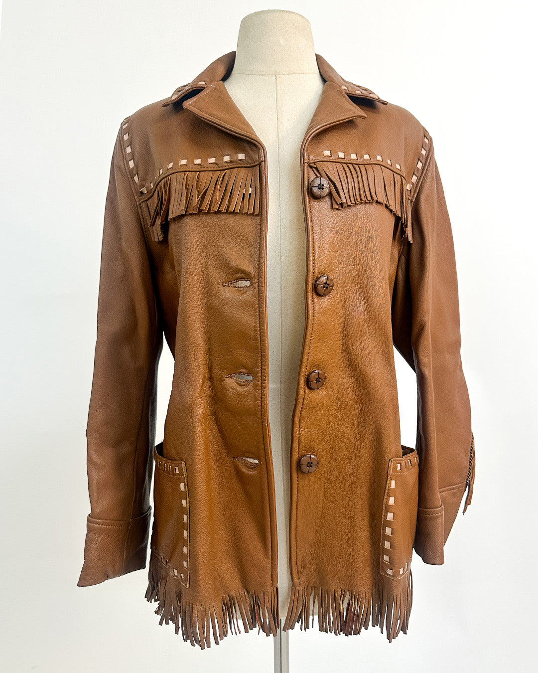 Channel your inner enchantress with this 1970s fringe leather jacket — part bohemian rock goddess, part midnight witch. Soft, supple leather drapes like shadowed silk, while flowing fringe along the sleeves and back moves with every step, catching moonlight and mystery alike. Woven trim and patch pockets add texture and charm, making this jacket both spellbinding and effortlessly wearable.