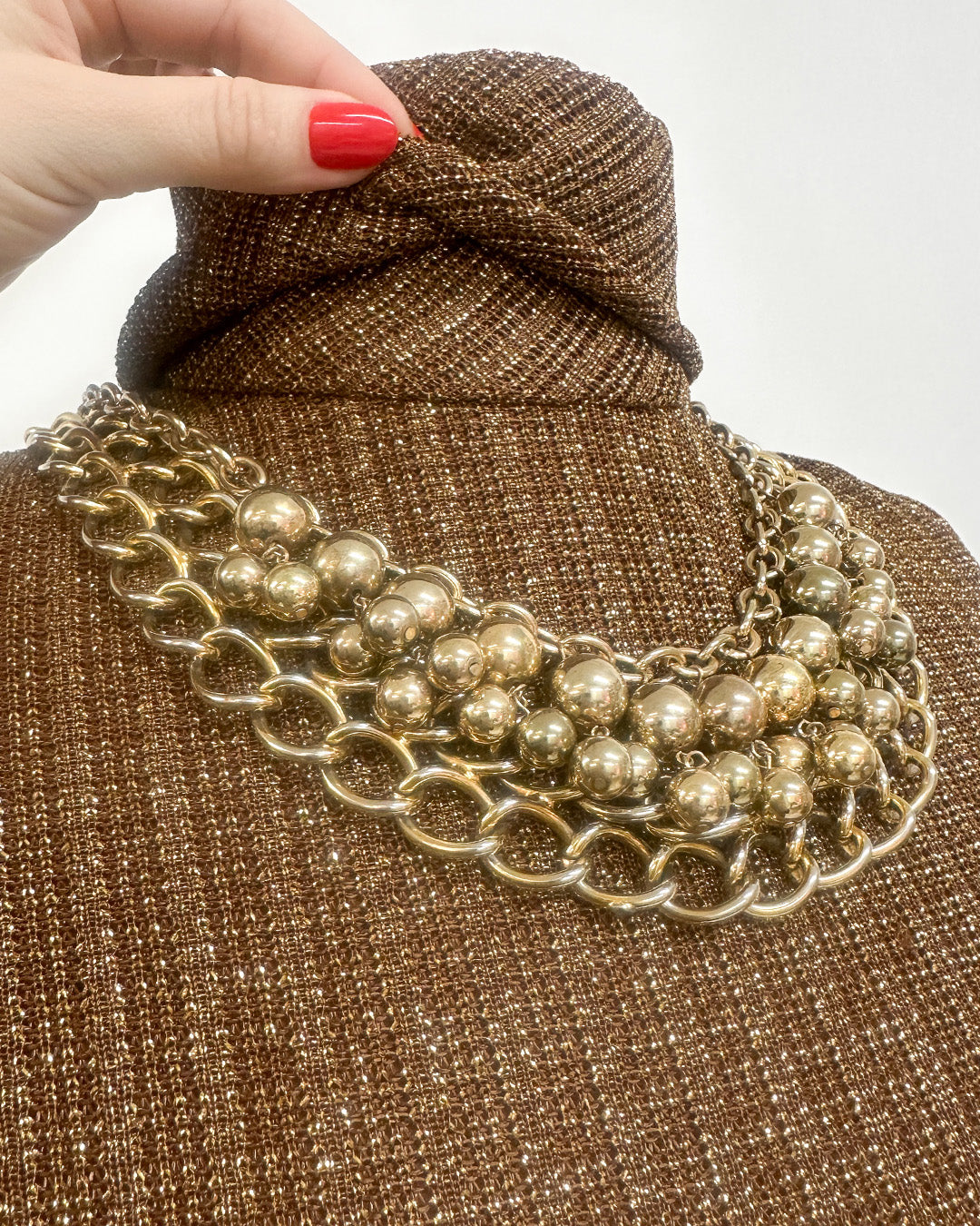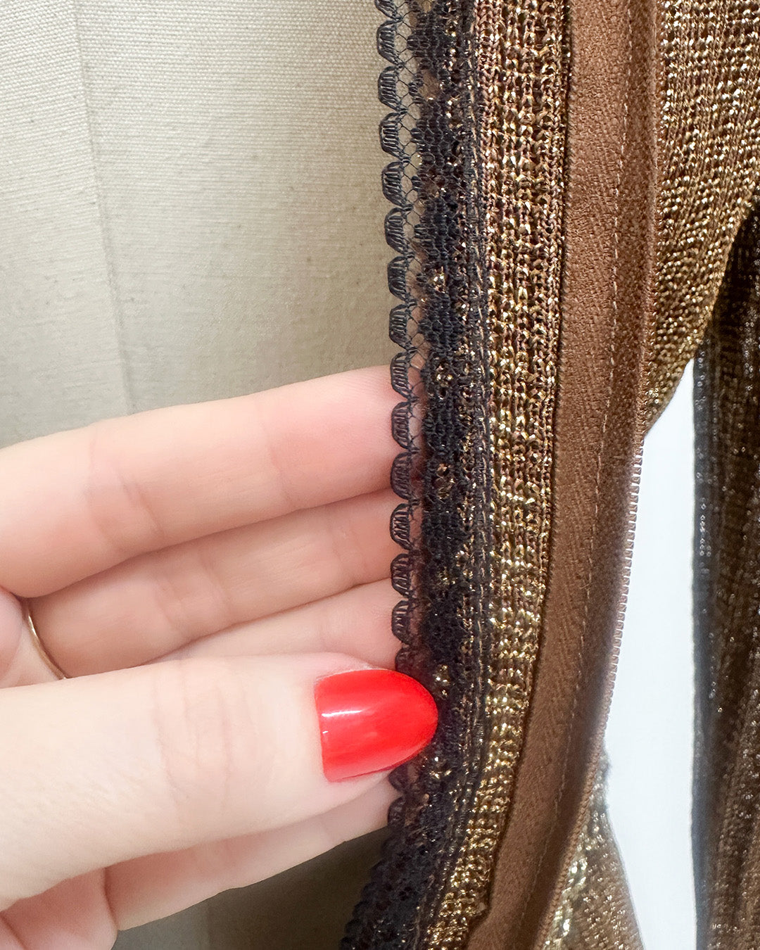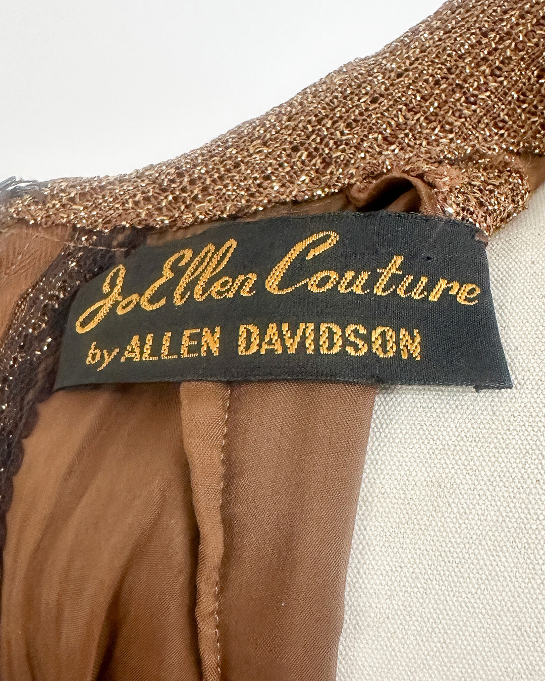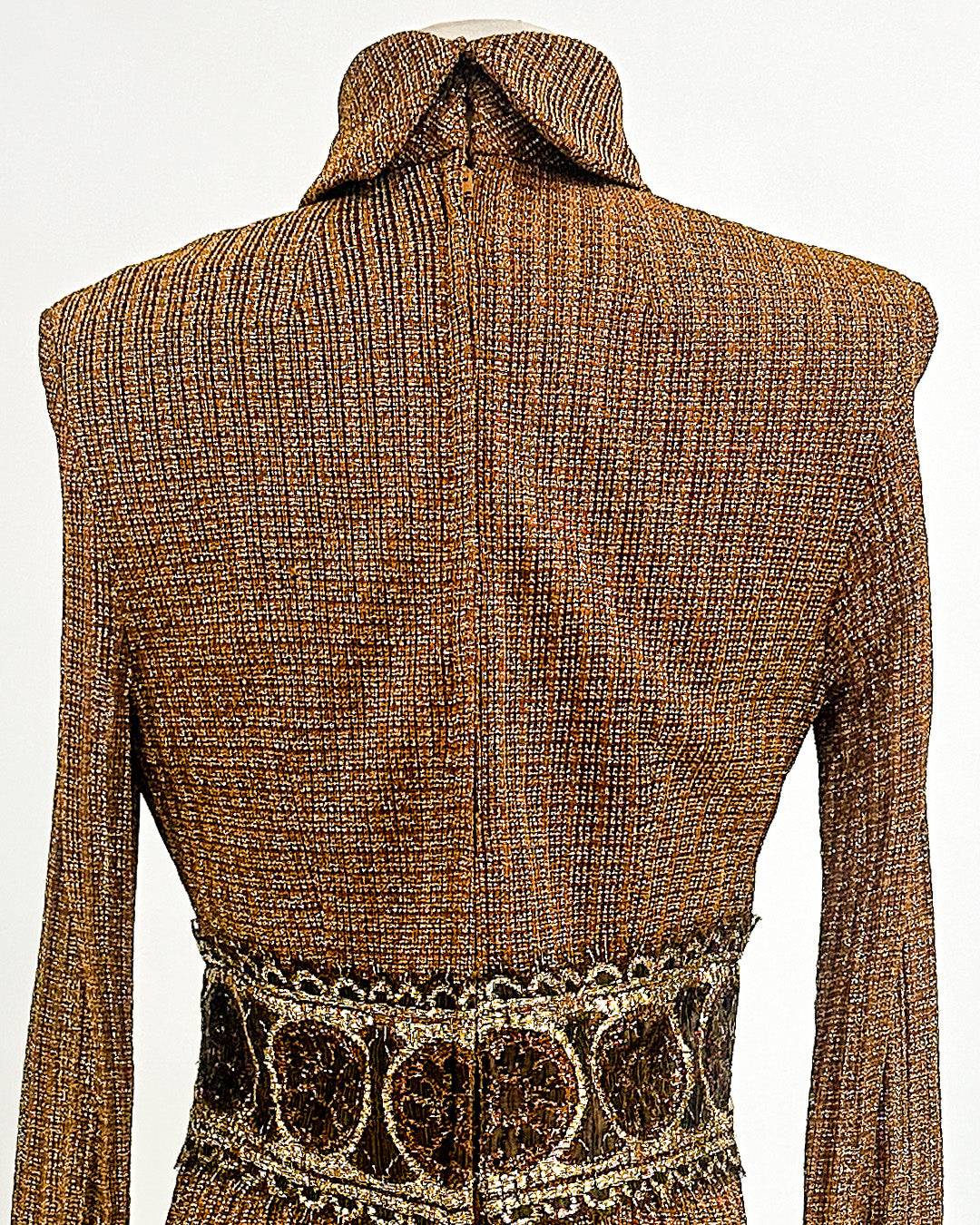 Glittering like the skyline at sunset, The Metropolitan Lamé is a high-neck, long-sleeve vintage dress that channels 1970s Manhattan sophistication. Crafted in gold and bronze metallic lamé, it catches every glint of city light as you move, perfect for cocktail soirées, gallery openings, or an evening under the lights of Fifth Avenue. Structured yet fluid, this dress is where disco-era shimmer meets classic NYC elegance.