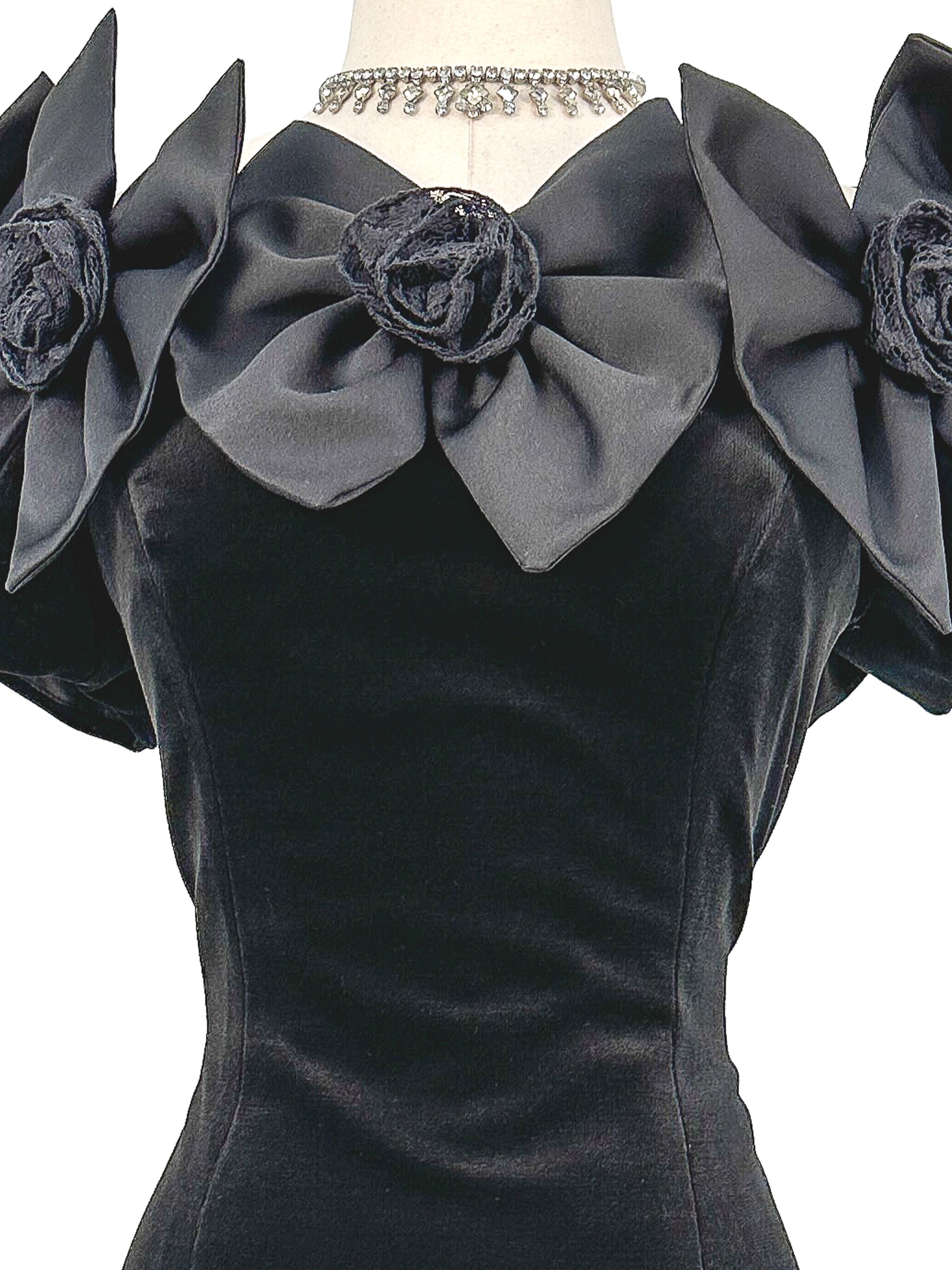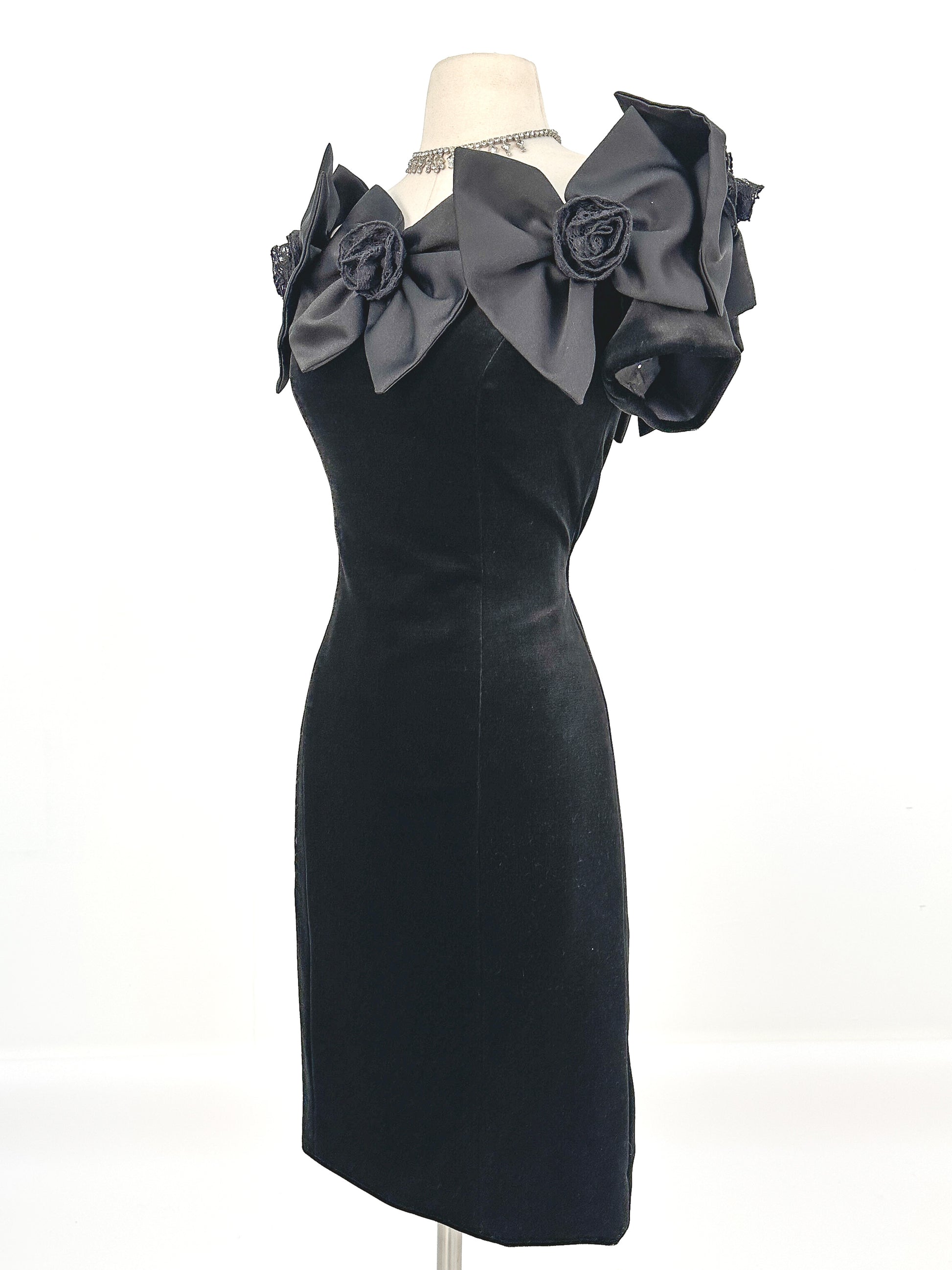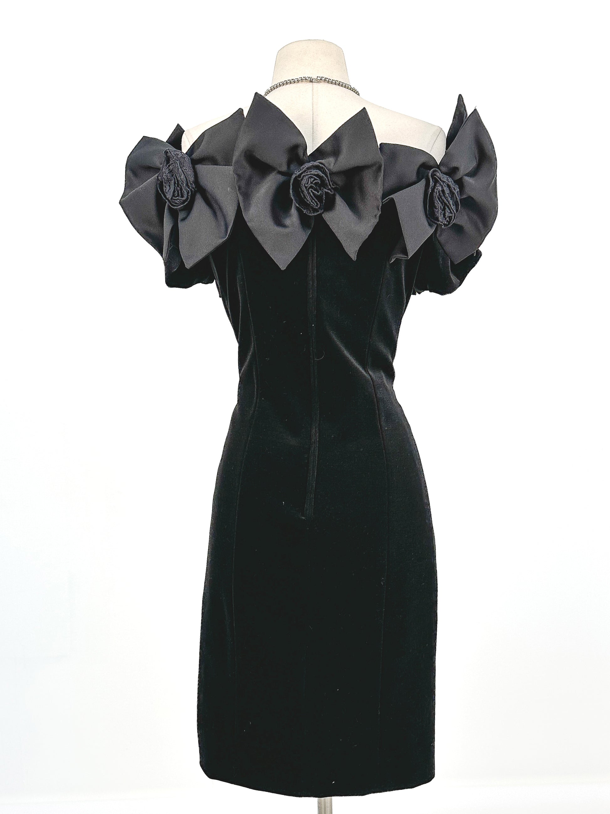 1980s Off the shoulder Black Velvet Bow Dress / Waist 30