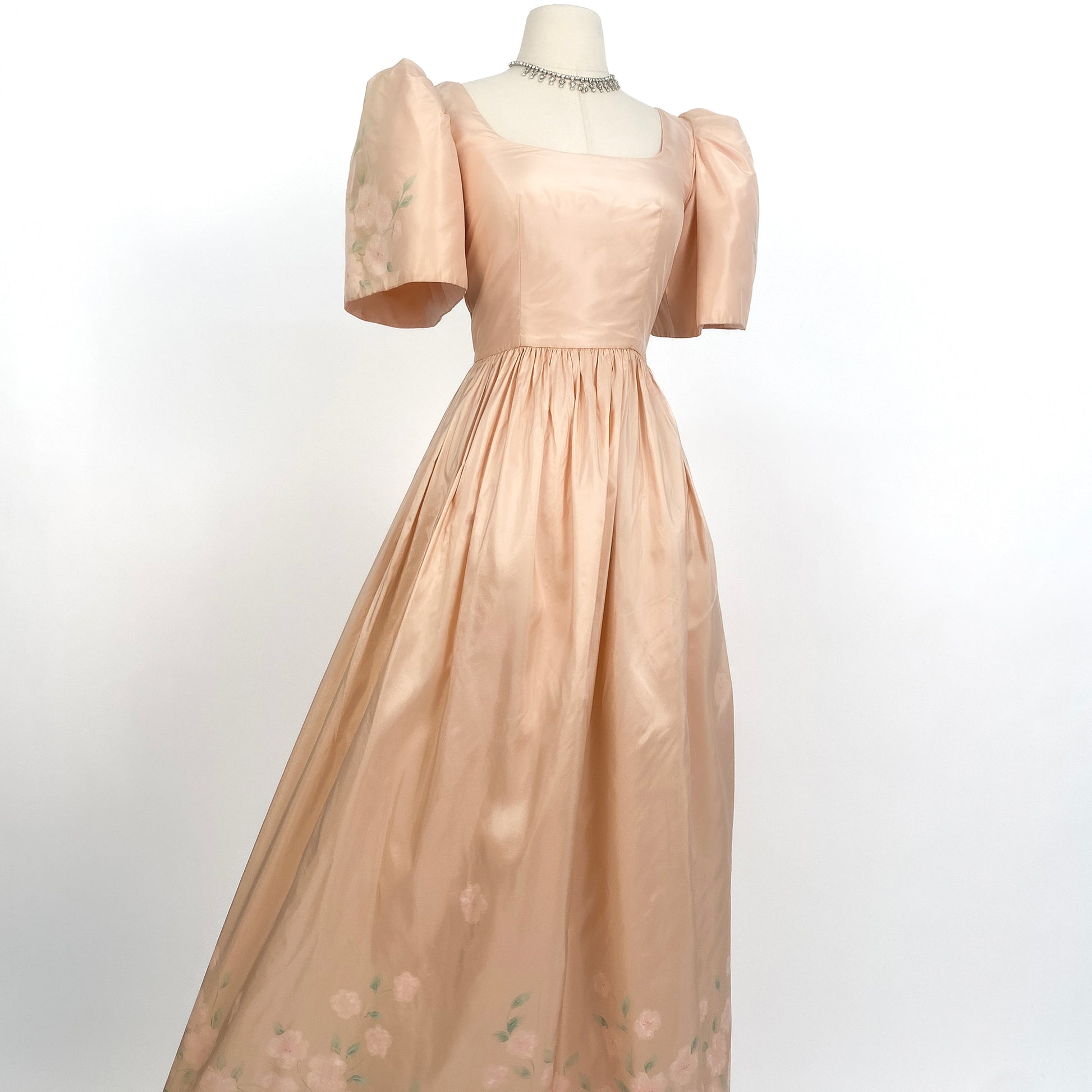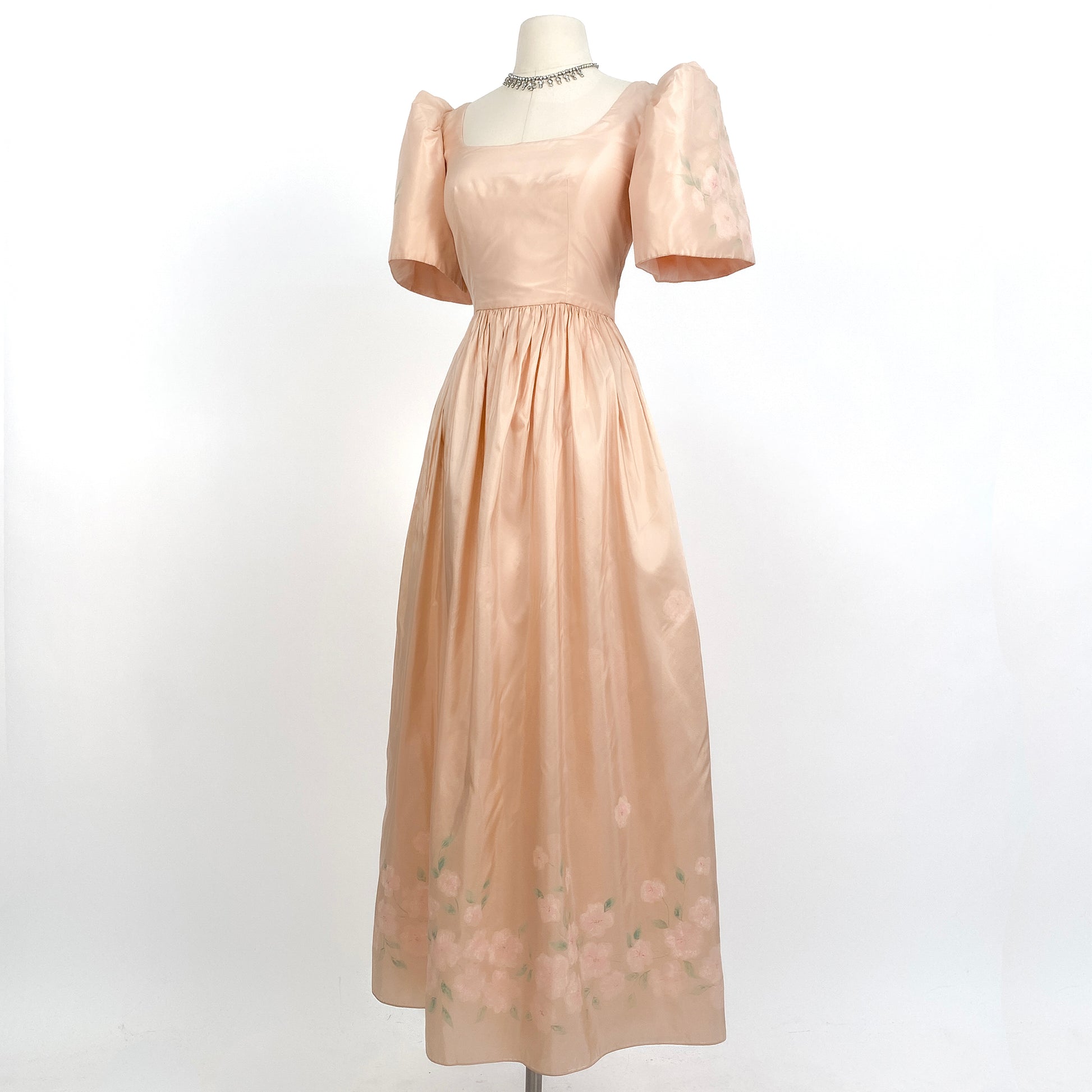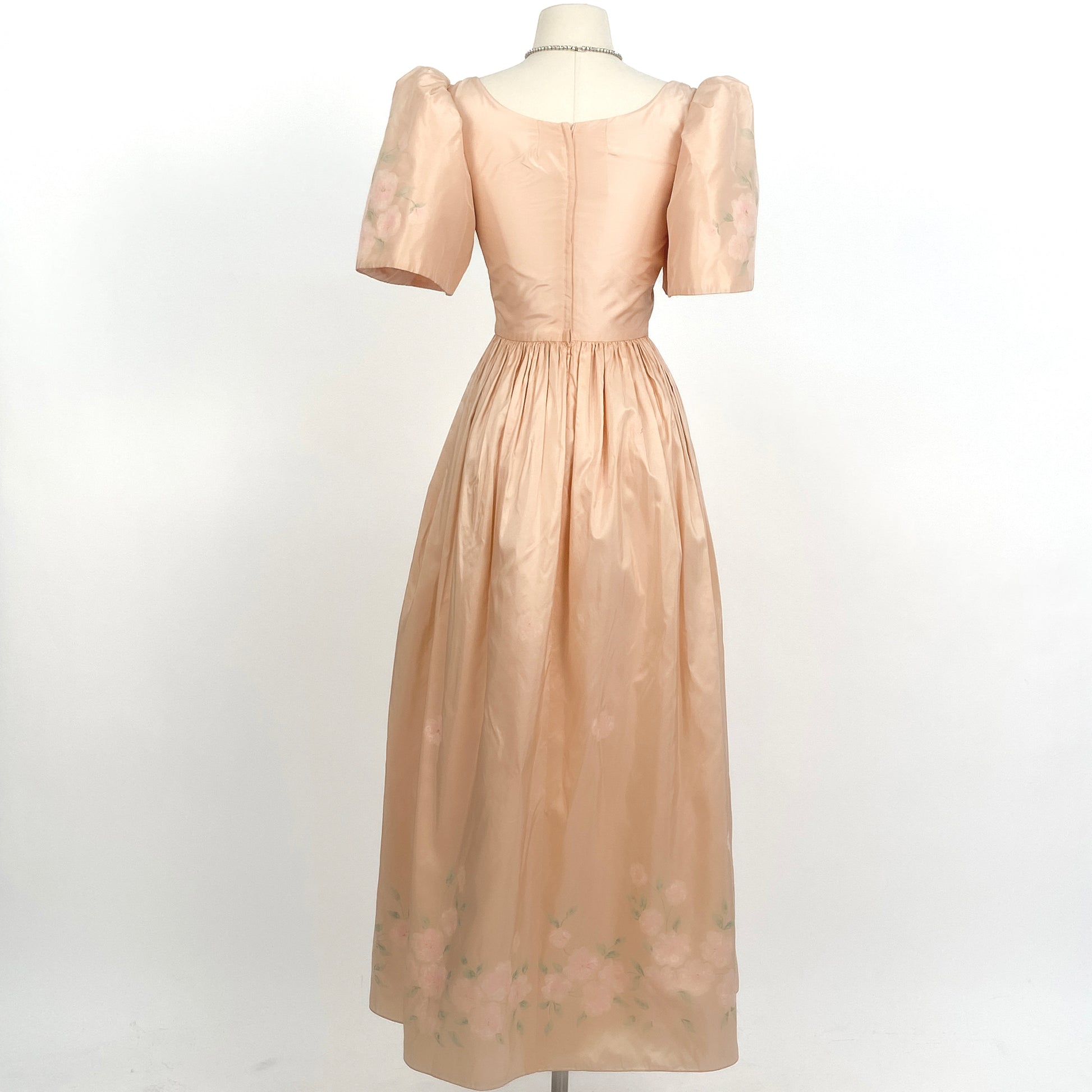 The most romantic 'pretty in pink' taffeta dress by Richilene New York. The dreamy florals that accent the sleeves and the hemline are all hand painted. The bell-shaped sleeves are supported by a tulle ruffle on the shoulder. The dress is fully lined with back zipper closure.