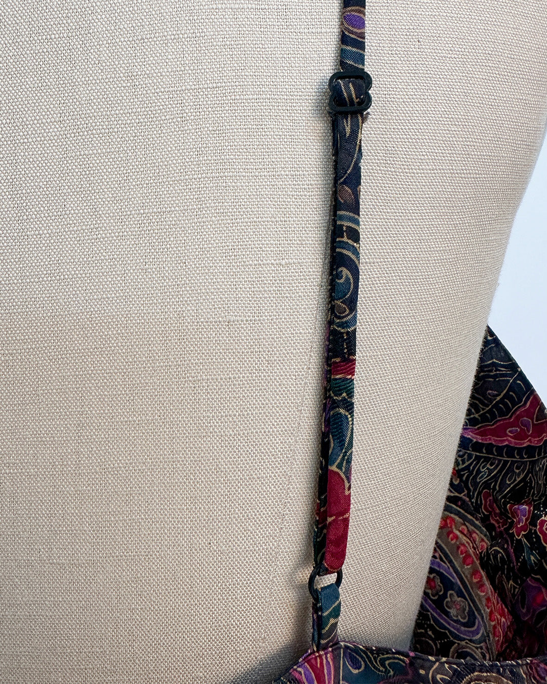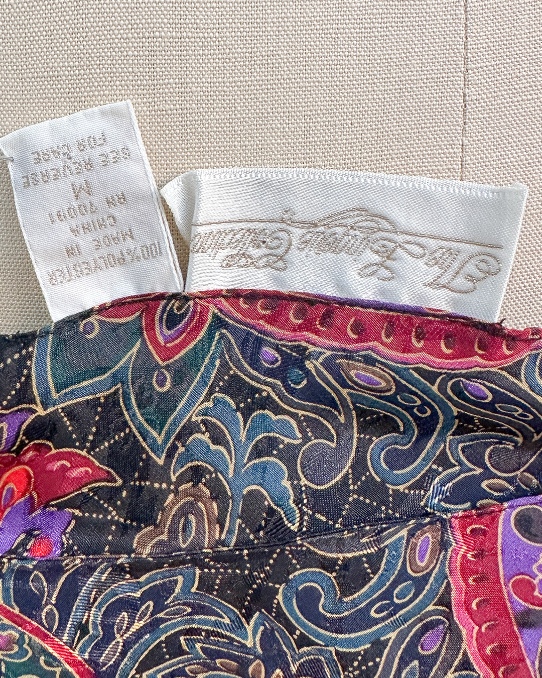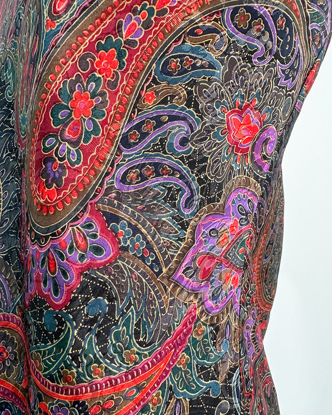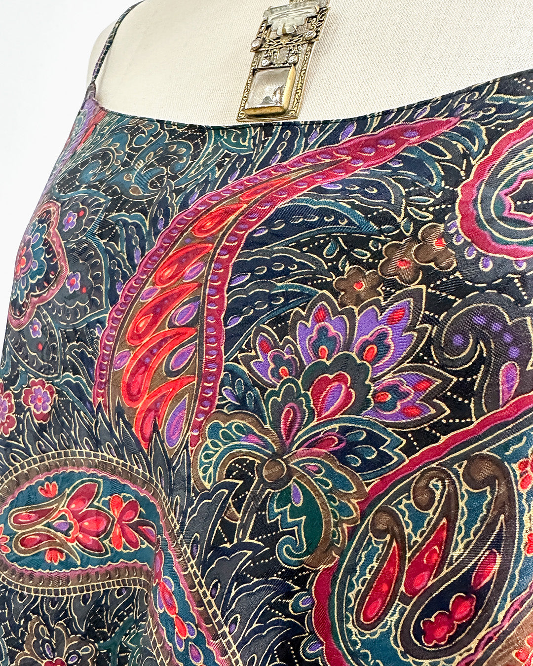 Dripping with dark allure, this 1980s paisley slip is a swirl of deep purples, reds, and golds; colors that feel conjured from candlelight and whispered enchantments. The silky fabric skims the figure, while adjustable straps and subtle side slits add just the right touch of temptation. A piece that moves between worlds, perfect for layering, lounging, or casting your own spell of vintage glamour.
