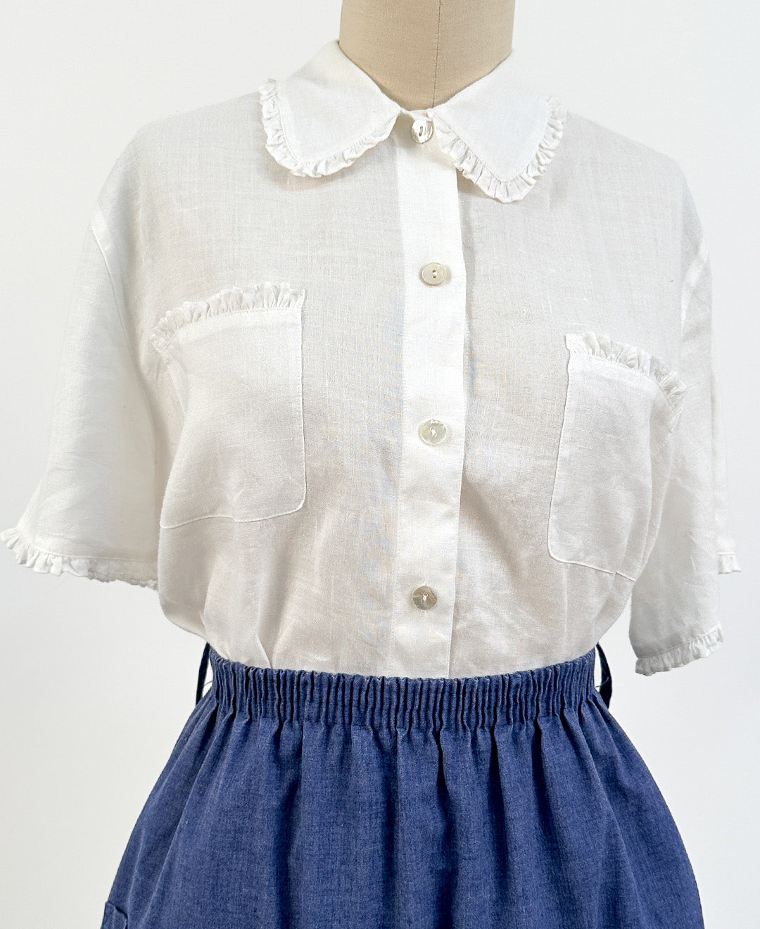 1990s White Linen Button up with Ruffles / Bust
