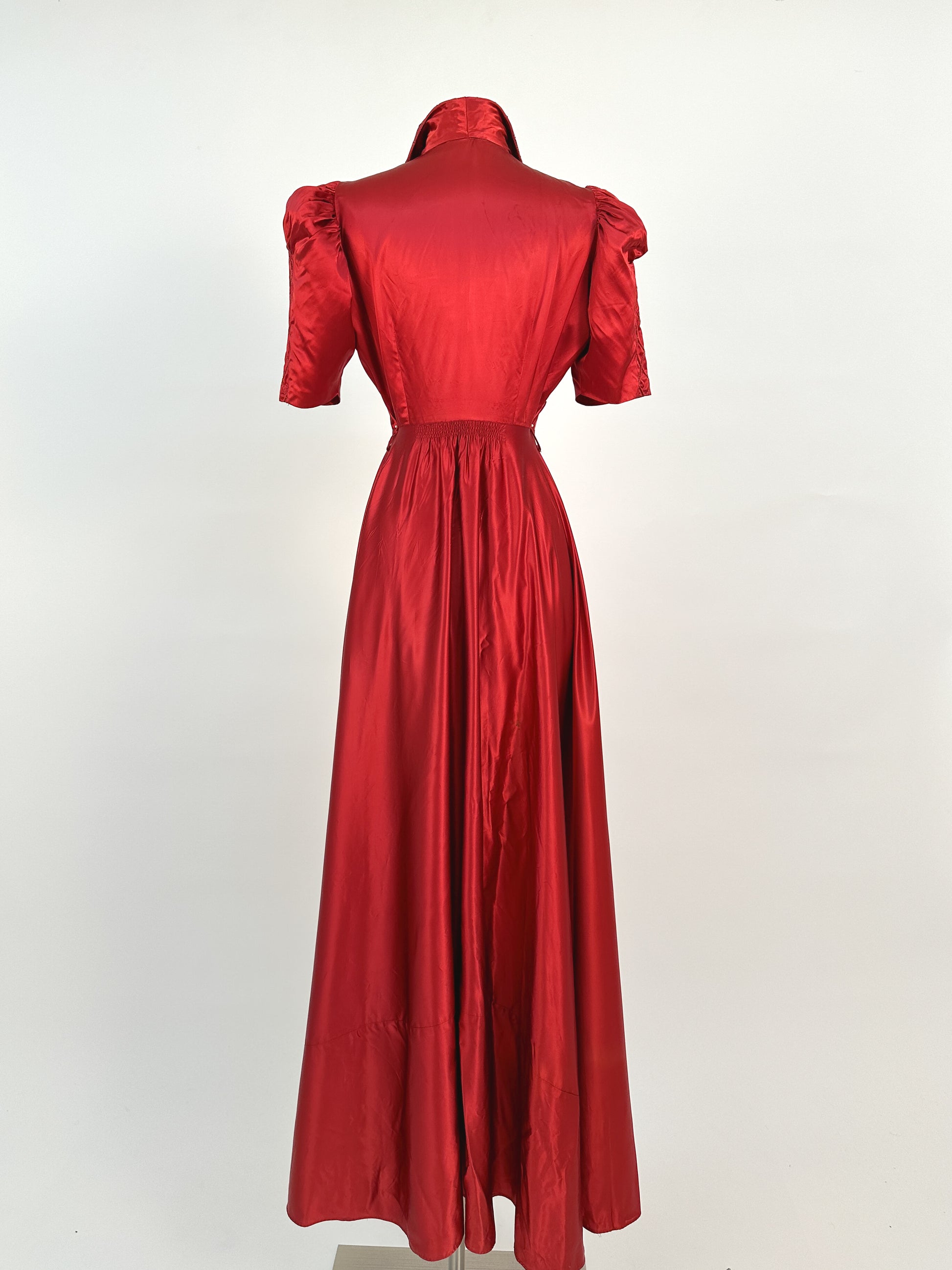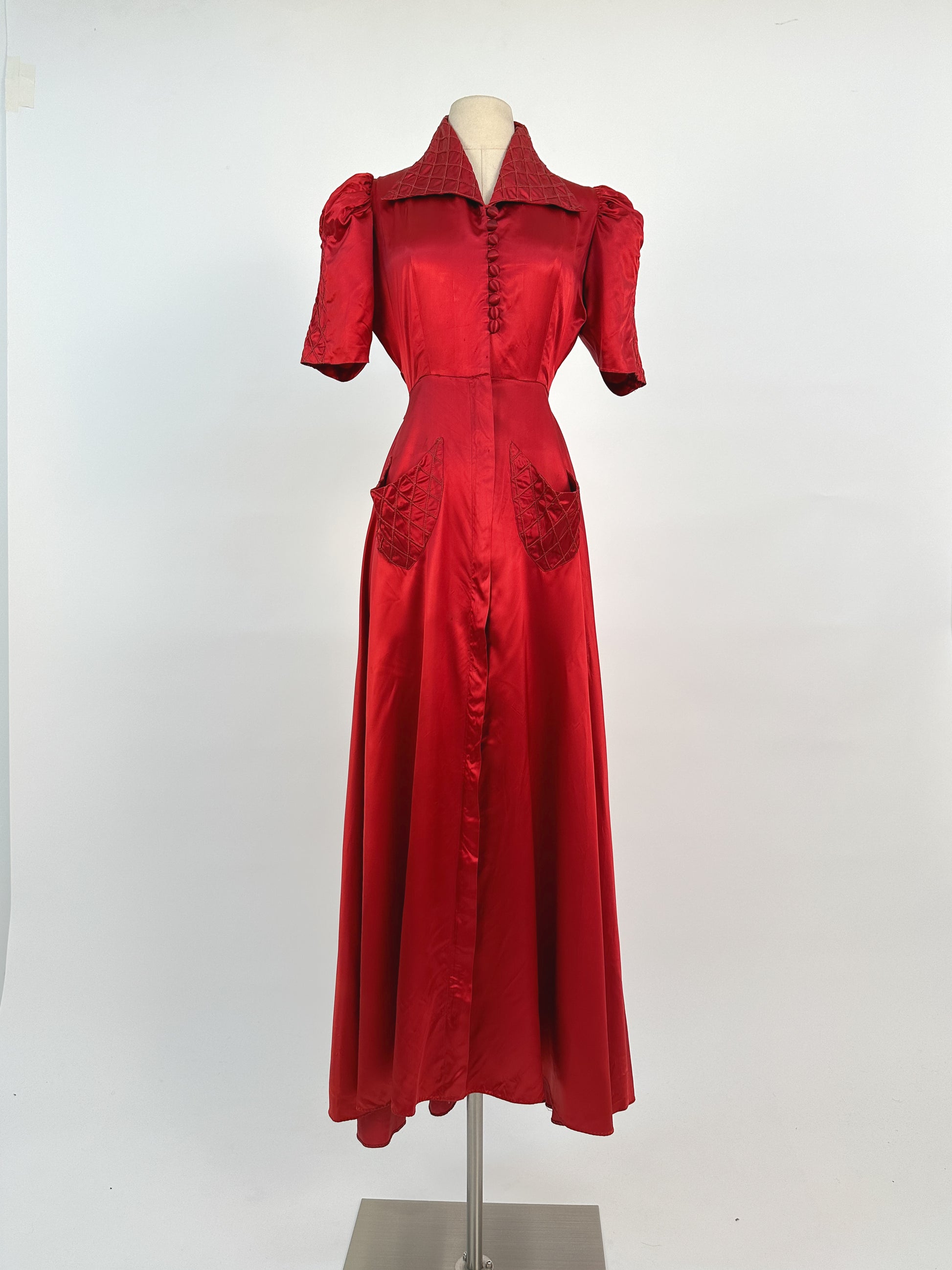 A glamorous 1940s satin hostess dress with dramatic quilted pointed collar this detail is repeated in the sleeves and pockets. The bodice is fitted with covered buttons and puffy sleeves. The skirt has a lovely amount of fabric with sweet scoop pockets, a low/high hemline and a front metal zipper that is the length of the skirt.