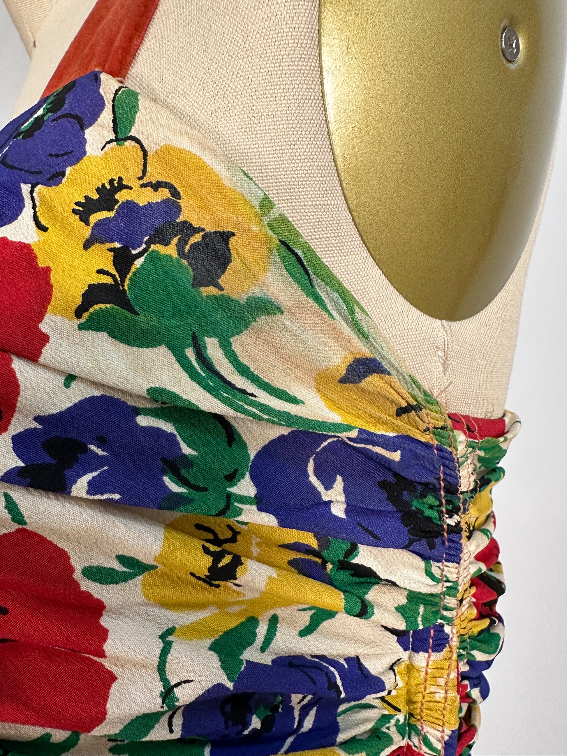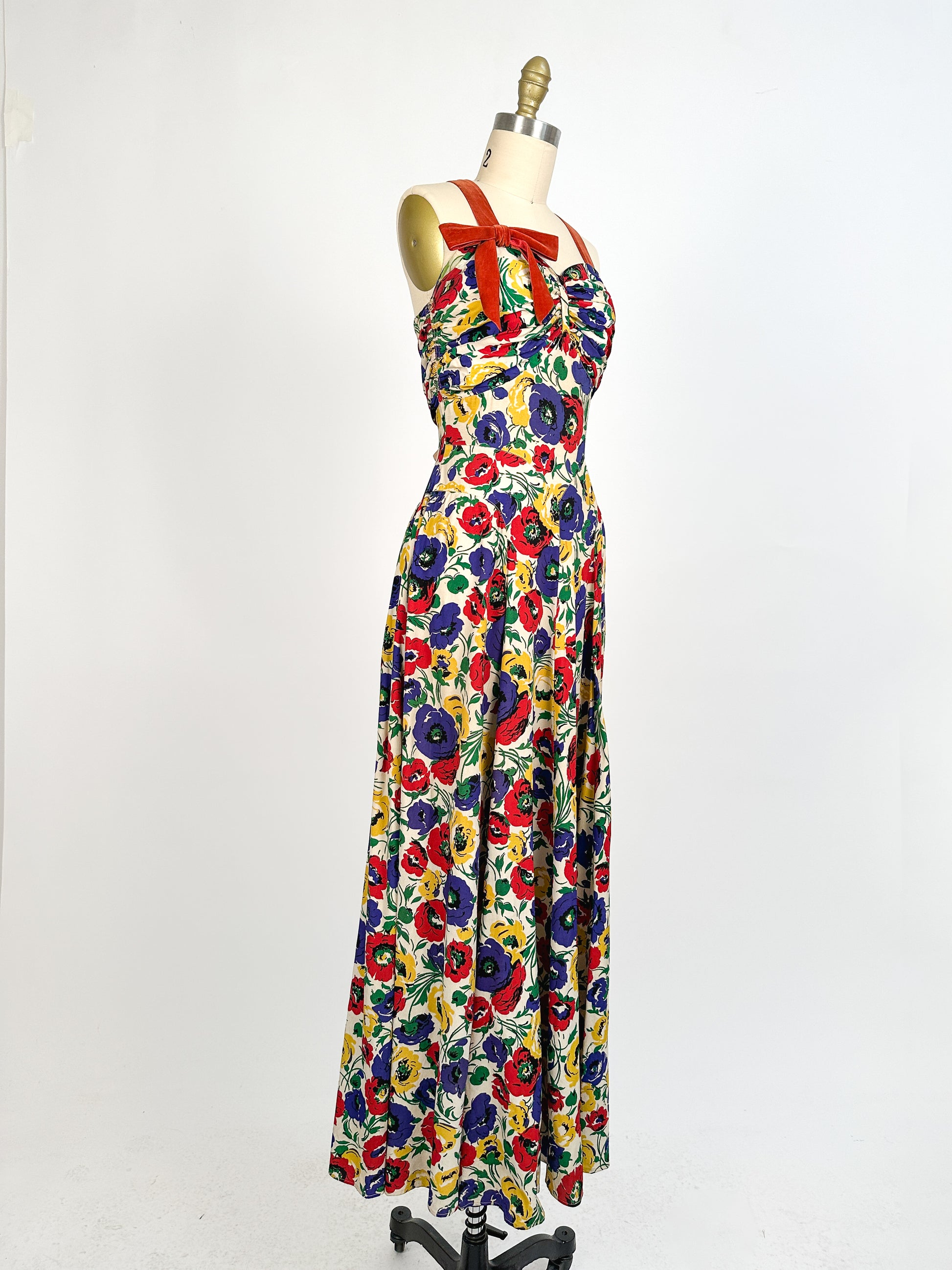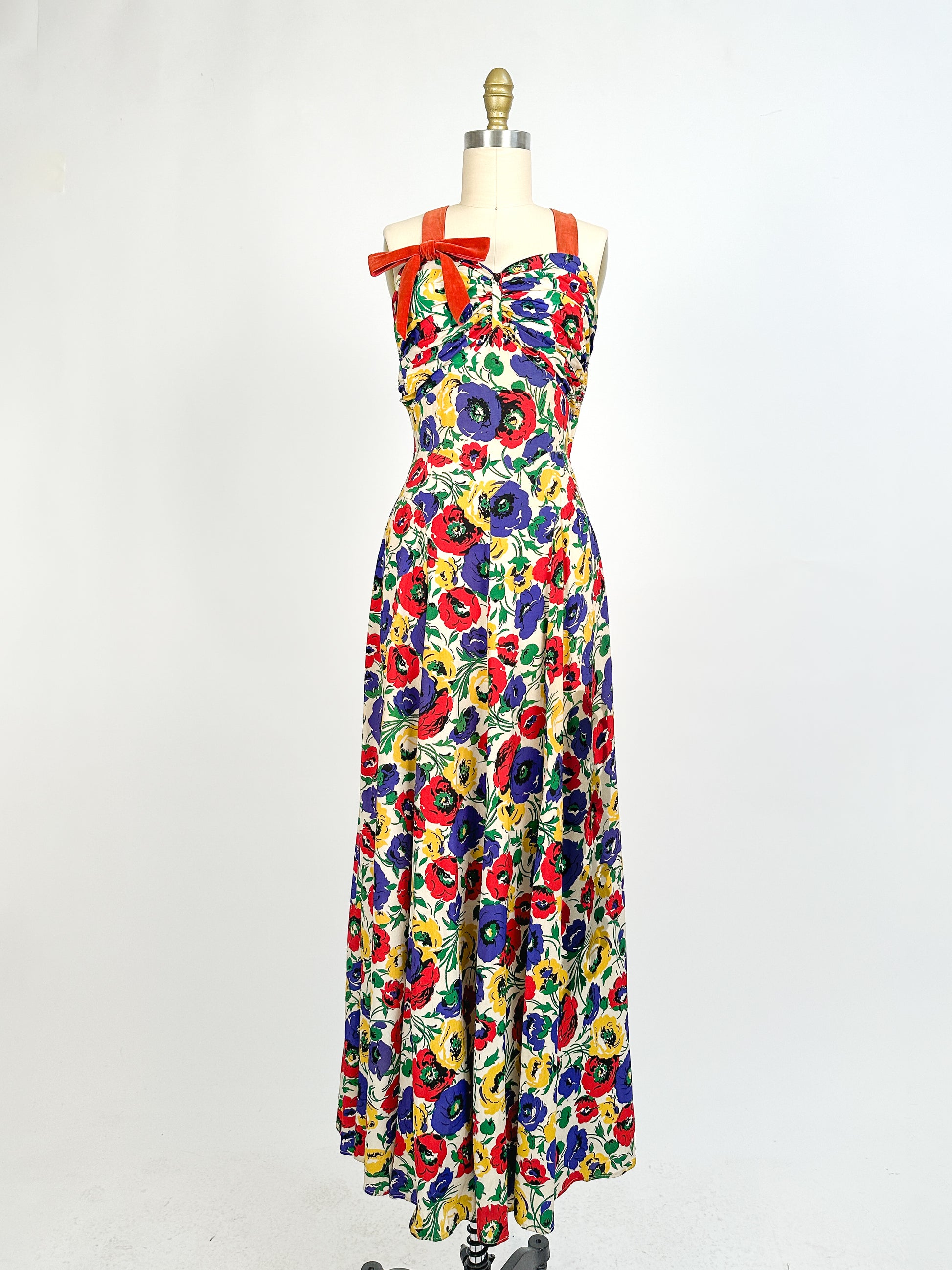 These dresses are so rare in this full length. A bright primary colored floral print of poppies and leaves. A ruched sweetheart neckline with a matching ruched back. The construction of the dress is remarkable. A diamond shaped waistline with gored skirt and to side panels that gather in the back to add volume to the skirt. A hidden side metal zipper closure in true 1930s fashion, where the zipper is placed in the middle of the waistline. The red orange velveteen ribbon does not look original to the dress, but I think it was tastefully added, possibly to replace a broken strap. Please reach conditions.