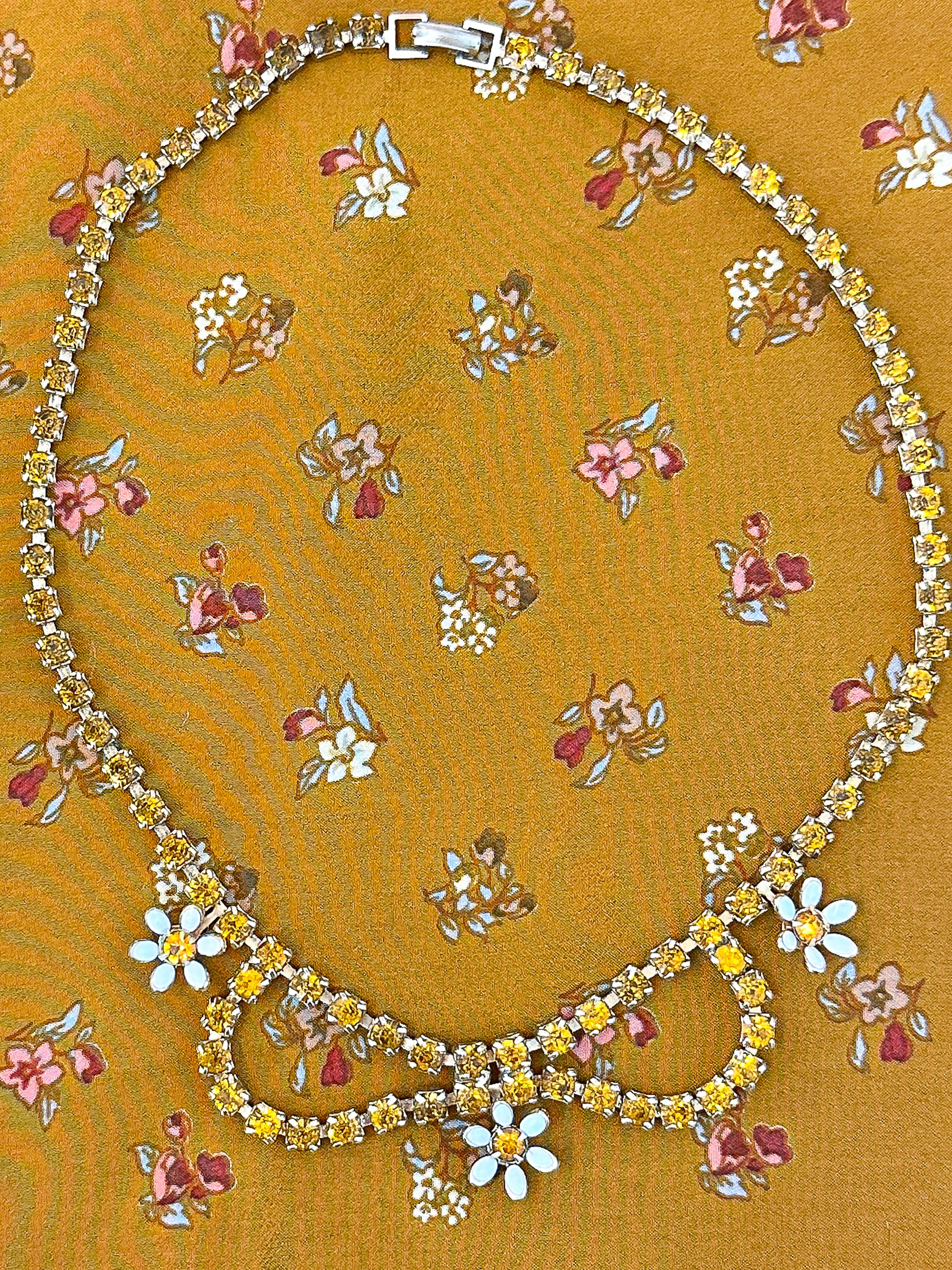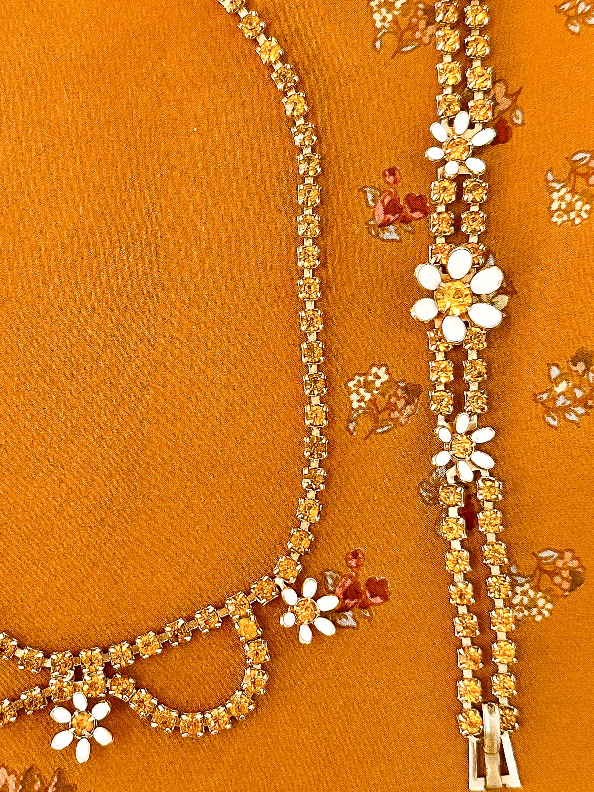 1950-60s Amber Rhinestone and Enamel Daisy Necklace/Bracelet Set