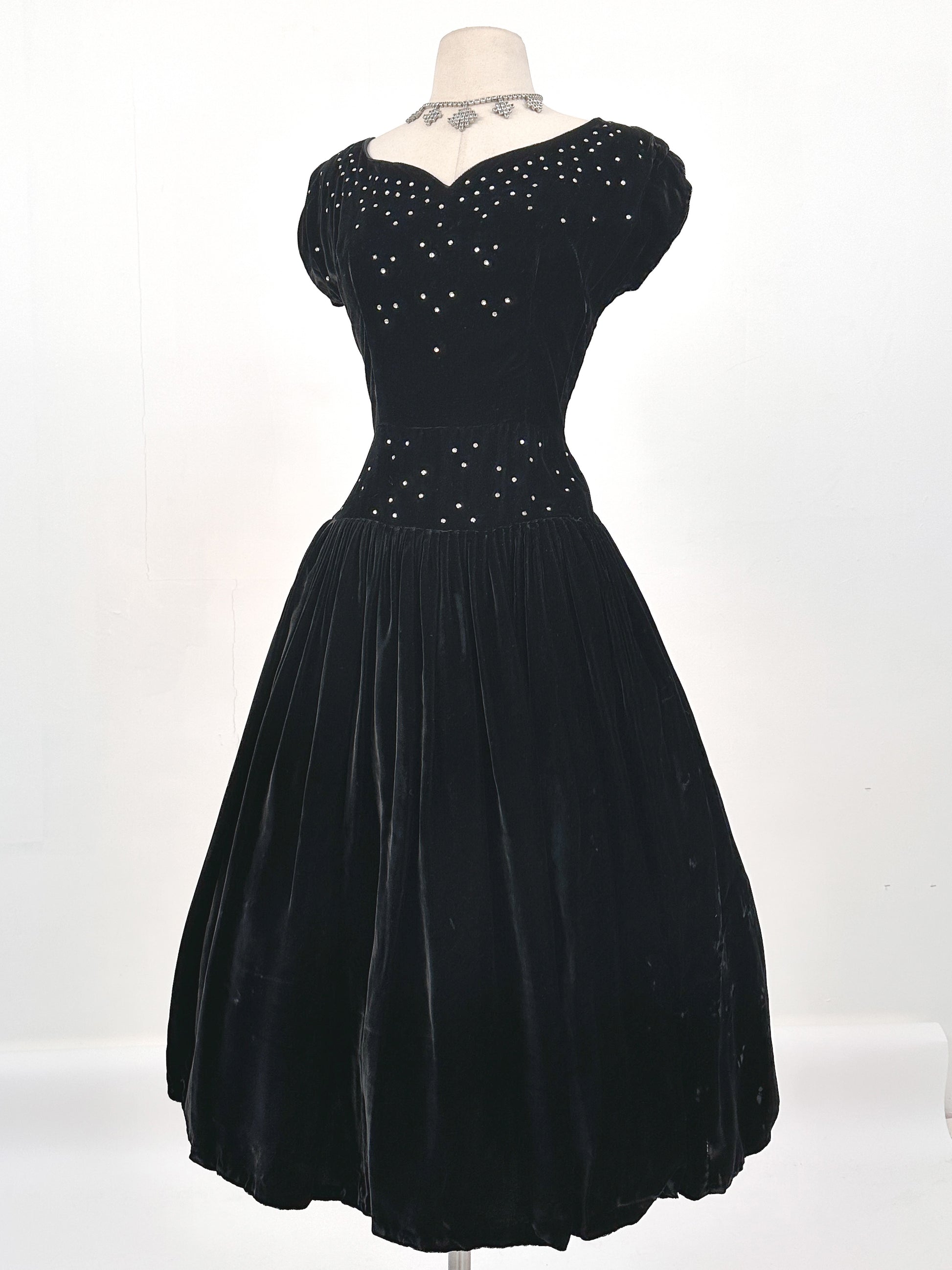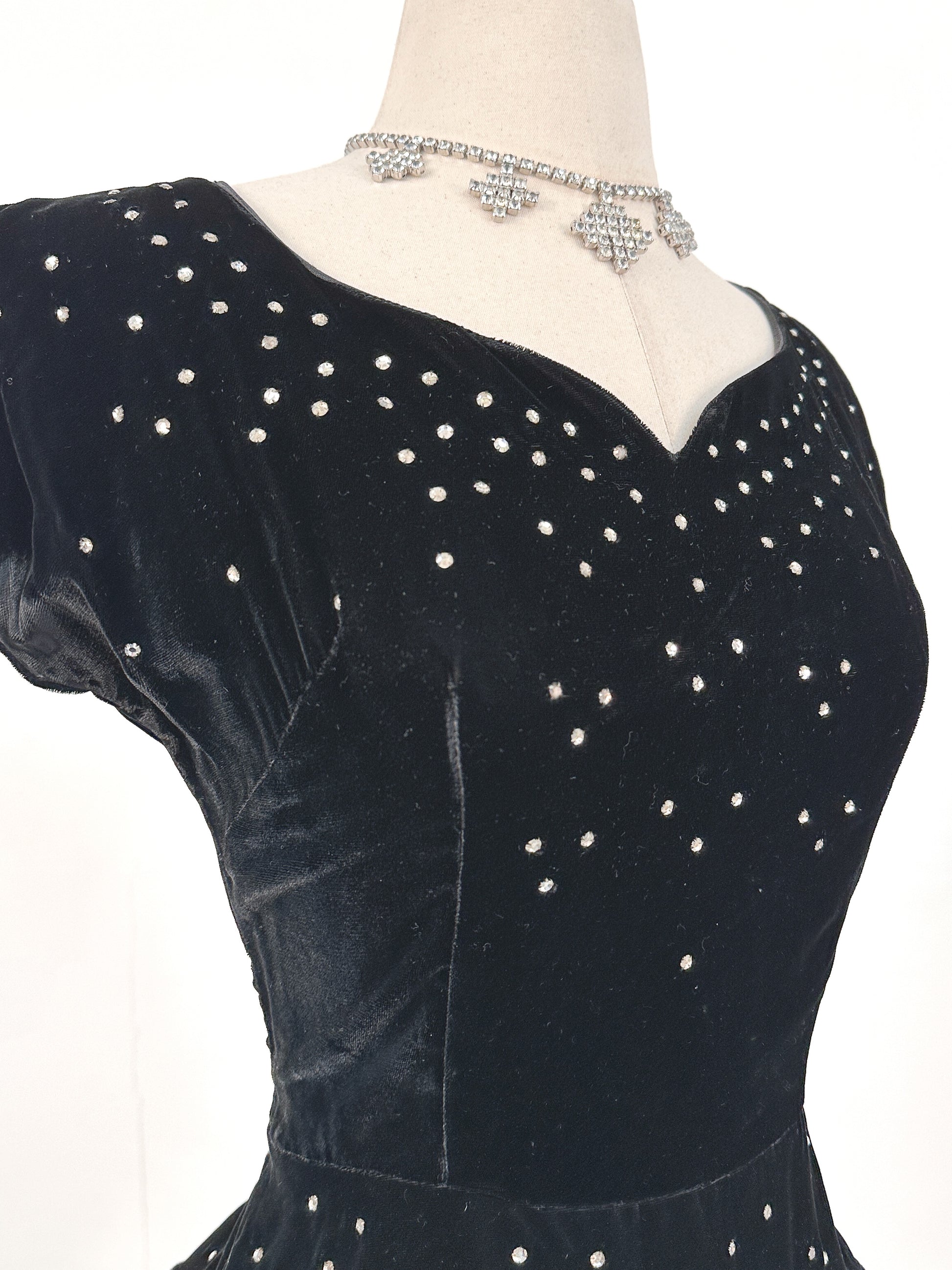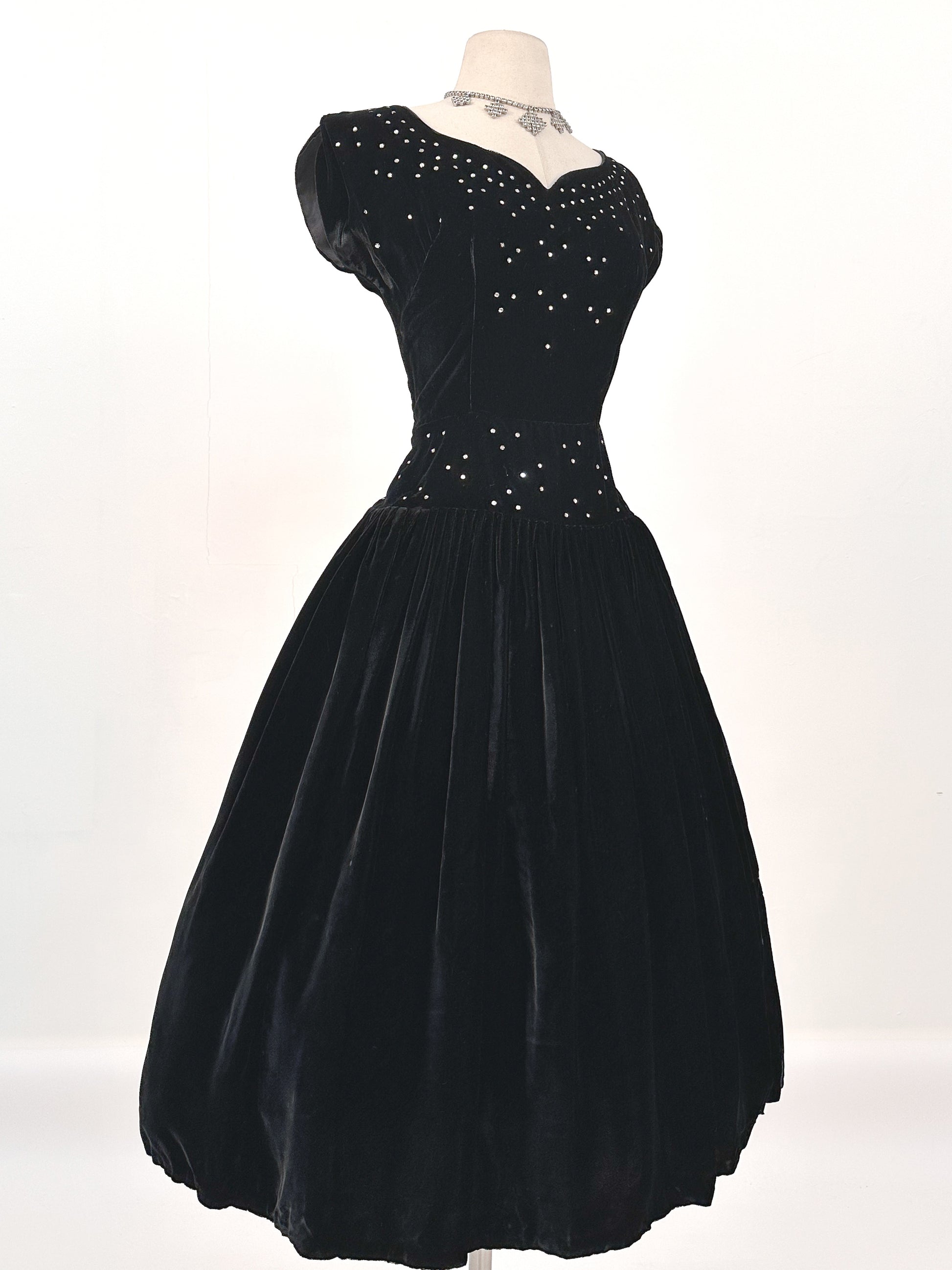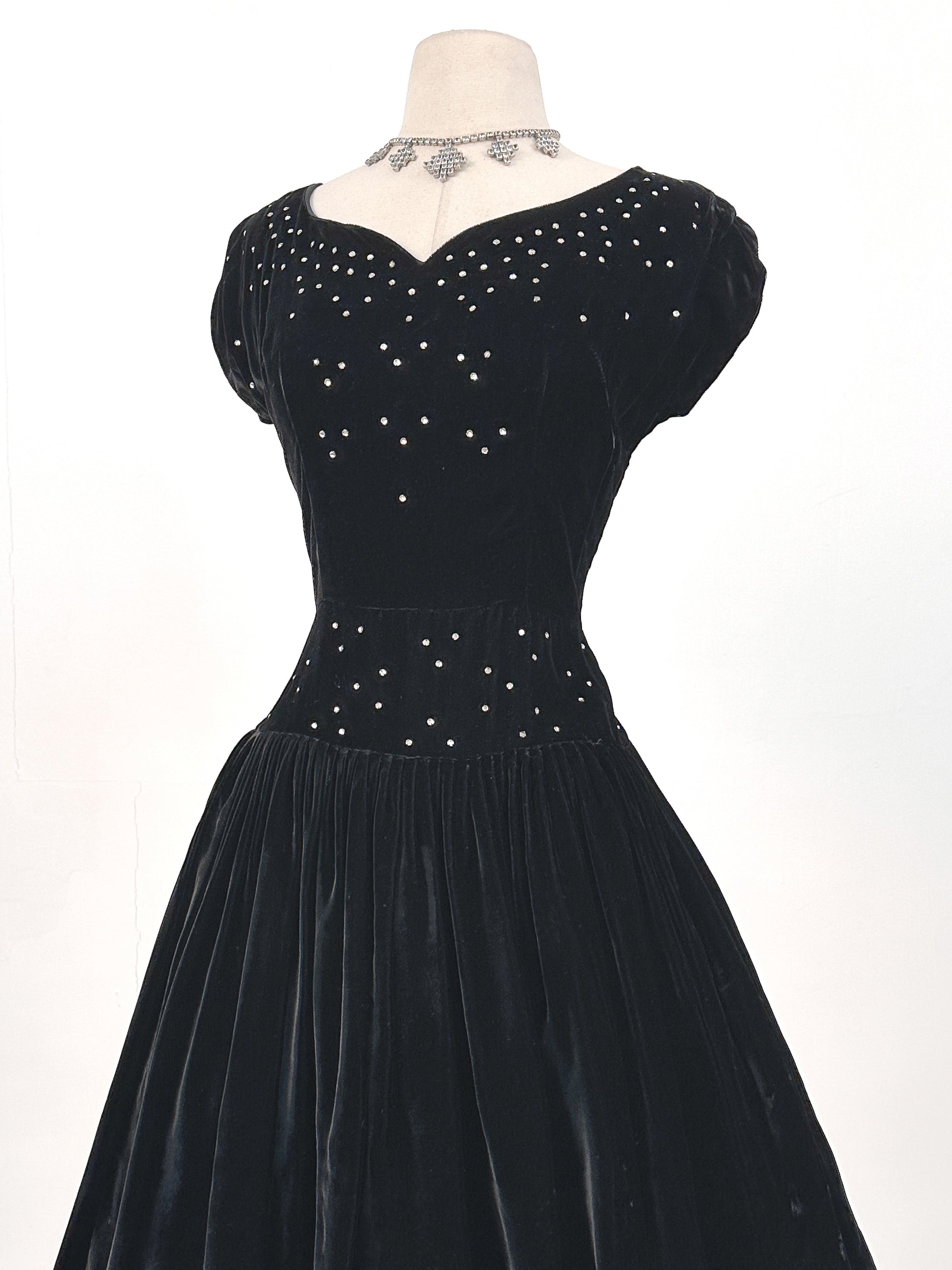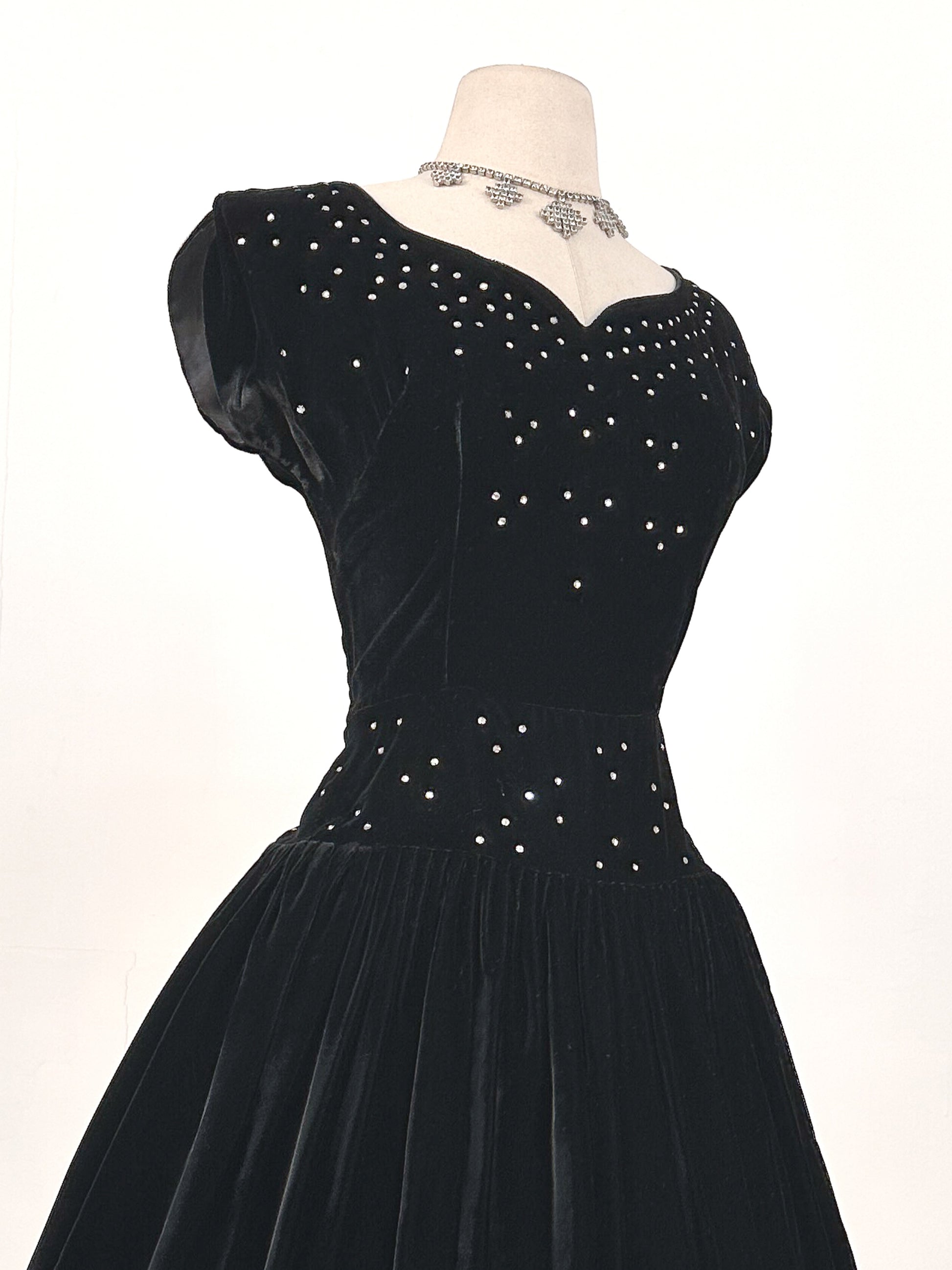 Early 1940s Black Velvet Party Dress with Rhinestones / Waist 28