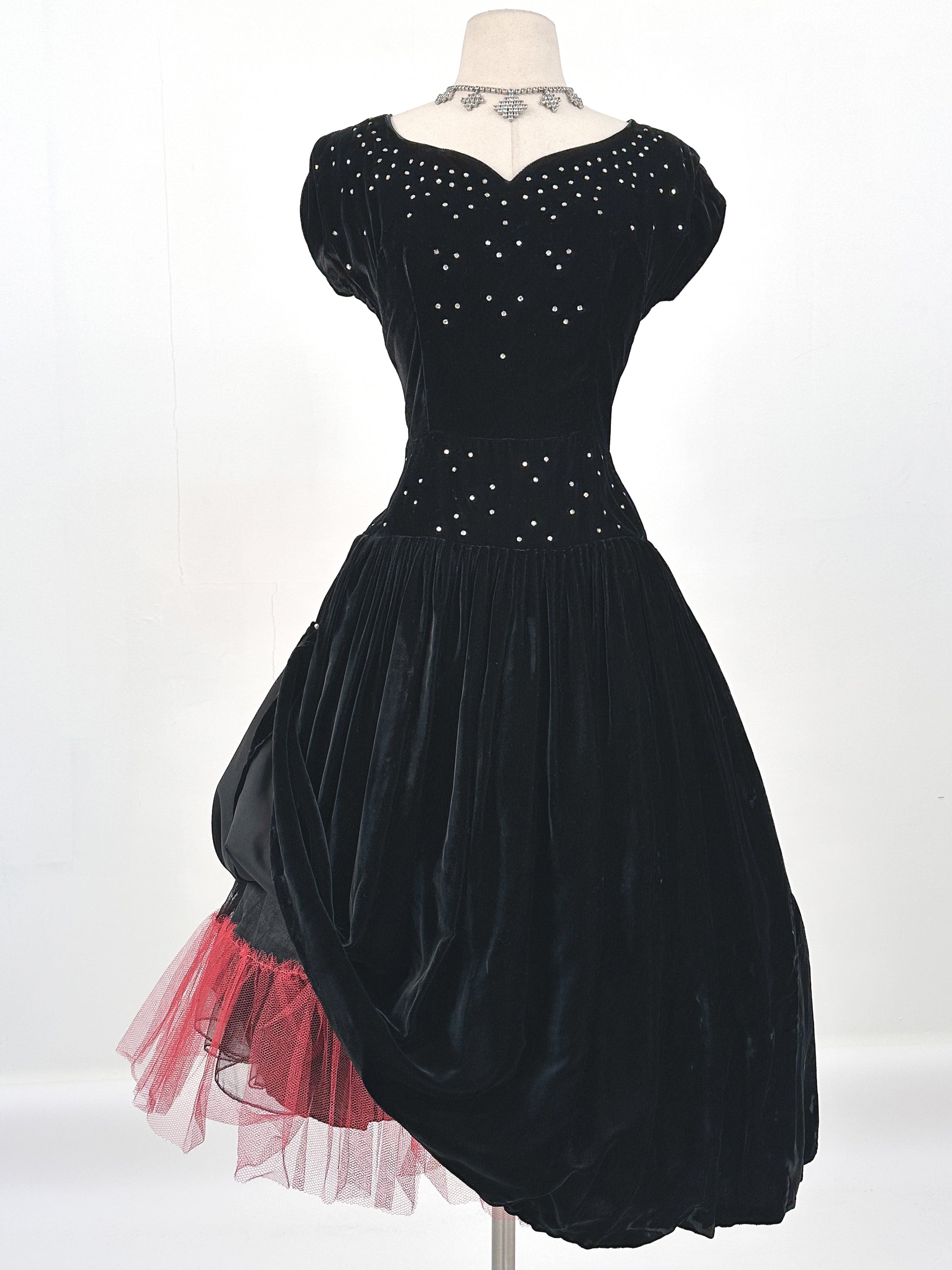 Enjoy a holiday party like a vintage fashion icon in this eye-catching 1940s black velvet party dress! A stunning sweetheart neckline covered in dazzling rhinestone bodice that matches the drop waistline. The full pleated skirt has beautiful volume with a holiday red tulle layer that offers a truly special look. Back zipper closure.