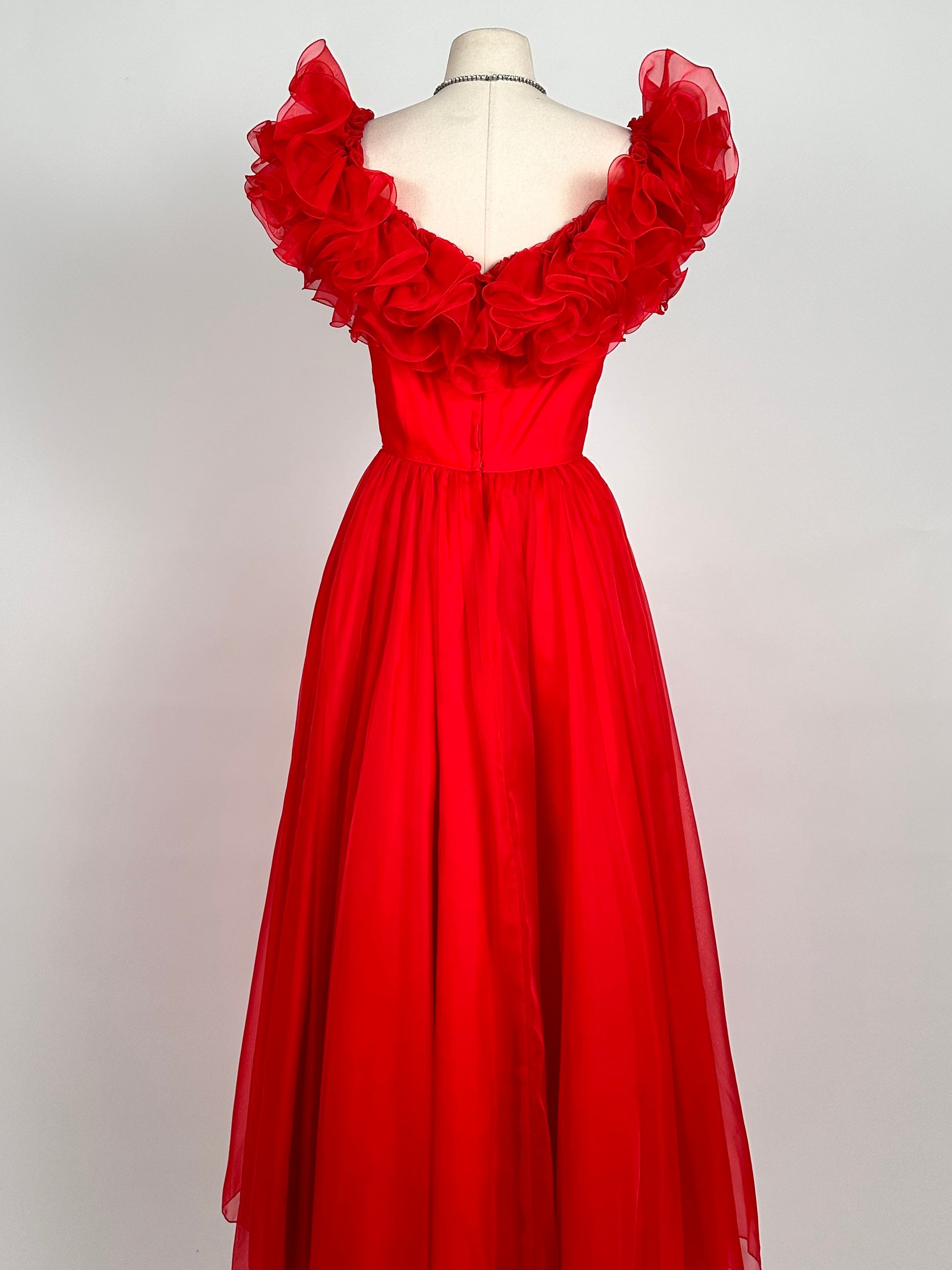 Glamorous 1980s Vibrant Red Chiffon Ruffled Gown / Waist 26