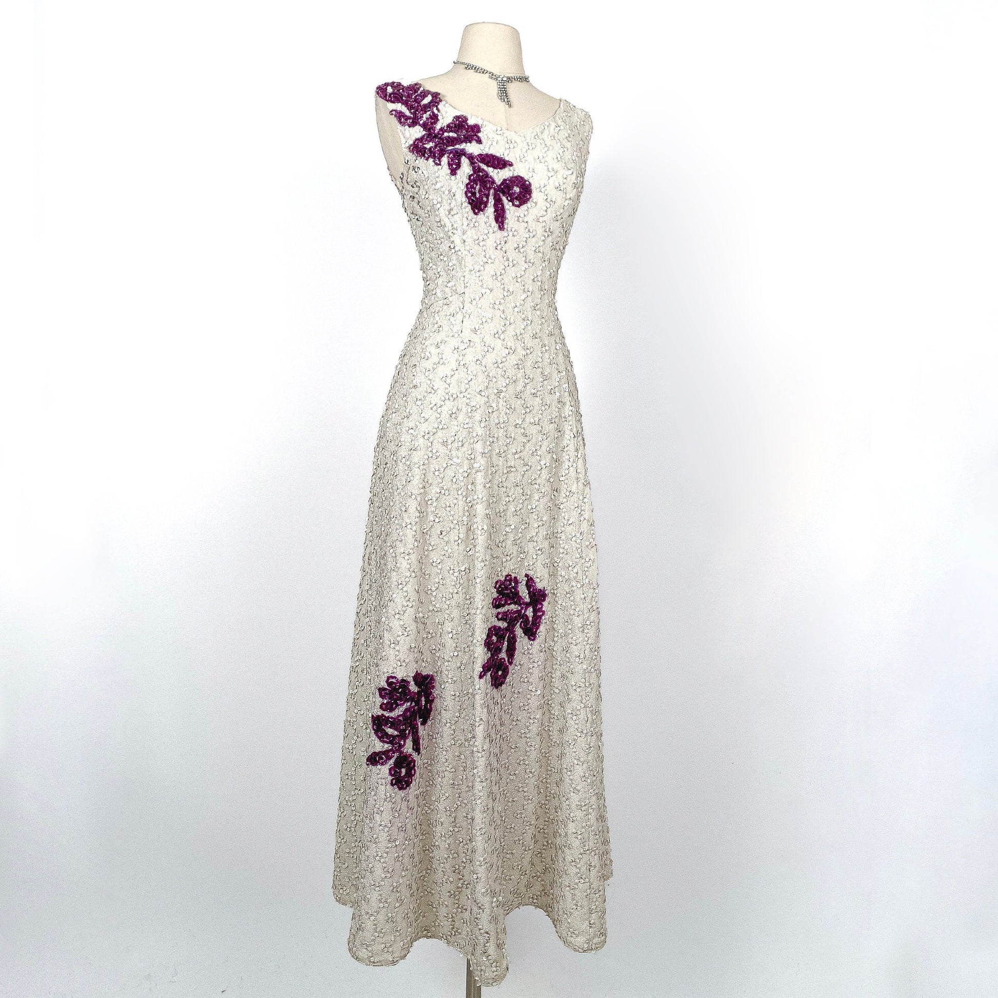 A stunning 1950-60s white sequin gown with purple sequin appliqués. Dress is fully lined and has a good weight. Back zipper closure. The shoulder appliqué wraps around the shoulder and down the bust. Two additional appliqués on the floor length skirt.