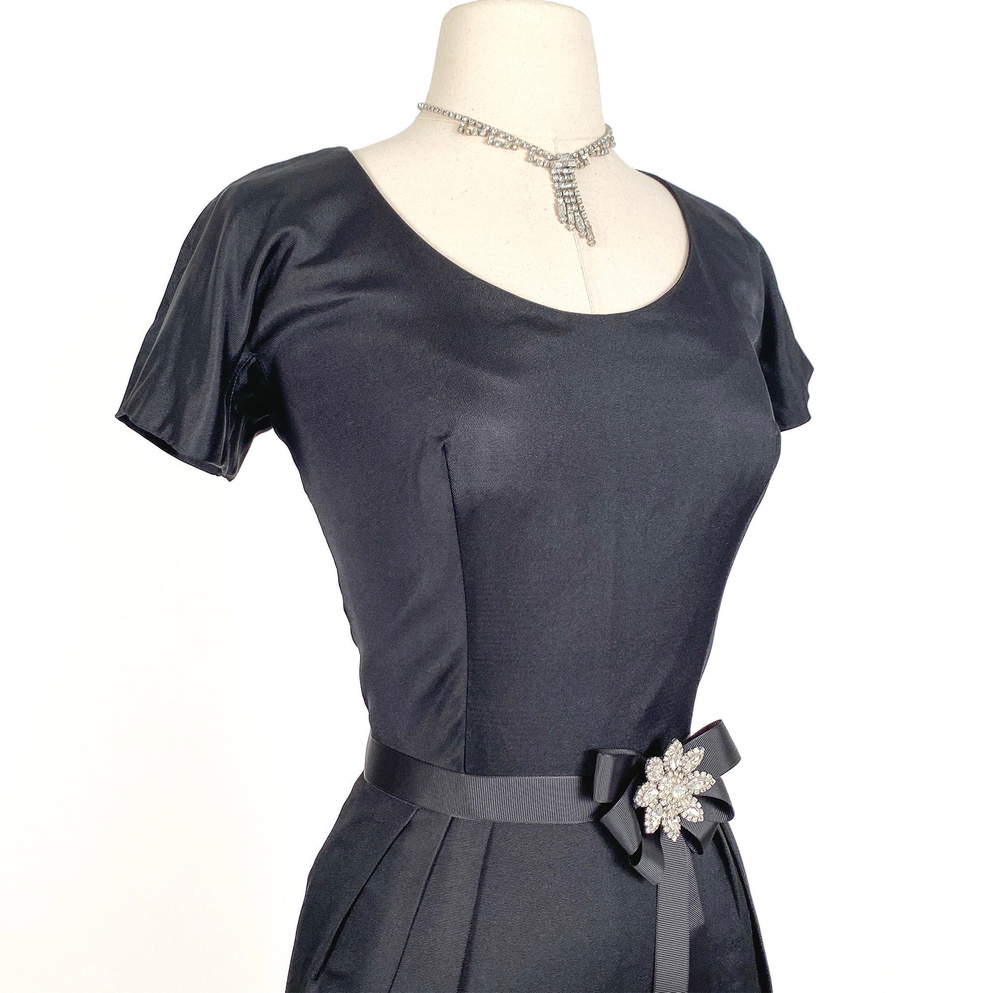 A stunning 1950s LBD by Suzy Perette with scooped neckline, short sleeves and gorgeous pleating around the waistline. Black zipper closure. A perfect dress for any occasion!