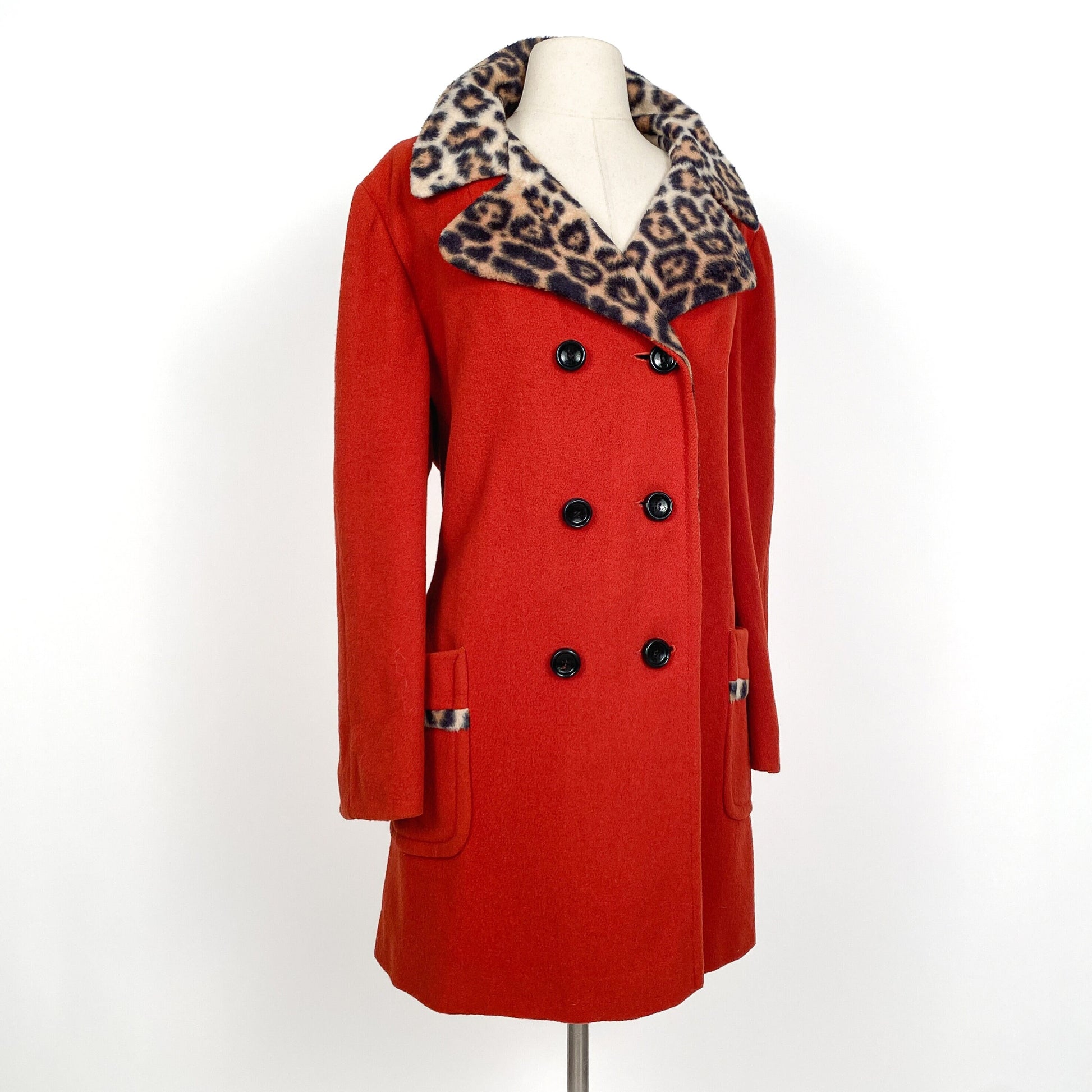 A classic 1950s red wool and leopard print peacoat. This is a vintage dream! a red wool with a tint of orange accented by a leopard print collar and black buttons. The collar is connected to the lining that fulling lines them inner coat. The sleeves are lined with a thicker black quilted fabric for extra warmth. Patch side pockets trimmed in the same leopard print.