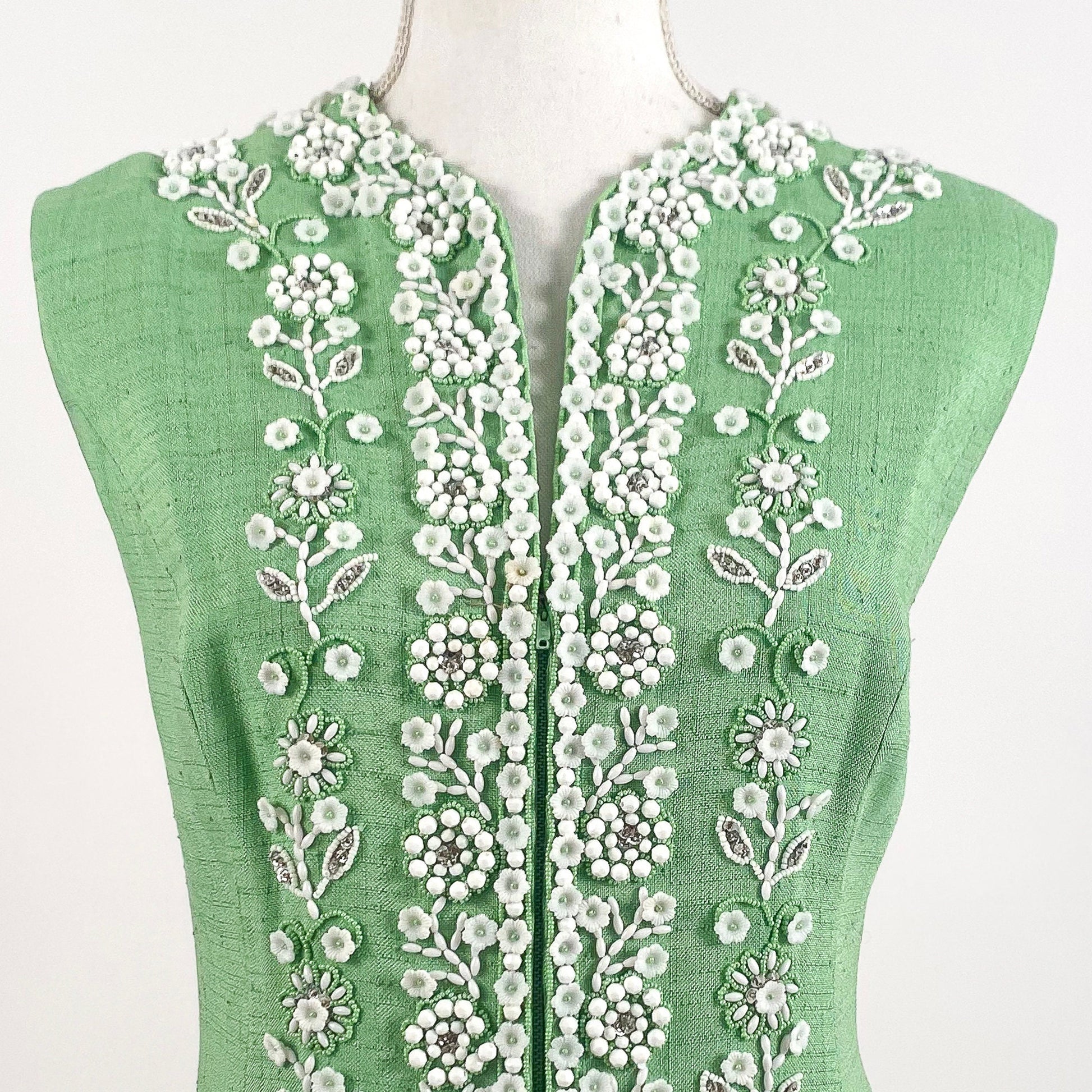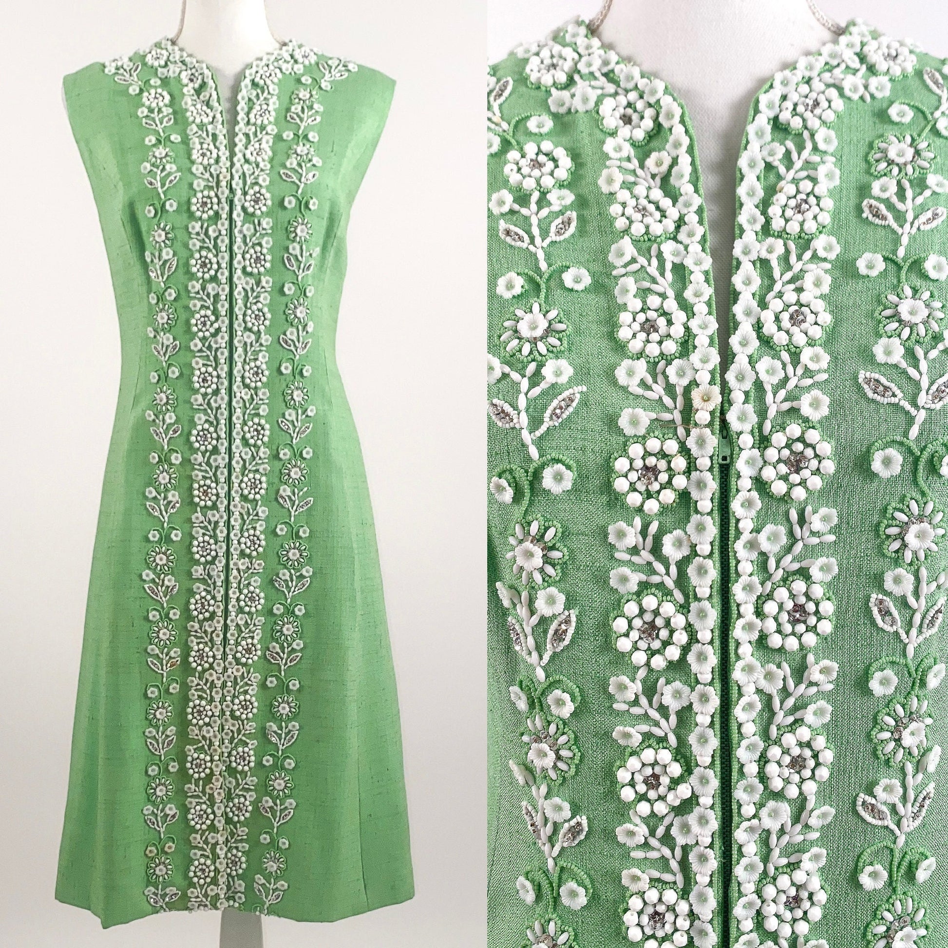 60s spring green linen shift dress with heavily beaded front trim and back neckline -- glass white beads of flowers, spheres, oblong outlined by light green seed beads, as well as, sliver sequins -- so much detail on this dress. Very beautifully constructed. The lining is sewn into the hem line to secure the stitching securing the beaded detail. Front zipper opening with covered hook/eye above the zipper for a clean look, also for support. The dress has a slit pocket located within the front seam near the hip area. Lastly, there are bra snaps on each shoulder strap, gotta love the attention to detail in this dress.