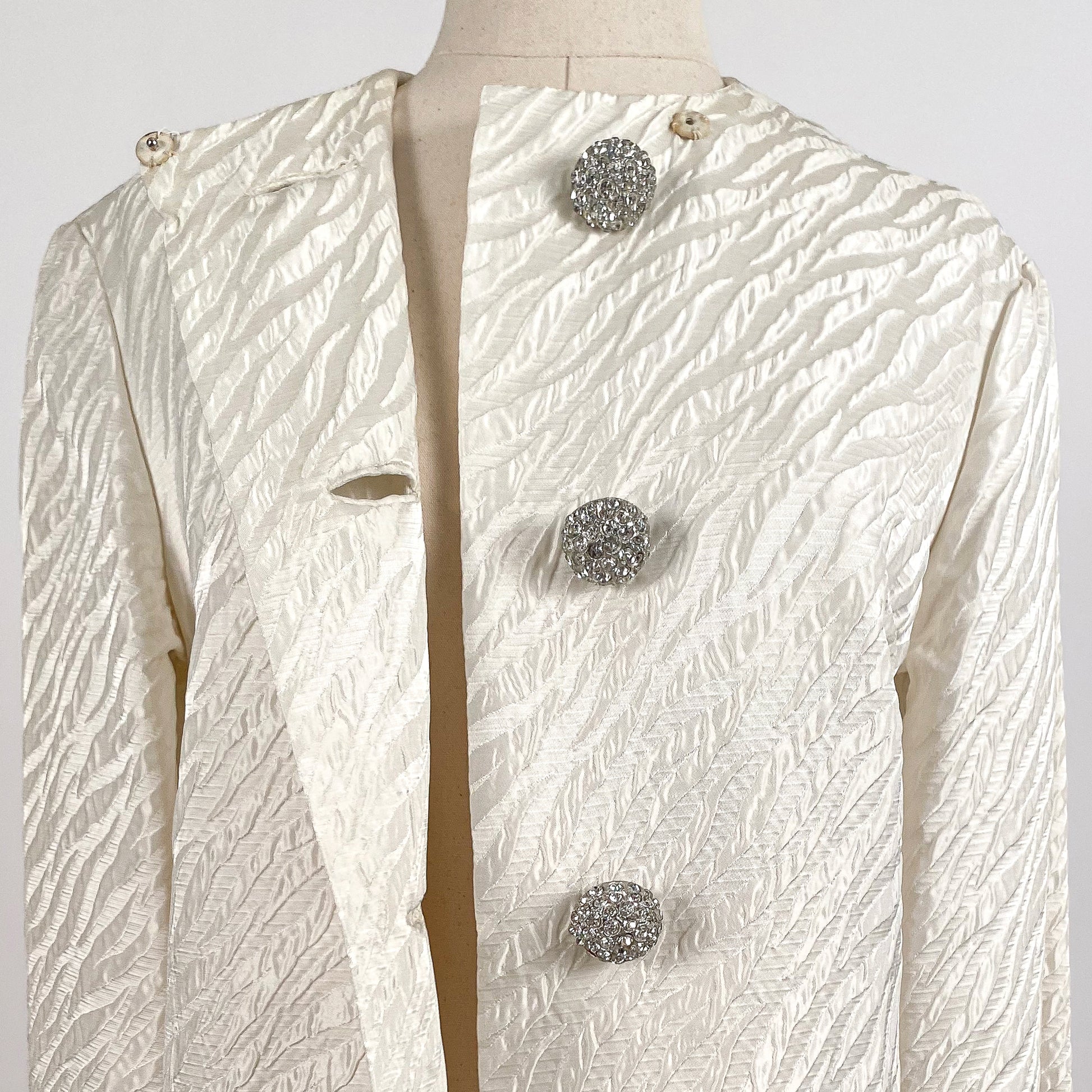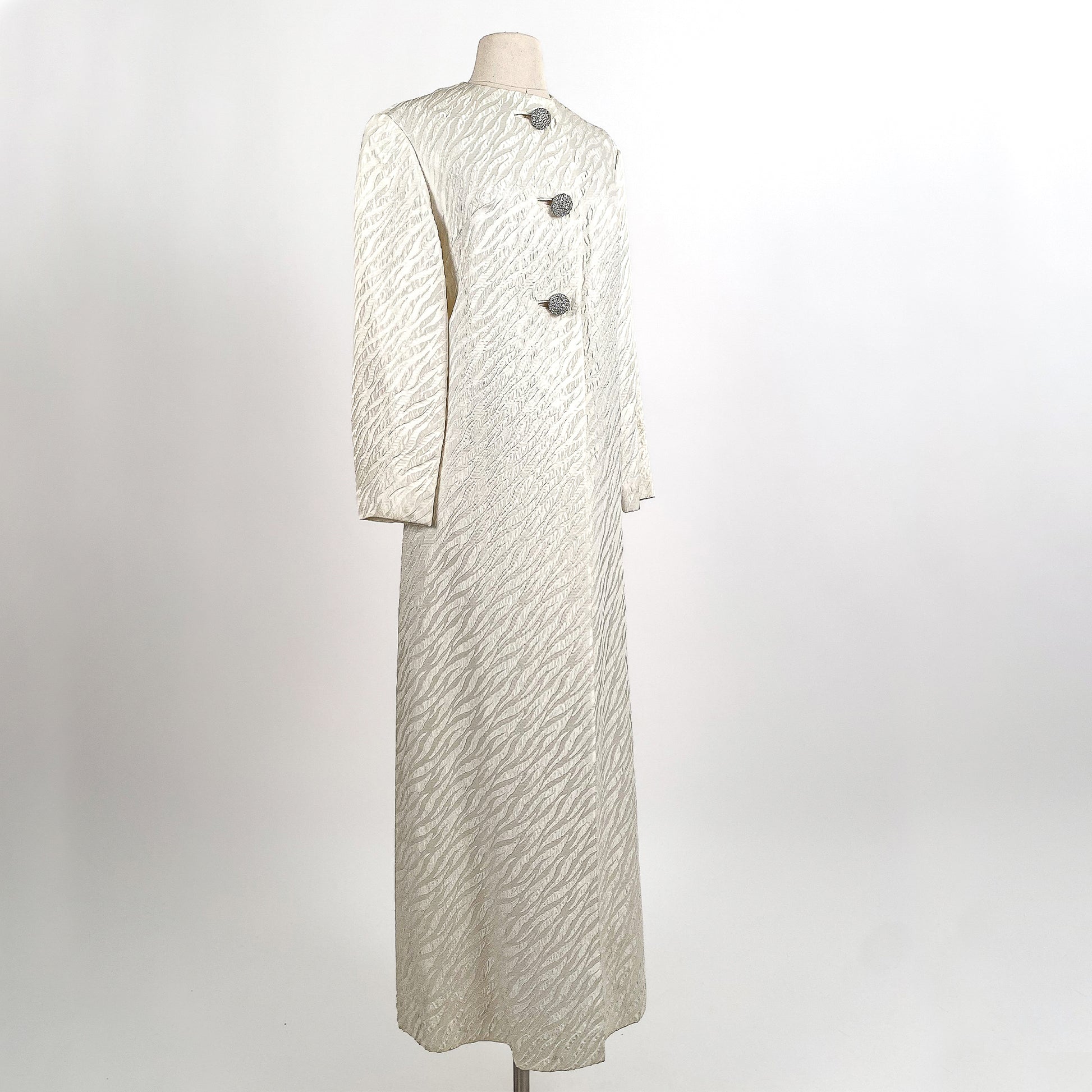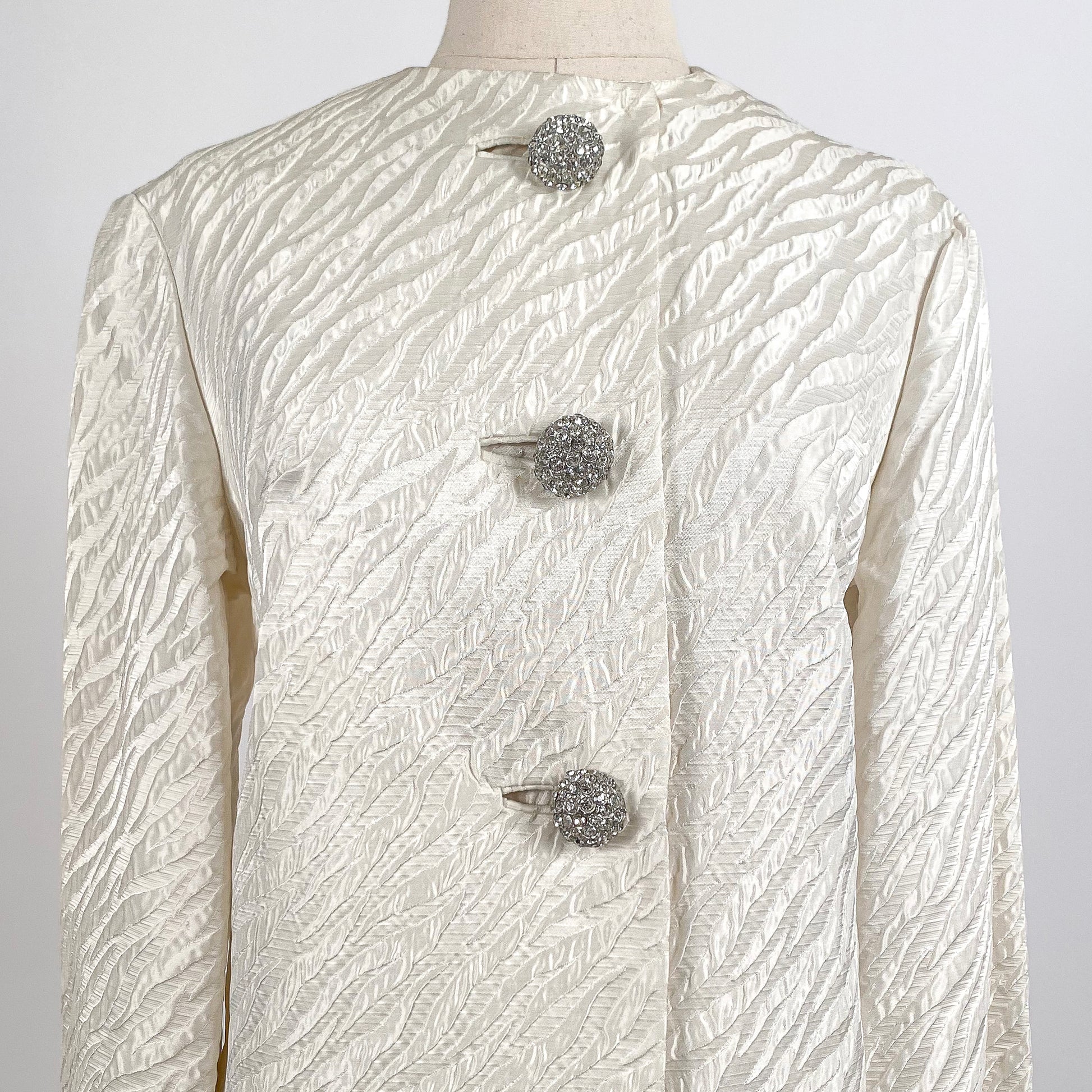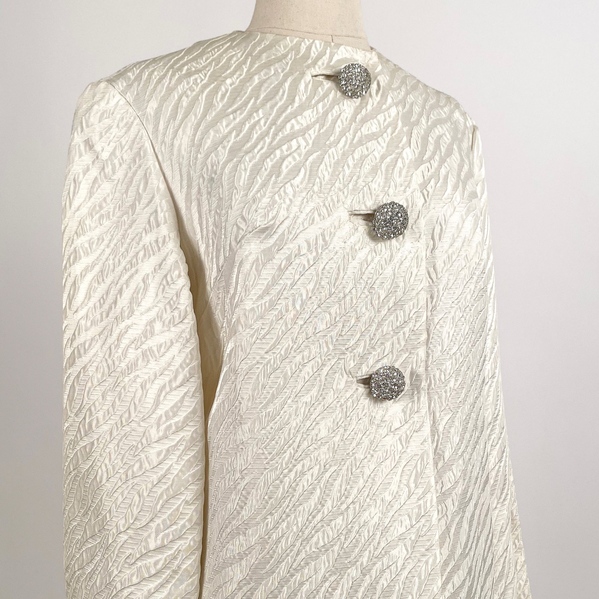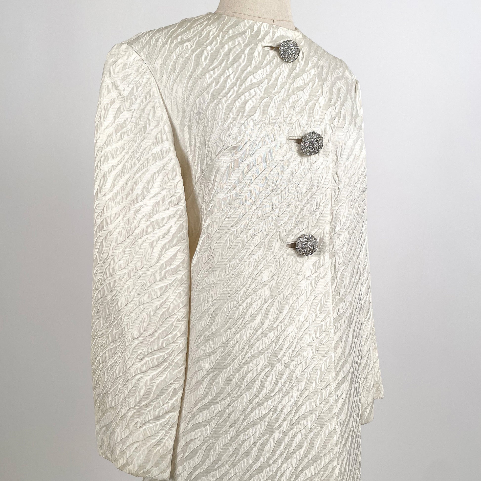 1960s White Brocade Evening Coat with Rhinestone Buttons / OSFM