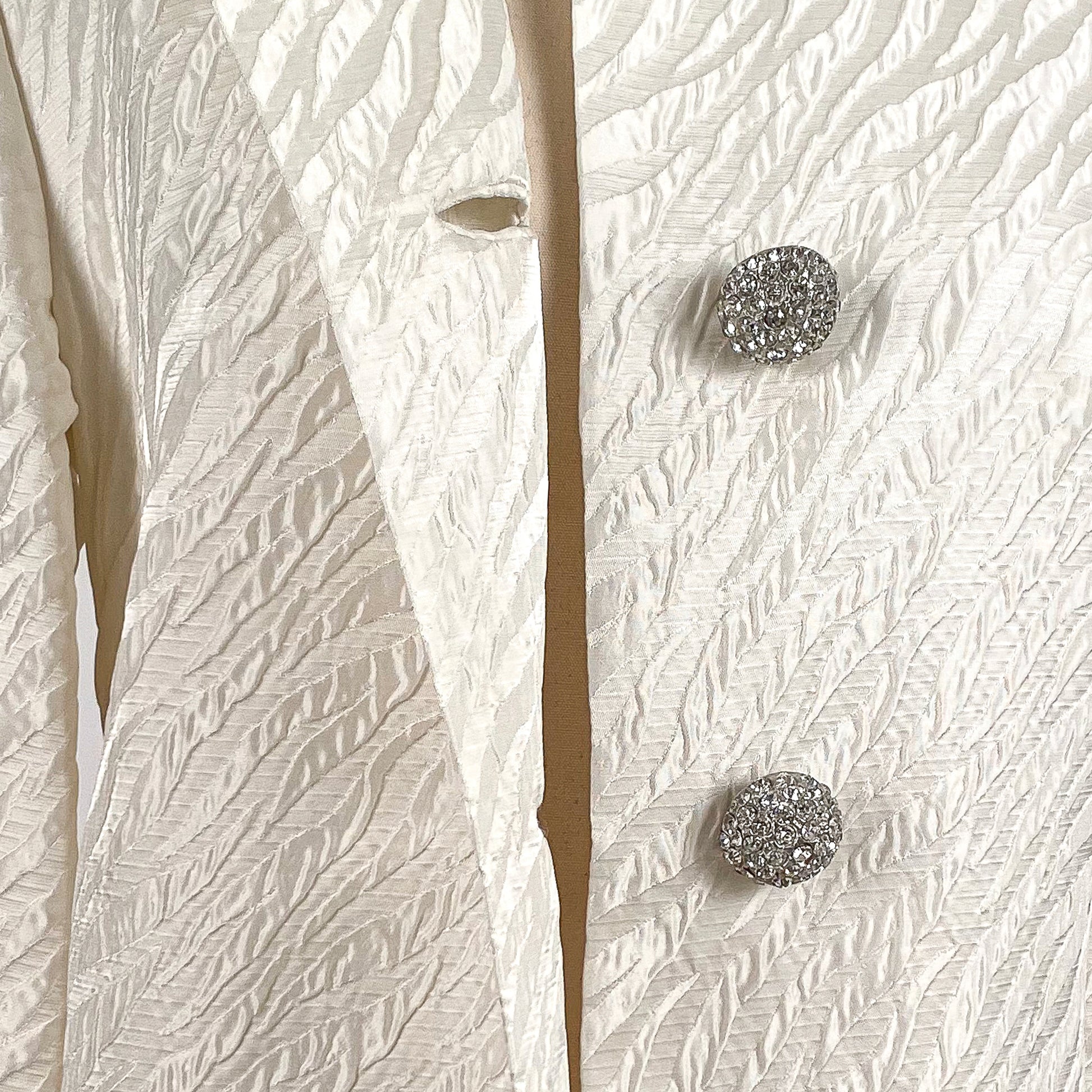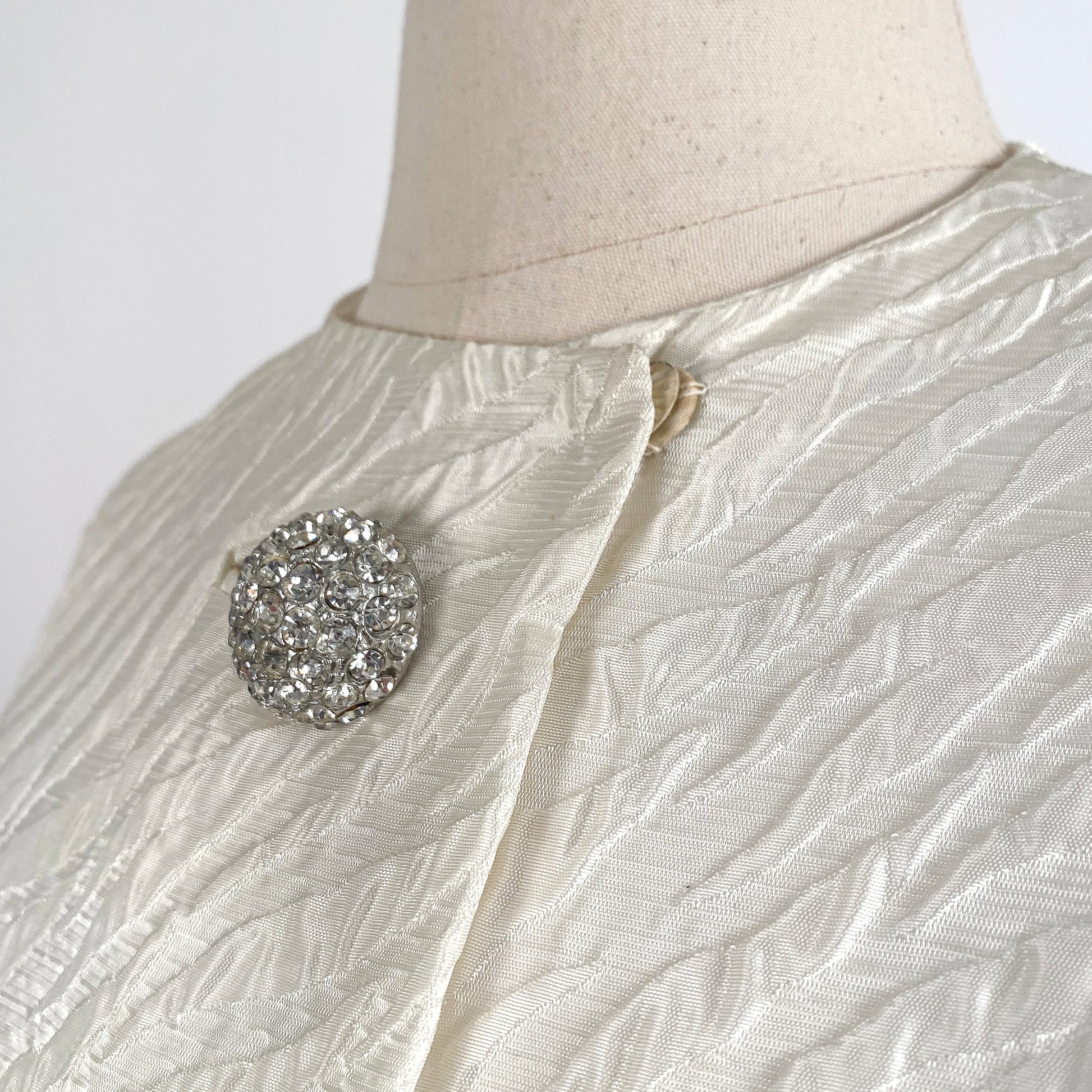 A gorgeous 1960s white embossed silk evening coat with white silk lining and three dome-shaped rhinestone buttons. The back has two slits on the back sides with an accent band on the back waistline. This coat is definitely a statement piece perfect for a bridal coat at a rehearsal dinner or pre-wedding event or to change into as the night goes on. Would make a stunner additional to any wardrobe regardless of the occasion.
