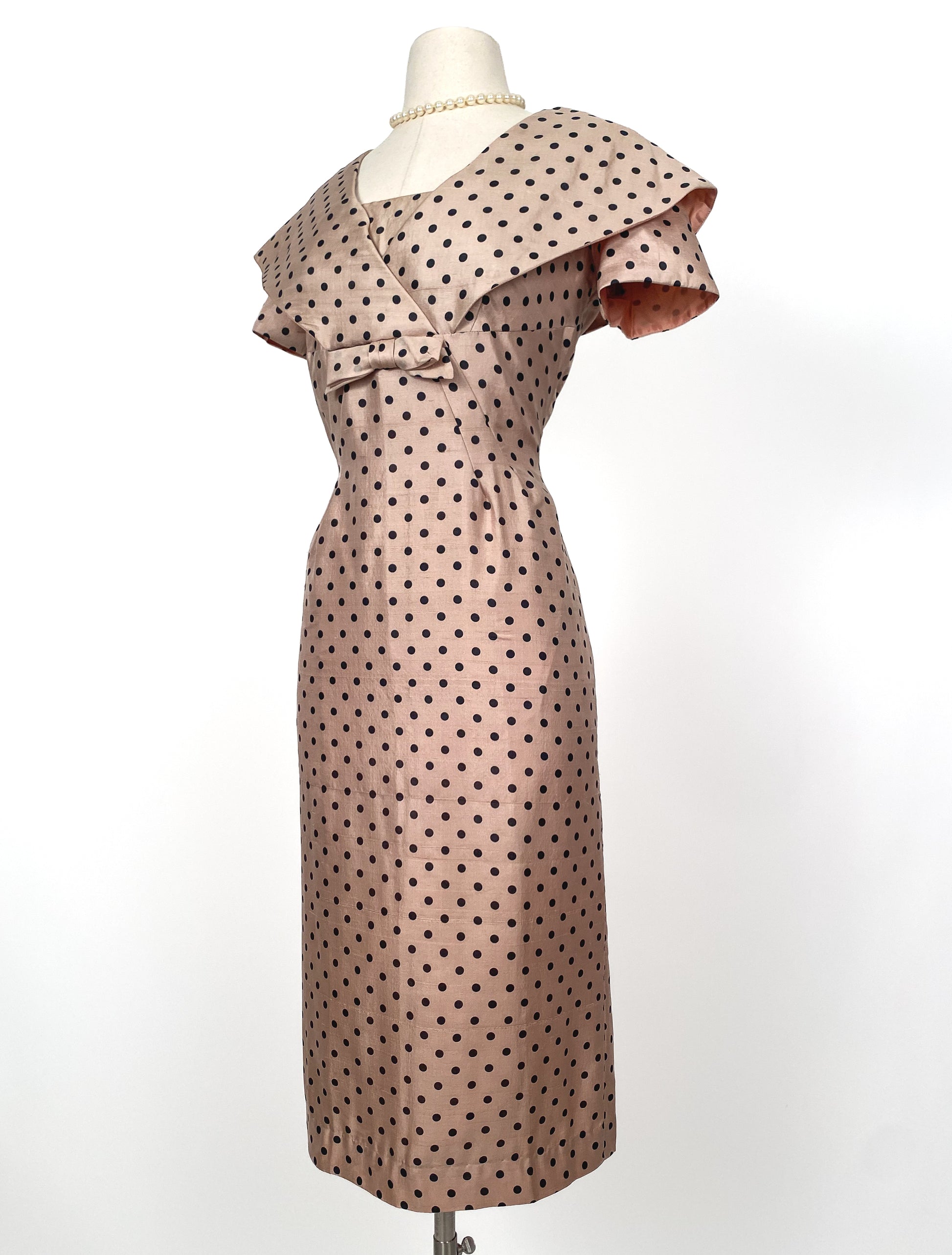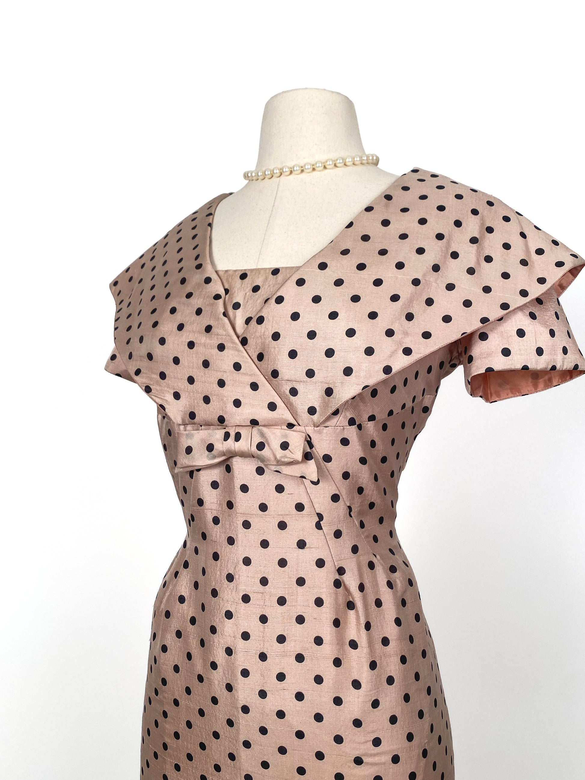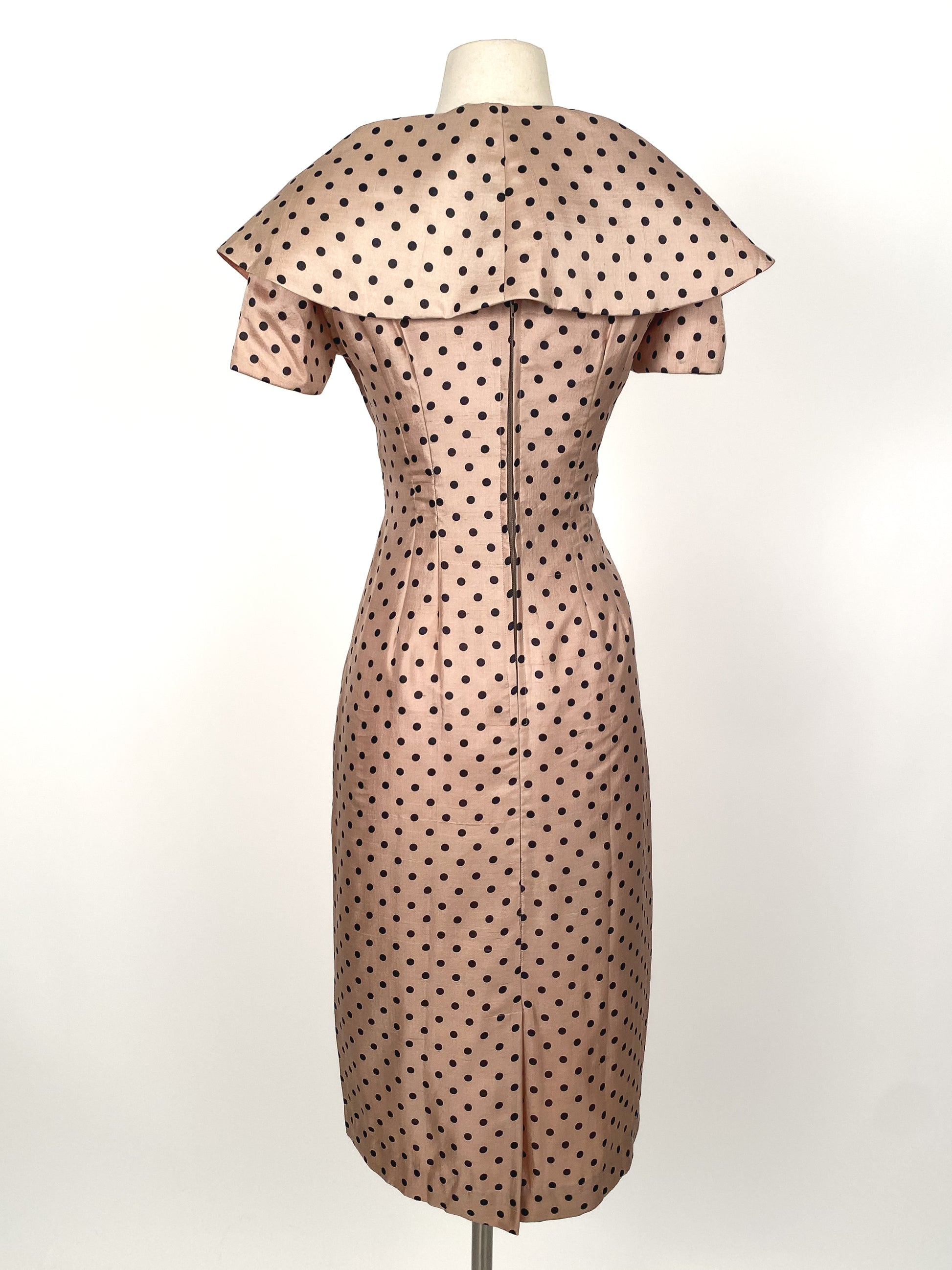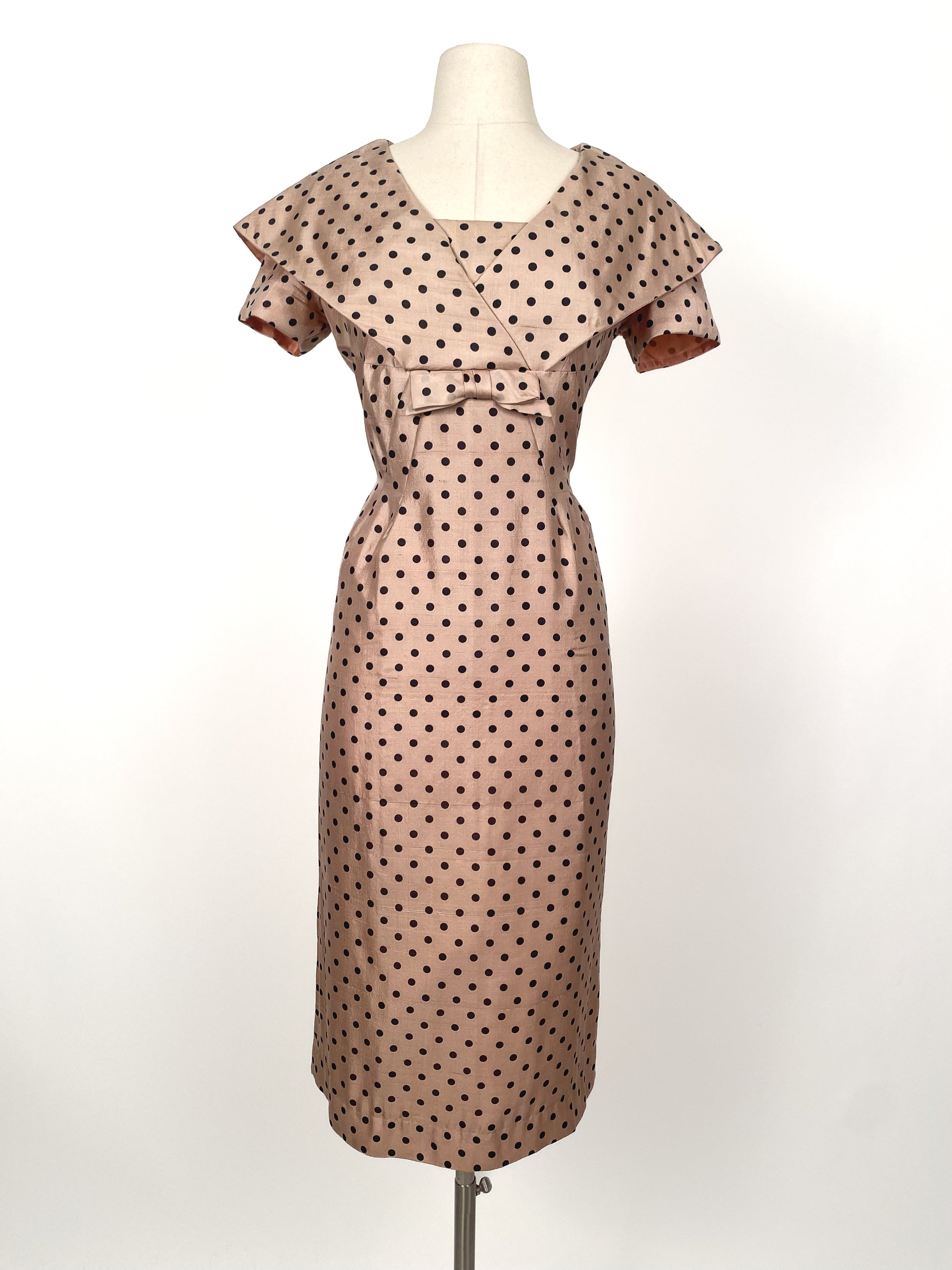 1950s beige volup dress with black polka dots. Sailor collar and bow detail at the front with metal back zipper. Darting at the waist gives this dress a gorgeous silhouette.