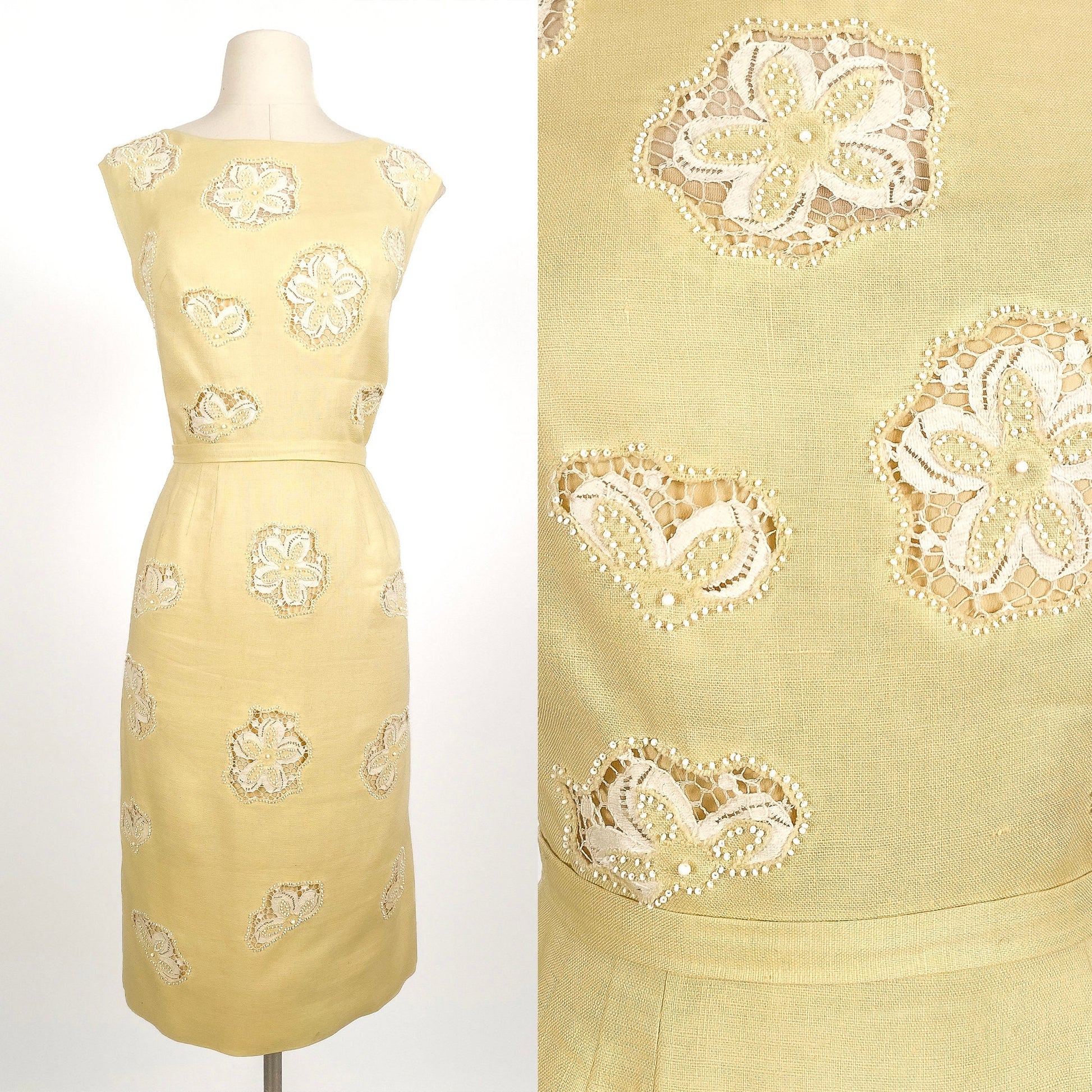 1950s Yellow Linen Dress with Beaded Lace and Beaded Inserts / Waist 30
