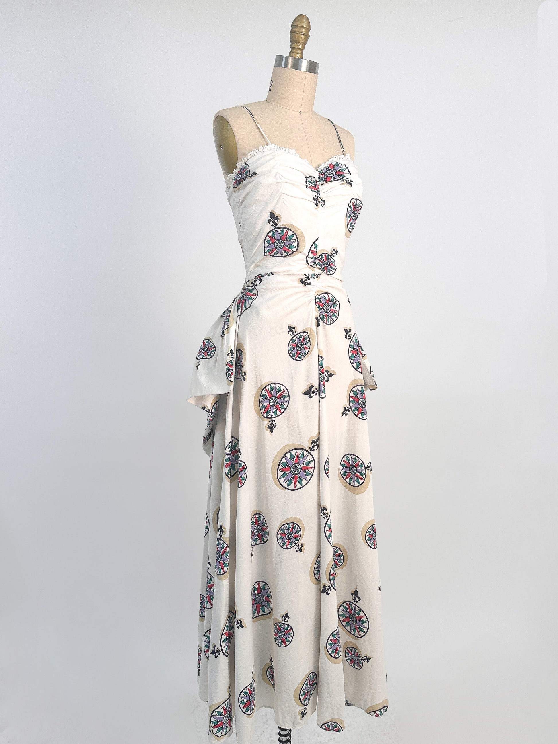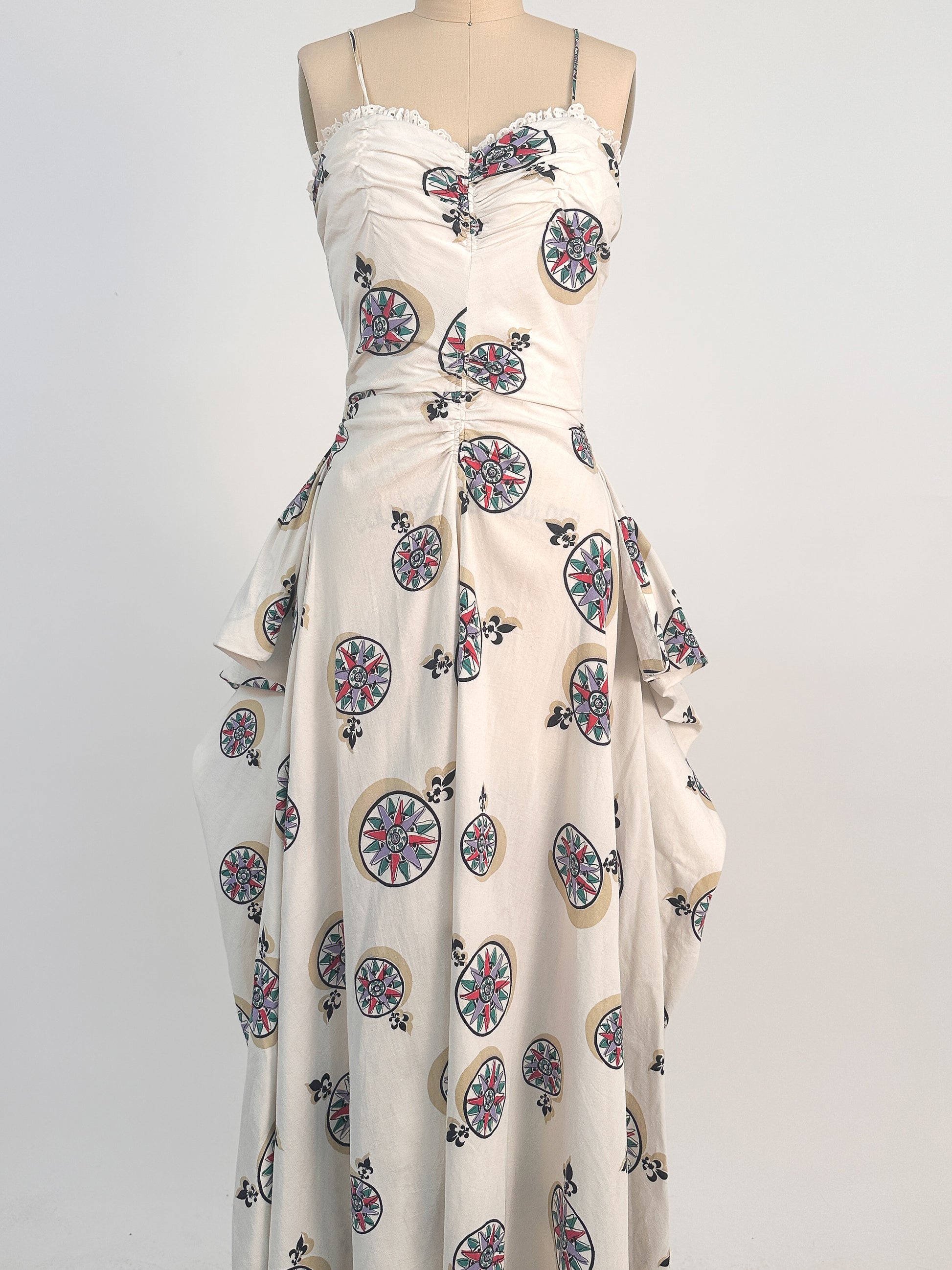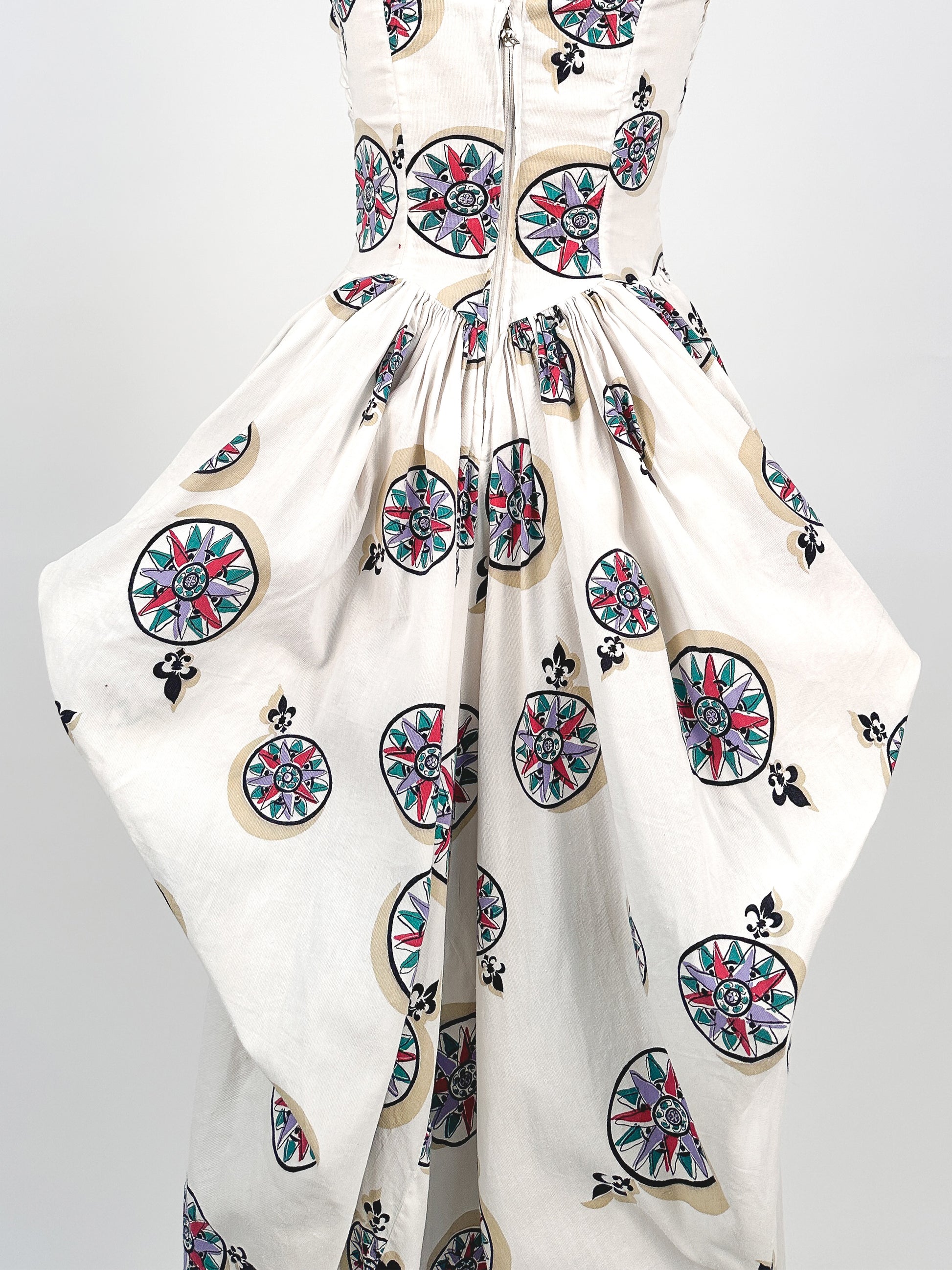 A marvelous 1940s white cotton novelty printed day dress with ruched sweetheart neckline and waistline. The bodice is trimmed in an eyelet lace and has thing straps. The print features fleur-de-lis and compass roses. Please note, the bodice is boned on front, sides and back. The sweeping skirt has lots of fabric with a beautiful added pleated bustle on the back. Metal zipper and hook/eye closure on the back.
