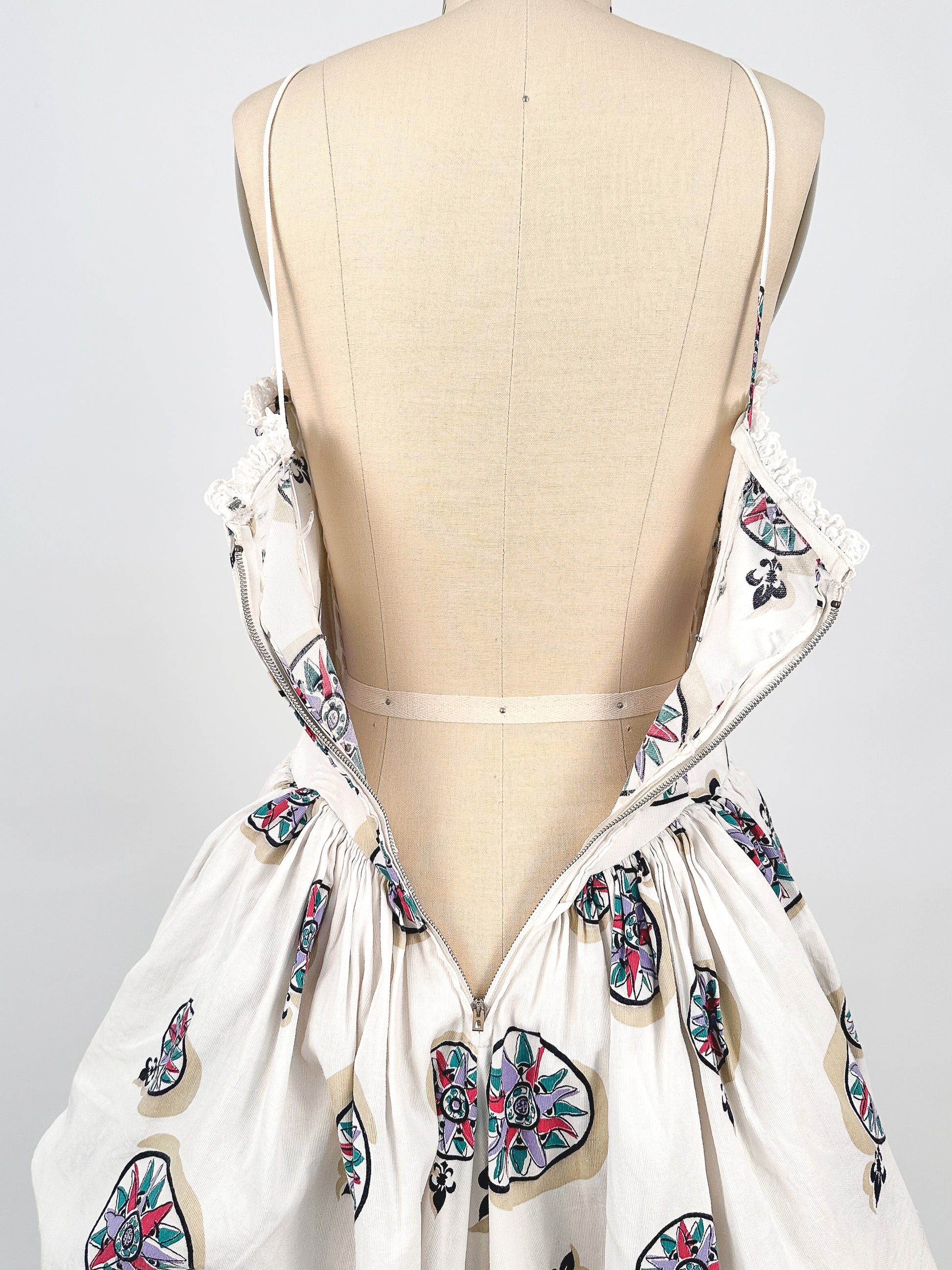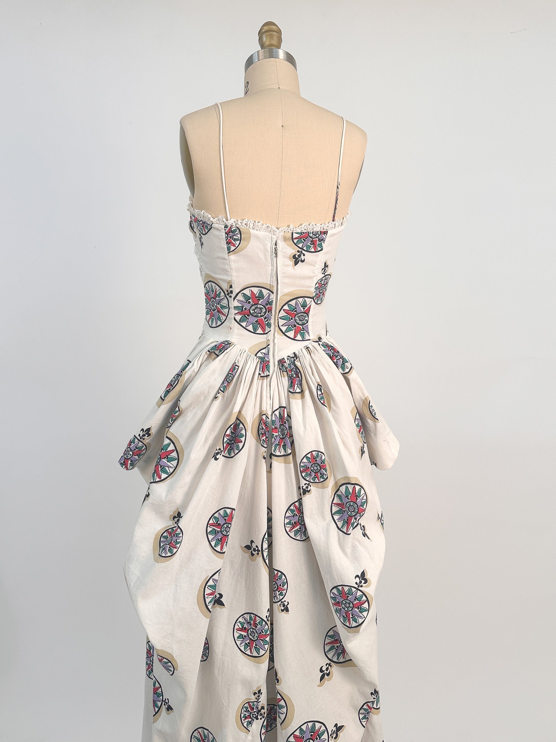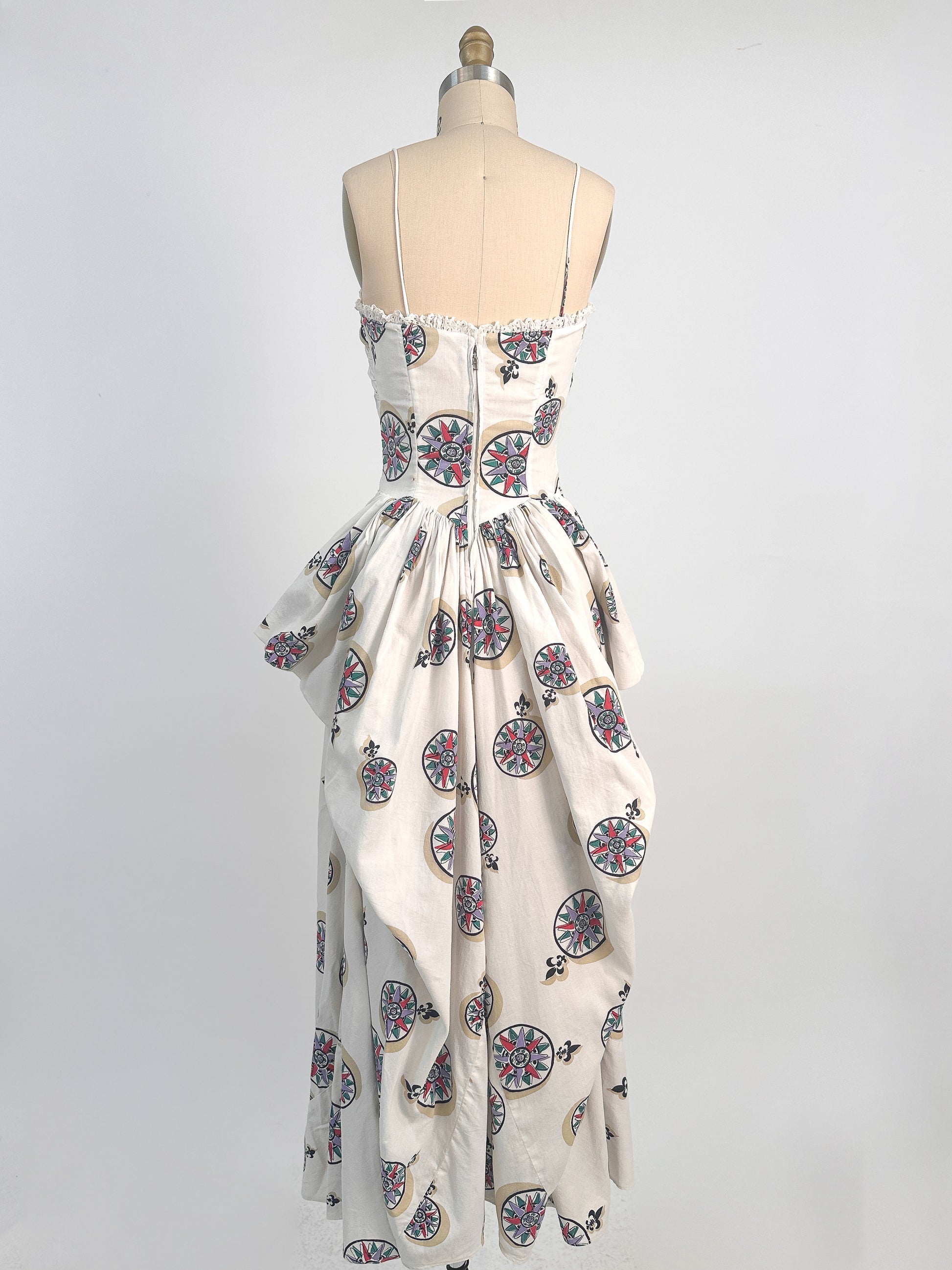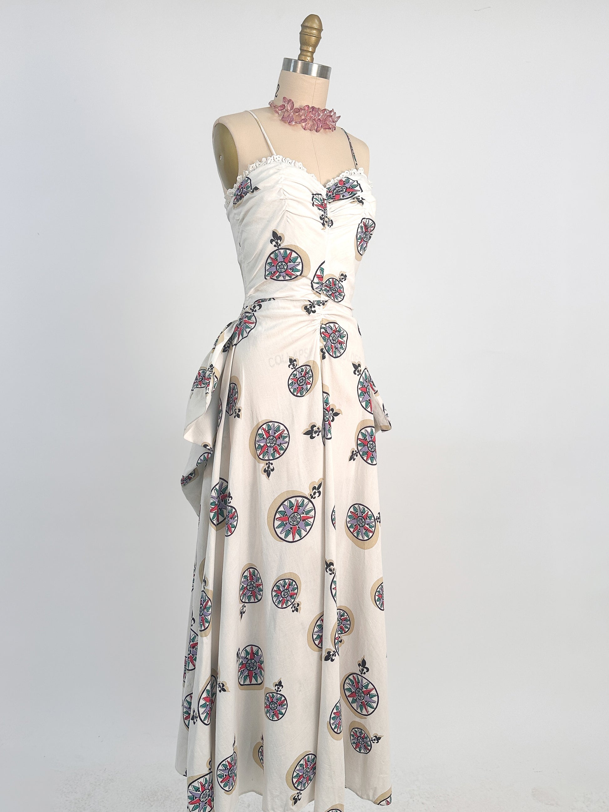 A marvelous 1940s white cotton novelty printed day dress with ruched sweetheart neckline and waistline. The bodice is trimmed in an eyelet lace and has thing straps. The print features fleur-de-lis and compass roses. Please note, the bodice is boned on front, sides and back. The sweeping skirt has lots of fabric with a beautiful added pleated bustle on the back. Metal zipper and hook/eye closure on the back.